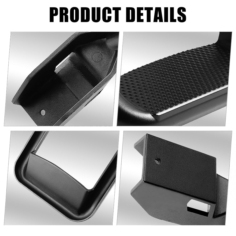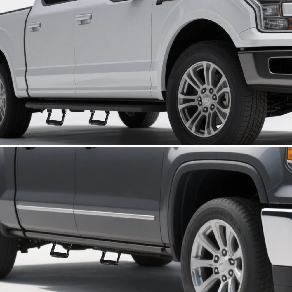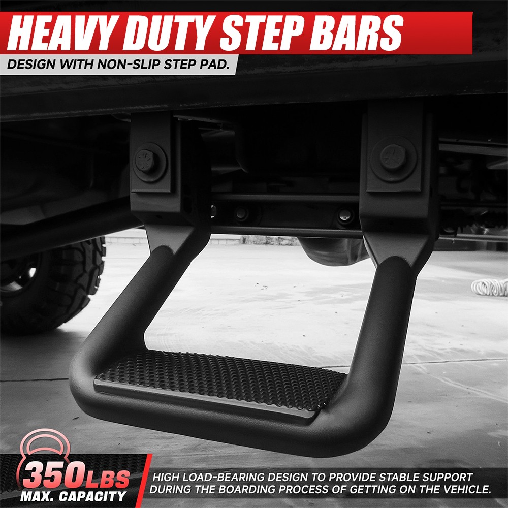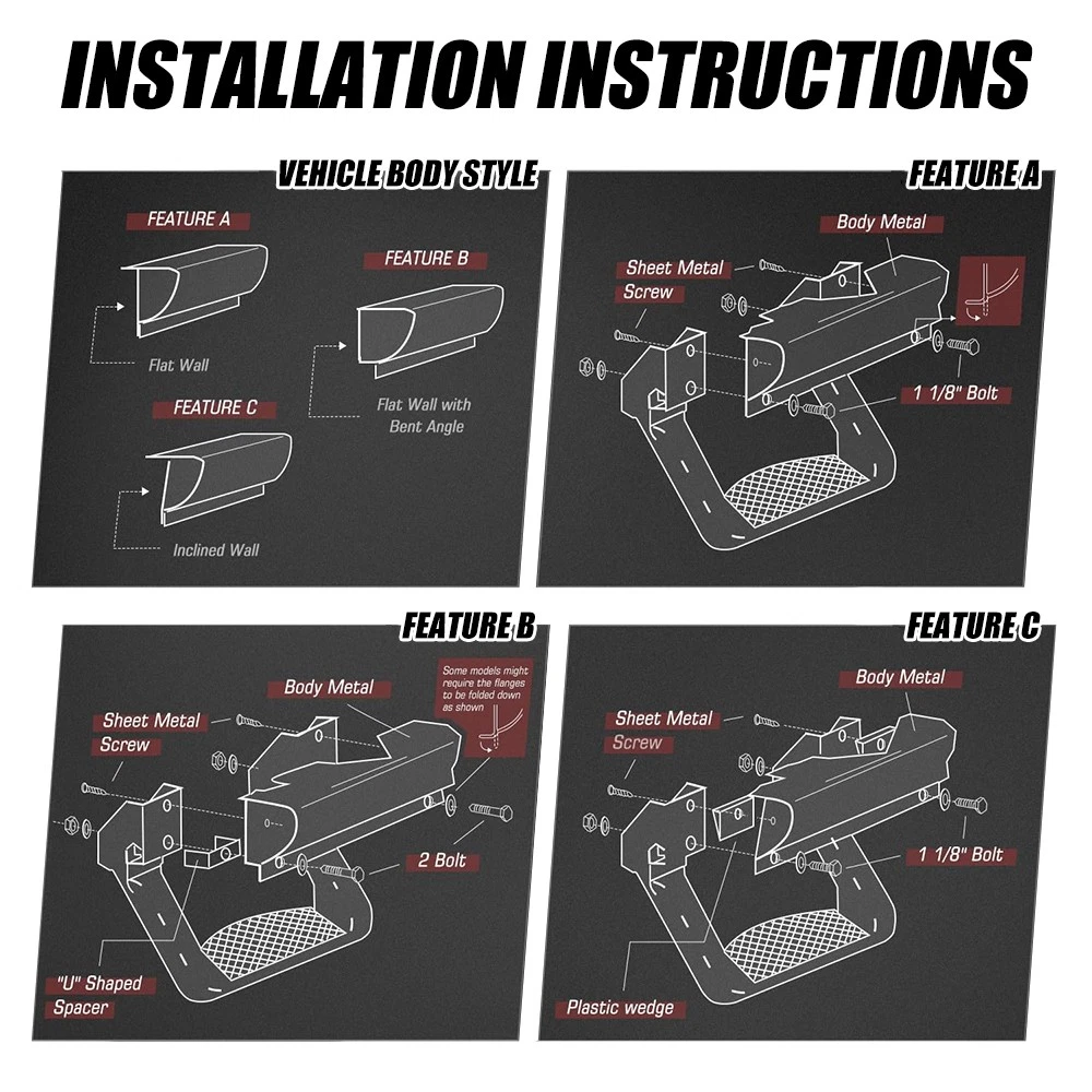 PAIR BLACK ALUMINUM FOR UNIVERSAL PICKUP TRUCK/SUV SIDE HOOP STEPS 11 in. L x 6 in. H x 12 in. W Include:The same as picture 1 x Pair of Side Steps Hoop(2pcs side steps), both the driver's and passenger's side Includes all Hardware Details: 1 Inch Diameter Stirrup Side Steps Mount to Trucks or SUVs Design with Non-Slip Step Pad, Strong, Lightweight and Paintable Die-Cast Aluminum Brackets, Solid Mount Heavy-duty aluminum construction with anti-corrosion powder coating Universal Fit / OEM Fit Matte Black / Anti-Rust Drilling Required: Vehicle must have a structurally sound rocker panel to mount step,the minimum to mount to a flat rocker panel will be 3.25". If using the lower mounting hole on the rocker pinch weld, you will still need the 3.25" above the pinch weld. Please check if it matches your vehicle type.