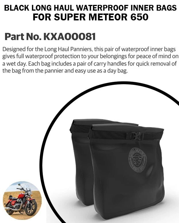 BLACK LONG HAUL WATERPROOF INNER BAGS FIT FOR ROYAL ENFIELD SUPER METEOR 650 - Express Shipping. WATERPROOF INNER BAG Designed to fit the Side Box, this waterproof roller bag will ensure your items are protected from the elements. It has a single strap that doubles as a carry handle and has subtle Royal Enfield. Product Info: Product Type : BLACK LONG HAUL WATERPROOF INNER BAGS Fit To Make : SUPER METEOR 650 Color : Black Placement on Vehicle : Rear Manufacture Part Number : KXA00081 Return Policy : Return will be Accepted Only Manufacturing Defect we will not accept return Encase of Fitment issue Shipments We do ship the items worldwide and it will take 7-8 days to reach final destination. If the item do not arrived and destination within this period so please contact us. We are not liable to pay any import duty or taxes, if the same charged by the customer?s country. If custom required in Buyer Country Buyer will be responsible to pay that Custom fee to clear the parcel, If buyer Denied refund will not be initiated in that case NOTE- Please make sure to provide your full address with your CORRECT contact phone number or mobile number to avoid Shipment delay due to insufficient address. Even Few shipment companies doesn't accept the PO Box address. So please try to give your complete address with Telephone number. Payments We accepted the payment through PayPal because it's easy way to online transaction. Feedback Leaving Negative or Neutral Feedback is not an easy solution of a problem,so please contact us if you have any questions or any complaints before leaving a Feedback, will assure you give a 100% solution. Your feedback is important for us to grow our business on eBay,so please do leave positive feedback. Our Guarantee & Timeline for Returns If you are not completely satisfied with your purchase, simply exchange it or return it to us for a refund within 7 days of the date of delivery. THANK YOU!!!