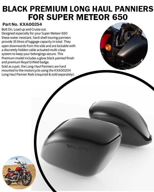 BLACK PREMIUM LONG HAUL PANNIERS LH & RH FIT FOR ROYAL ENFIELD SUPER METEOR 650 - Express Shipping. Designed especially for your Super Meteor 650 these water-resistant, hard-shell touring panniers provide 35 litres of luggage capacity in total. They open downwards from the side and are lockable with a discretely hidden cable actuated multi-clasp system to keep your belongings secure. Sold as a pair, the Long-Haul Panniers are hard mounted to the motorcycle using the KXA00204 Long Haul Pannier Rails (required & sold separately). Additional waterproof inner bags are available separately (KXA00081) to give full waterproof protection to your belongings and include carry handles for quick removal from the pannier and can be used as day bags. Info: Product Type - BLACK PREMIUM LONG HAUL PANNIERS LH & RH Fit To Make - SUPER METEOR 650 Color - Black Manufacturer Part Number - KXA00254 Return Policy : Return will be Accepted Only Manufacturing Defect we will not accept return Encase of Fitment issue Shipments We do ship the items worldwide and it will take 7-8 days to reach final destination. If the item do not arrived and destination within this period so please contact us. We are not liable to pay any import duty or taxes, if the same charged by the customer?s country. If custom required in Buyer Country Buyer will be responsible to pay that Custom fee to clear the parcel, If buyer Denied refund will not be initiated in that case NOTE- Please make sure to provide your full address with your CORRECT contact phone number or mobile number to avoid Shipment delay due to insufficient address. Even Few shipment companies doesn't accept the PO Box address. So please try to give your complete address with Telephone number. Payments We accepted the payment through PayPal because it's easy way to online transaction. Feedback Leaving Negative or Neutral Feedback is not an easy solution of a problem,so please contact us if you have any questions or any complaints before leaving a Feedback, will assure you give a 100% solution. Your feedback is important for us to grow our business on eBay,so please do leave positive feedback. Our Guarantee & Timeline for Returns If you are not completely satisfied with your purchase, simply exchange it or return it to us for a refund within 7 days of the date of delivery. THANK YOU!!!