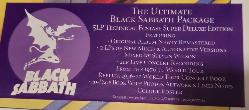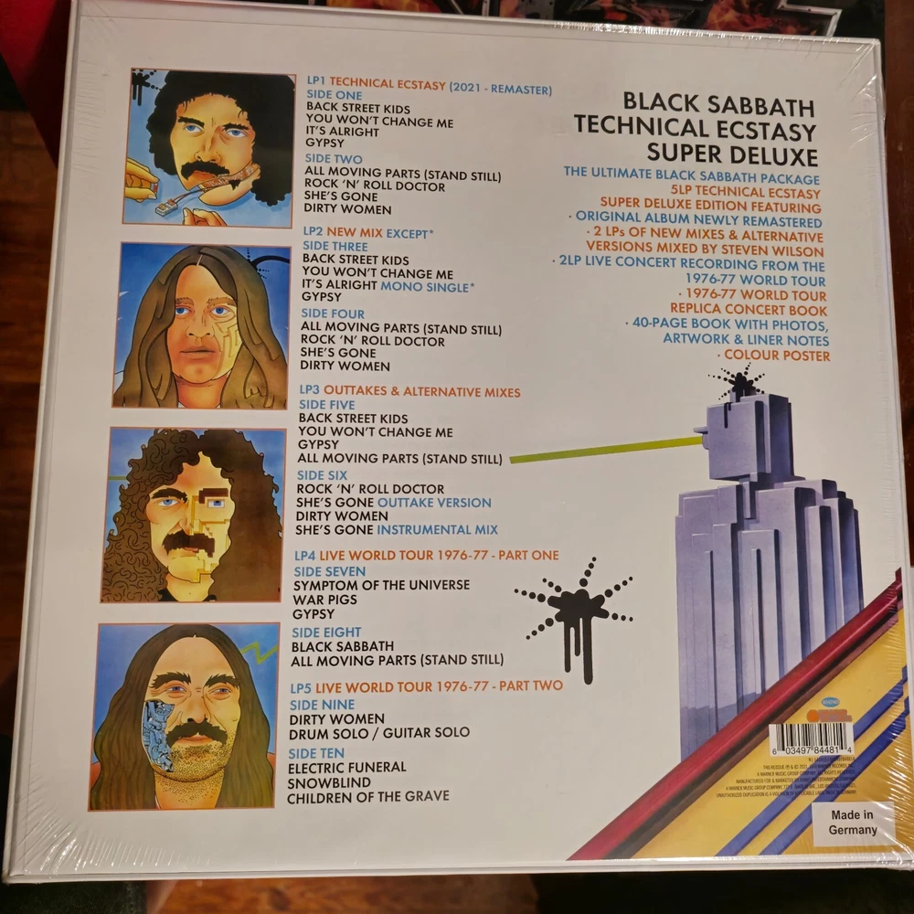 Up for sale is a SEALED 5-LP Vinyl Super Deluxe Boxset from the Godfathers of Heavy Metal, Birmingham, England's Black Sabbath! This is a 2021 Remastered / Reissue of the band's 1976 release, their 7th album. This set is UNOPENED so I don't have pictures of the inside however the hype sticker on the cover boasts a lot for a metal fan: The Ultimate Black Sabbath Package, 5LP Technical Ecstasy Super Deluxe Edition Featuring: • Original Album Newly Remastered • 2 LPs Of New Mixes & Alternative Versions Mixed By Steven Wilson • 2LP Live Concert Recording From The 1976-77 World Tour • Replica 1976-77 World Tour Concert Book • 40-Page Book With Photos, Artwork & Liner Notes • Colour Poster Though I am a huge Black Sabbath fan, I really don't collect many LPs instead opting for CD's so I feel this set would be a welcome item to a vinyl collector! Please see the full tracklist below and feel free to message me with any item specific questions, I am not accepting best offers. Thank you, Randy At HeavyDreams! LP1: Technical Ecstasy (2021 - Remaster) Side One: Back Street Kids You Won't Change me It's Alright Gypsy Side Two: All Moving Parts (Stand Still) Rock 'N' Roll Doctor She's Gone Dirty Women LP2: New Mix (Except *) Side Three: Back Street Kids You Won't Change Me It's Alright (Mono Single*) Gypsy Side Four: All Moving Parts (Stand Still) Rock 'N' Roll Doctor She's Gone Dirty Women LP3: Outtakes & Alternative Mixes Side Five: Back Street Kids You Won't Change Me Gypsy All Moving Parts (Stand Still) Side Six: Rock 'N' Roll Doctor She's Gone (Outtake Version) Dirty Women She's Gone (Instrumental Mix) LP4: Live World Tour 1976-77 - Part One Side Seven: Symptom Of The Universe (Live) War Pigs (Live) Gypsy (Live) Side Eight: Black Sabbath (Live) All Moving Parts (Stand Still) (Live) LP5: Live World Tour 1976-77 - Part Two Side Nine: Dirty Women (Live) Drum Solo / Guitar Solo (Live) Side Ten: Electric Funeral (Live) Snowblind (Live) Children Of The Grave (Live)