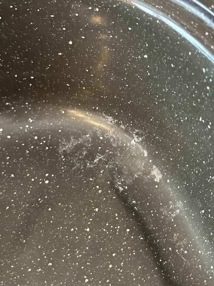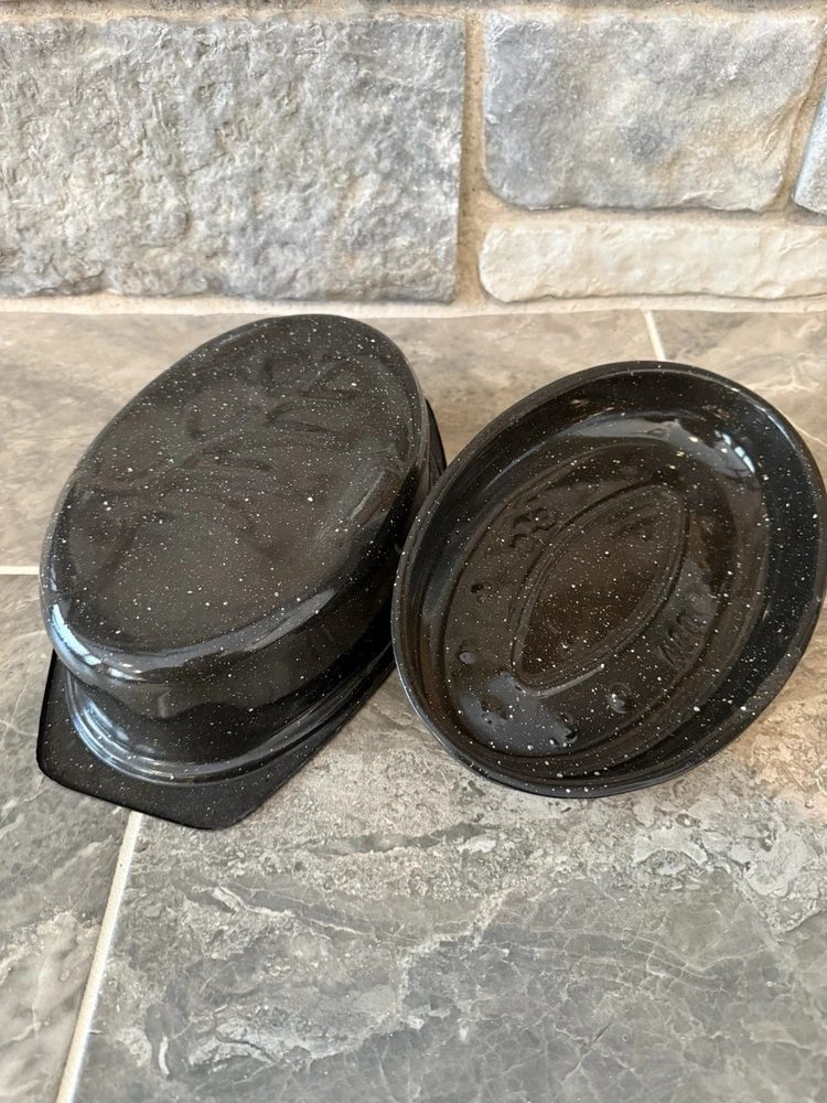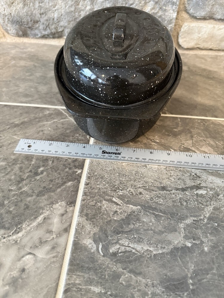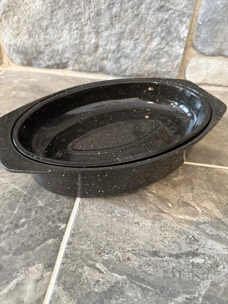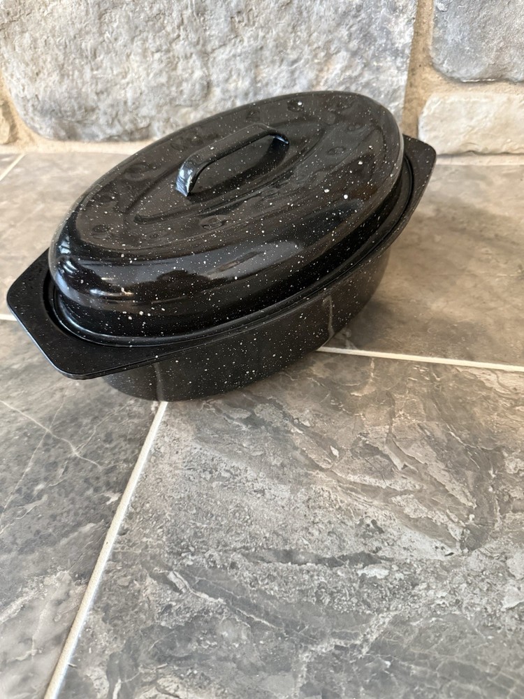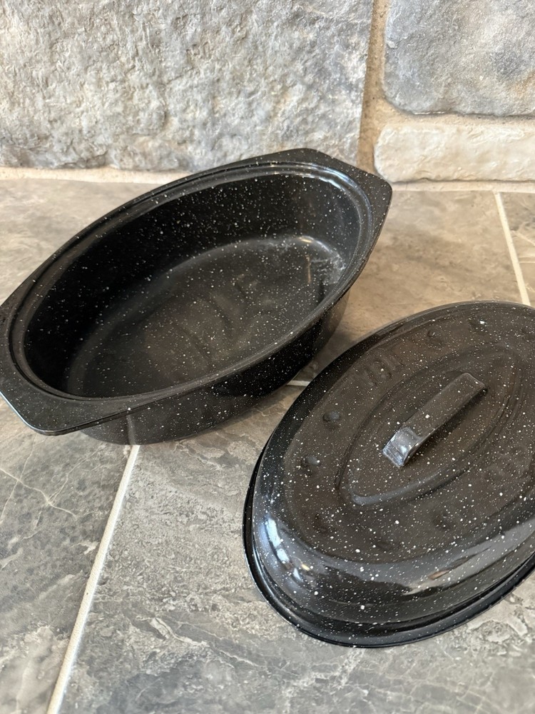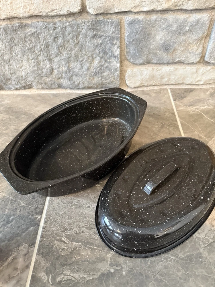 This vintage-inspired black speckled enamelware oval roasting pan with lid is a stylish and practical addition to any kitchen. With a capacity of 5-7 pounds, this two-piece set includes a stockpot and features a non-stick surface coating for easy cooking and cleaning. The 13" long roaster is perfect for roasting meats and vegetables in the oven, whether it's electric or gas. The lid helps to retain heat and moisture, making it ideal for slow cooking and serving dishes like prime rib or chicken. Has one stain on one side of the pan and some chips. Otherwise, in good condition.