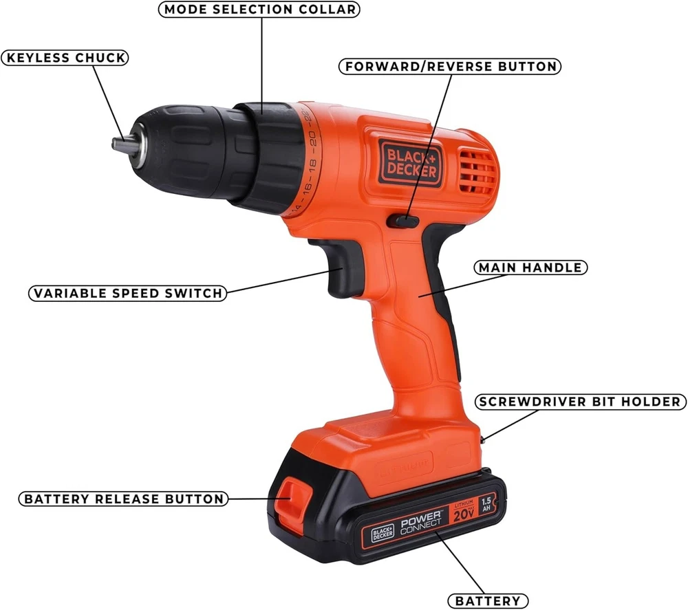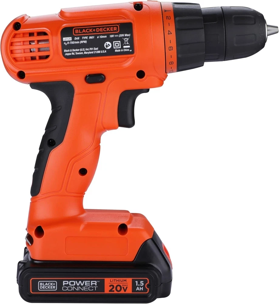 BLACK+DECKER 20V MAX POWERECONNECT Cordless Drill/Driver + 30 Piece Bits and Drivers Kit (LD120VA) VERSATILE 30 PC. SET – Includes a wide variety of bits and accessories for drilling and driving tasks. CORDLESS DRILL/DRIVER – Compact, lightweight design for versatile use. 24-POSITION CLUTCH – Prevents stripping and overdriving screws for added control. SOFT-GRIP HANDLE – Ergonomic design for extra comfort. POWERCONNECT BATTERY SYSTEM – Interchangeable battery system means you can use one battery for multiple different tools. INCLUDES – LD120 20V MAX lithium drill/driver, (1) LB20 20V MAX* lithium ion battery, (1) LCS20 charger, (6) brad point drill bits, (10) 1 in. screwdriving bits, (9) 2 in. screwdriving bits, (4) nut drivers, (1) magnetic bit tip holder.