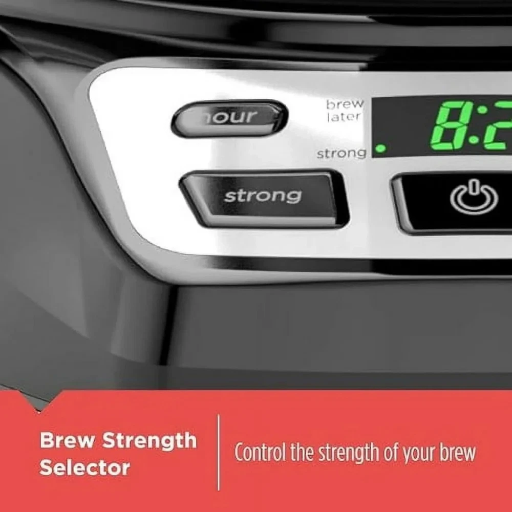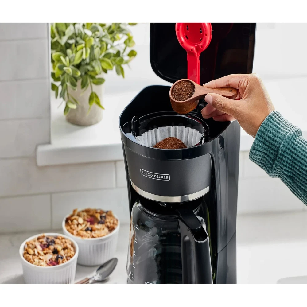 Start your day right with the BLACK+DECKER 12-Cup Programmable Coffeemaker, designed for convenience and consistent flavor. With QuickTouch™ controls and a 24-hour auto-brew timer, you can wake up every morning to the delicious smell of fresh coffee. The VORTEX showerhead technology ensures grounds are evenly saturated for a rich, balanced taste in every pot. Choose your strength with the brew selector, or grab a quick cup mid-brew with Sneak-A-Cup™. That, plus the large glass carafe, easy-to-clean removable filter basket, and automatic shut-off make this coffeemaker as reliable as it is convenient. 12-cup glass carafe: Brew a full pot for family, guests, or just extra cups throughout the morning. Programmable brewing: Set the 24-hour auto brew so coffee is ready when you wake up. Strength selector: Choose between regular or strong brew to match your flavour preference. Sneak-A-Cup™: Pause the cycle to pour your first cup without spills or drips. Even flavor extraction: VORTEX showerhead saturates grounds thoroughly for rich, balanced coffee. Easy cleanup: Dishwasher-safe carafe and removable brew basket with permanent filter. Keep warm plate: Maintains optimal temperature for up to two hours. Auto shut-off: Peace of mind with automatic power-down after the keep warm cycle.