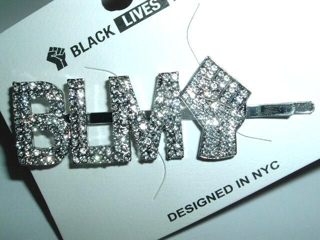 A sparkling silvertone bobby pin with "BLM" in tiny white rhinestones with a fist at the end. Measures 3" long, 1" tall, never worn and still in original BLM package.