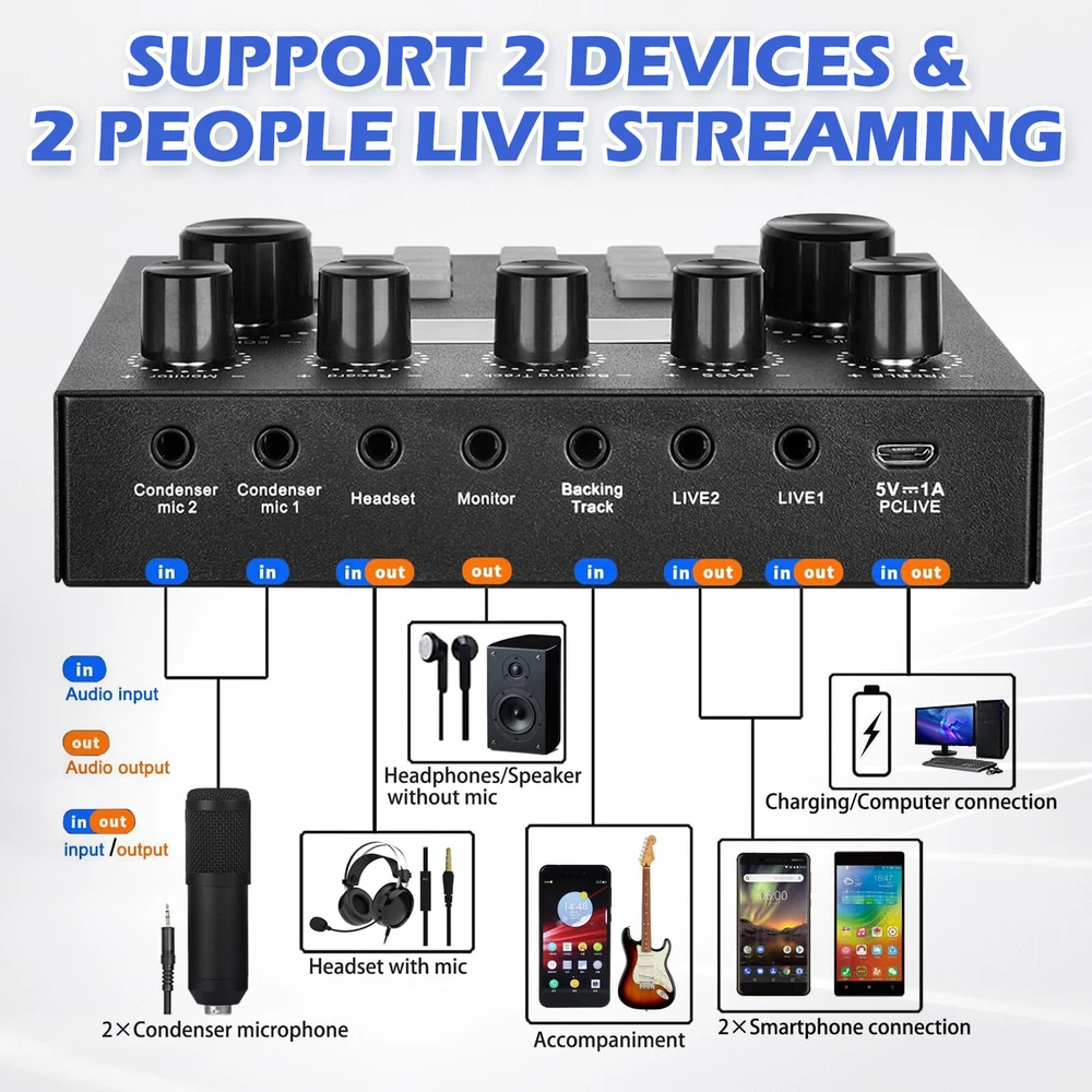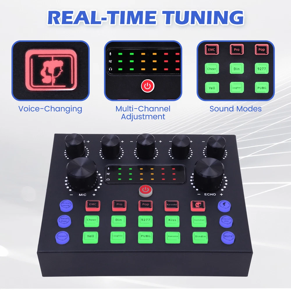 Size: 130*106*26mm Dynamic Range 1kHz: ≧105dB Type15: microphone for singing Condenser Mic Input: 2 way (3.5 port) OTG interface: 1 way (TYPE-C port) Type8: podcast equipment Color: Black UPC: Does Not Apply Sound effect keys: 7 Type11: wireless microphones Power supply (adapter): DC 5V/1A Type10: usb condenser microphone Power indicator (LED): Power on: white light; Charging: red light; Low Power Indication: Yes Sound Adjustment: Yes Type14: gaming microphone Headphone Output: 1 way (3.5 port) Type9: studio condenser microphone Sound card function: Yes Type7: music studio equipment Type1: studio microphone Type2: recording studio equipment Charging time: 2 hours Type3: podcast studio kit Function keys: 5 Material: Metal + Plastic gtin13: Does Not Apply Type13: bluetooth microphone Type6: recording microphone Output Level(Vrms): Vrms(1.0~2.0V 10kR) Suitable For: Studio Recording Battery: 3.7V / 800 mah Battery life: 5 hours Form Factor: Condenser Microphone Connector Type: TYPE-C Special effects keys: 10 Analog Audio Output: LT/RT, Stereo Signal-to-Noise Ratio: ≧85dB Live broadcast interface: 2 way (3.5 port) Type5: podcast microphone Type12: karaoke microphone Accompaniment input: 1 way (3.5 port) Type4: podcast equipment bundle Built-in battery: Yes Brand: Newbeegoods Crosstalk: ≧-106dB