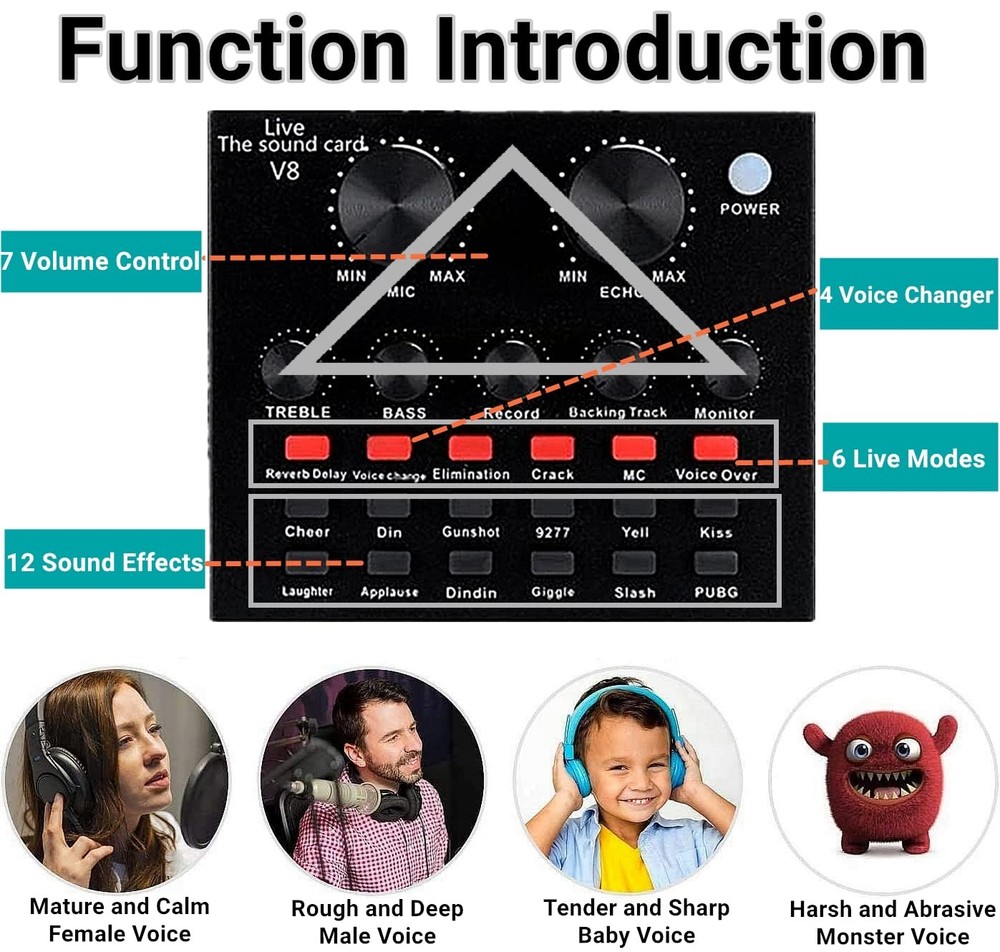 Why Customers Choose This Condenser Microphone Bundle: * Low Noise - The BM-800 features extremely quiet self-noise, In technical terms: a noise level of just 16 dB(A). Thus, it is perfectly suited for vocals and audio drama productions in high definition as well as for demanding samples production and instrumental recordings * Stability - The BM-800 shock mount's spider suspension isolates your studio microphone from handling and floor noise by decoupling it from the rest of your room. This results in clearer recordings with less unwanted low-frequency artifacts. The BM-800 shockmount accommodates microphones from 55mm to 60mm in diameter. It screws into any standard mic stand * Application – Great in both Vocal and Instruments, wide frequency response makes it an ideal mic to capture vocals, acoustic guitars, acoustic pianos and even strings as the condenser is able to take an accurate snapshot and capture all the subtleties and nuances inherent in these instruments *Professional team service For any questions you are welcome to at any time. Specification: Frequency range: 20 to 20,000 Hz Sensitivity: -34 dB±2 dB (0 dB=1V/Pa at 1kHz) Max. SPL: 132 dB (at 1kHz≤1% T.H.D) Equivalent noise level: 16 dB-A Signal/noise ratio: 78 dB Recommended load impedance: >= 1000 ohms Connector: 3-pin XLR to IEC Cable Length: 8.2 ft/2.5M Package inclued: 1 x Live sound card 1 x BM-800 microphone 1 x Shock mount 1 x Pop filter 1 x Mic adjustable suspension scissor arm stand 1 x Anti-wind foam Cap 1 x Power cable 2 x audio cable 🔥【Professional Podcast Equipment Bundle】- The Podcast Equipment Bundle is equipped with BM-800 microphone, Shock mount, Pop filter, Mic adjustable suspension scissor arm stand, Anti-wind foam Cap, Power cable, Live sound card. This professional studio equipment was designed for podcasting, streaming and recording music and short video. What you get is a complete set of professional podcast equipment bundle. One set can meet all your needs and you don’t need to buy other equipment again. 🔥【Excellent Sound Quality】- The condenser microphone bundle has been designed with 2021 professional sound chipset, which lets the microphone hold a 120kHz sample rate and 24-bit bitrate, ensuring your voice is captured in high detail. The cardioid pickup pattern offers pristine and accurate capture, which is more suitable for recording podcasts, vocals and other voice works. The condenser microphone records the sound source in front of the microphone directly and provides a rich, mellow sound. 🔥【High Compatibility】- The podcast equipment bundle is not only fully compatible with most mainstream operating systems such as Windows and Mac OS, but also compatible with smartphones (Android and IOS), even connect to two mobile phones to livestream on both streaming platforms at the same time. It meets the use of all scenarios: Gaming, Live Streaming, Podcasting, Voice Over, Recording Music, Live and Sing, take video on TikTok, YouTube, etc. 🔥【Plug and Play, Easy To Use】- This live sound card with multiple sound effects can be used on any mobile , computer, and Any game platform. No need extra driver software. You can connect to different devices (computer/ mobile / laptop) by using different connection methods. You can even connect with two mobile phones to livestream on both streaming platforms at the same time. The podcast equipment bundle will bring more fun to you and make your recording more creative. 🔥【100% CUSTOMER SATISFACTION 】- We are a company dedicated to the research and development of music recording equipment, we provide 12 months , and 40 days no reason to return, if you have any questions in the process of use, please in time, we will solve any problems for you within 12 hours.