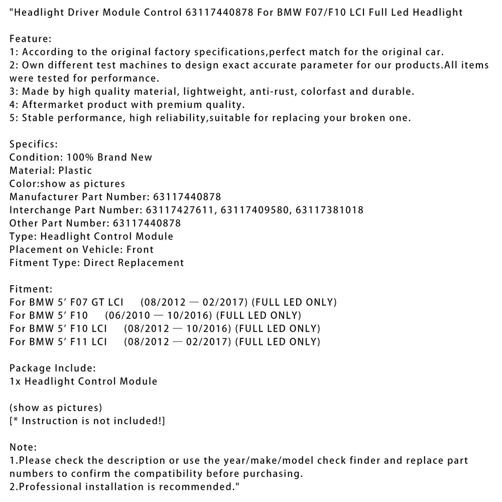 Magneto Stator + Voltage Rectifier + Gasket For BMW G310 G310GS G310R 2016-2023 119.99 USD Free shipping Stator 18 Pole For Honda TRX300 TRX300FW Fourtrax 300 2WD 4WD 1988-2000 80.79 USD Free shipping Pulsing Electrical Coil AM105573 AUC15118 For John Deere 325 335 345 425 445 455 21.87 USD Free shipping Heat/Cool Digital Thermostat Replacement Compatible with Coleman 83303362 White 47.79 USD Free shipping Engine Variable Valve Timing VVT Oil Control Valve For BMW 11368617694 31.87 USD Free shipping Ignition Switch Fuel Gas Cap Keys for Suzuki Intruder VS700 VS750 VS800 VS1400 70.87 USD Free shipping Front Floorboard Footboard For Honda VTX 1800 1300 Suzuki VL800 VL400 C50 U.S 50.87 USD Free shipping 6T40 6T45 6T30 6T50Gearbox Transmission Solenoids For CHEVOLET BUICK Valve BodyB 205.87 USD Free shipping Carburetor Carb Rebuild Kit for Yamaha 40HP F40 45HP F45A 50HP F50 T50 62Y-W0093 20.7 USD 21.79 USD Free shipping 5% off CNC Aluminum Drag Race Lowering Link Kit For BMW S1000RR S1000R 2019-2023 Black 53.79 USD Free shipping Silent SSR Solid Hub Kit 8M0101603 8M0101601 For Mercury 19 Tooth 97.99 USD Free shipping Carburetor Carb Insulator Fit for Honda CR 125 R CR125R 1990-1995 16221-KZ4-700 18.79 USD Free shipping A Fantastic Shop Send us a message Our Store Seller Profile Feedbacks Save this seller Contact Headlight Driver Module Control 63117440878 For BMW F07/F10 LCI Full Led Headlight Driver Module Control 63117440878 For BMW F07/F10 LCI Full Led Headlight Feature: 1: According to the original factory specifications,perfect match for the original car. 2: Own different test machines to design exact accurate parameter for our products.All items were tested for performance. 3: Made by high quality material, lightweight, anti-rust, colorfast and durable. 4: Aftermarket product with premium quality. 5: Stable performance, high reliability,suitable for replacing your broken one. Specifics: Condition: 100% Brand New Material: Plastic Color:show as pictures Manufacturer Part Number: 63117440878 Interchange Part Number: 63117427611, 63117409580, 63117381018 Other Part Number: 63117440878 Type: Headlight Control Module Placement on Vehicle: Front Fitment Type: Direct Replacement Fitment: For BMW 5' F07 GT LCI (08/2012 — 02/2017) (FULL LED ONLY) For BMW 5' F10 (06/2010 — 10/2016) (FULL LED ONLY) For BMW 5' F10 LCI (08/2012 — 10/2016) (FULL LED ONLY) For BMW 5' F11 LCI (08/2012 — 02/2017) (FULL LED ONLY) Package Include: 1x Headlight Control Module (show as pictures) [* Instruction is not included!] Note: 1.Please check the description or use the year/make/model check finder and replace part numbers to confirm the compatibility before purchasing. 2.Professional installation is recommended. About US About Our Items We strive to describe all items accurately and thoroughly, with the utmost care and attention to detail. However, to ensure a mutually satisfactory transaction, we kindly ask for your assistance in thoroughly reviewing the item description and photos, and addressing any questions before placing a bid. Customer Satisfaction We stand behind our commitment with exceptional service, a 100% money-back guarantee, and a dedication to customer satisfaction. I am readily available to address any inquiries or concerns you may have, both before and after your purchase. Our aim is to ensure your shopping experience is enjoyable and that you're delighted with your purchase. Feedback Your feedback is crucial to our business's success. If you're satisfied with your purchase and the service you received, we would greatly appreciate your positive feedback, along with an overall Detailed Selling Rating (DSR) of 5. Please take a moment to leave us positive feedback. Our eBay account is set up to automatically reciprocate positive feedback once yours is received. If you're considering leaving neutral/negative feedback or opening an eBay/PayPal case, we encourage you to reach out to us immediately. We're committed to resolving any issues to the best of our ability. Shipping Parcel will be shipped using Standard shipping method. For security purposes, items will be shipped exclusively to the confirmed address on Paypal. Please ensure your Shipping address is up to date before proceeding with payment. Estimated delivery time within the United States ranges from 3 to 10 business days, depending on your location. Returns We accept returns within 60 days from the date the buyer receives the item. If the item is found to be defective upon receipt, the customer has up to 30 days from the date of receipt to request an exchange for a new item or a refund. For returns due to a change of mind, we accept items in their original selling condition. However, if the package has been opened due to a mistaken order, it does not qualify for our return policy. Please note that the buyer is responsible for covering the cost of return postage. If you encounter any issues, please reach out to us via eBay message, and we'll respond within 24 hours. Xenon Ballast HID D3S Bulb Lamp Control Unit 68170821AA For Chrysler 300 11-21 42.79 USD Free shipping Xenon Ballast Igniter&HID D2S Bulb Kit Computer Control BBM5510H3 Fits Mazda 3 6 46.79 USD Free shipping Pair Headlight Replacement Lens Cover Left&Right Smoke For C6 Corvette 2005-2013 77.39 USD Free shipping L+R Pair Upper Headlight Cover Strip Set Für BMW 3 E46 COUPE CABRIO LCI 48.79 USD Free shipping 2PCS Headlight Lens Replacement Black Trim Gaskets For 2005-2013 C6 CorvetteUSA 24.99 USD Free shipping Smoke Headlight Lens Replacement Covers Black Gaskets Kit For 05-13 C6 Corvette 88.73 USD Free shipping Headlight Bracket Set Left+Right 80A805608 80A805607 For Audi Q5 SQ5 2018-2020 85.79 USD Free shipping 2x Xenon Ballast & D2S Bulb Kit Control Unit For Infiniti JX 35 QX 56 60 80 US 74.87 USD Free shipping Headlight Lens Shell Plastic Cover Left+Right For 2001-2007 Benz W203 C-Class 52.87 USD Free shipping D3R Xenon HID Headlight Ballast For Dodge 68224607AB Chevrolet 22