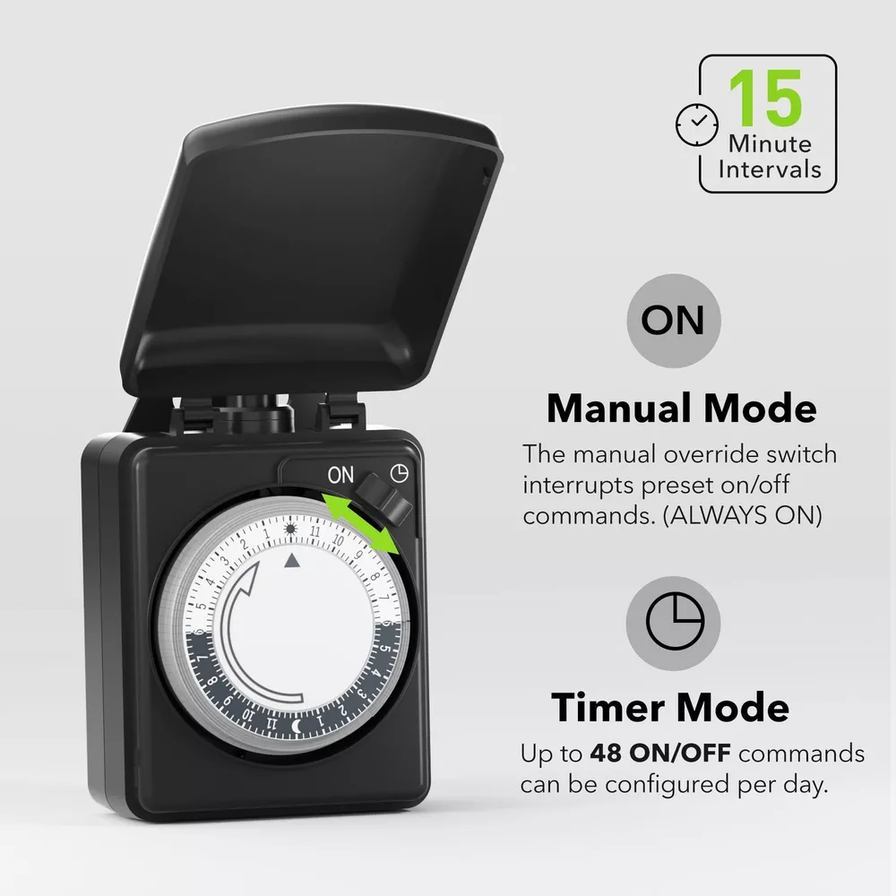 BN-LINK outdoor outlet timer will continue to function in extreme weather conditions. Perfect for your outdoor lights, pool pumps, fountains, and Christmas/ yard/patio/landscape/holiday lamps and other electric devices. Easy setting: Turn the timer dial to the current time. Push all the pins down for the run time, and pull other pins up for the off-time. Set the manual override switch on Timer, then it will automatically turn on/off your appliance to save energy. Note: Compressors may affect the rating of your appliance when being used with our products. Please ensure the BTU/hr on your appliance is compatible with our product. Please refer to the application guide in the technical details. Programmable in 15 minute intervals with 48 setting options in a 24 hours period. Total 48 ON/OFF setting per day. Repeats schedule daily with personal setting. Waterproof for outdoor use: Cover provides protecting timer from weather conditions. Heavy duty material and two grounded outlet makes it safe and durable. Two 3-prong grounded outlets and 6.8 inch cord for use with devices like Christmas lights, fountain timers, patio and yard lights, as well as holiday decorations. (Not compatible with pool pumps) Simply press down all the pins for the range of time you would like your attached appliance to turn on. The programmed schedule will repeat every 24 hours, automatically turning on and off your device so you won't have to. Our outdoor dual 3-prong, grounded timer outlet is ETL listed, and conforms to UL Std. 917. Rate Voltage: 125V, 60Hz, 15A Max, 1875W Resistive or General Purpose, 8A Tungsten Lamp, 1/2HP, TV-5. Note: Compressors may affect the rating of your appliance when being used with our products. Please ensure the BTU/hr on your appliance is compatible with our product. Please refer to the application guide in the technical details.