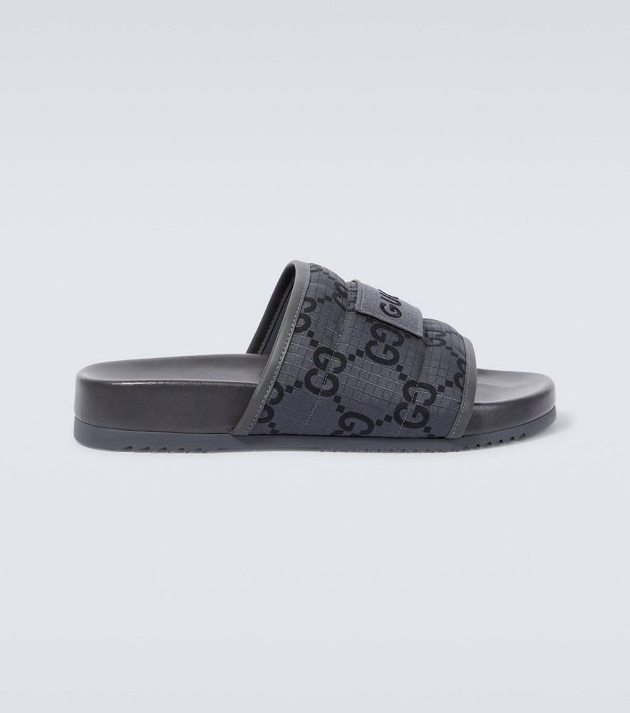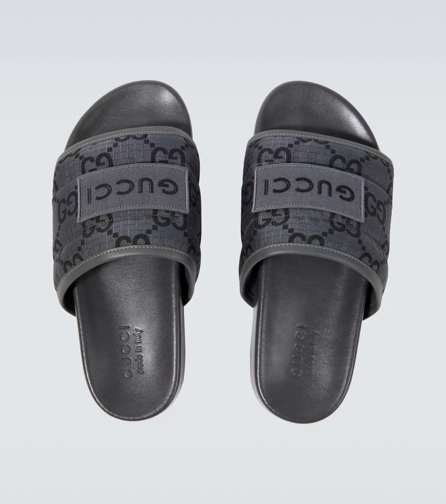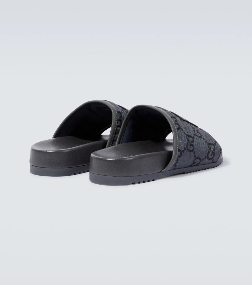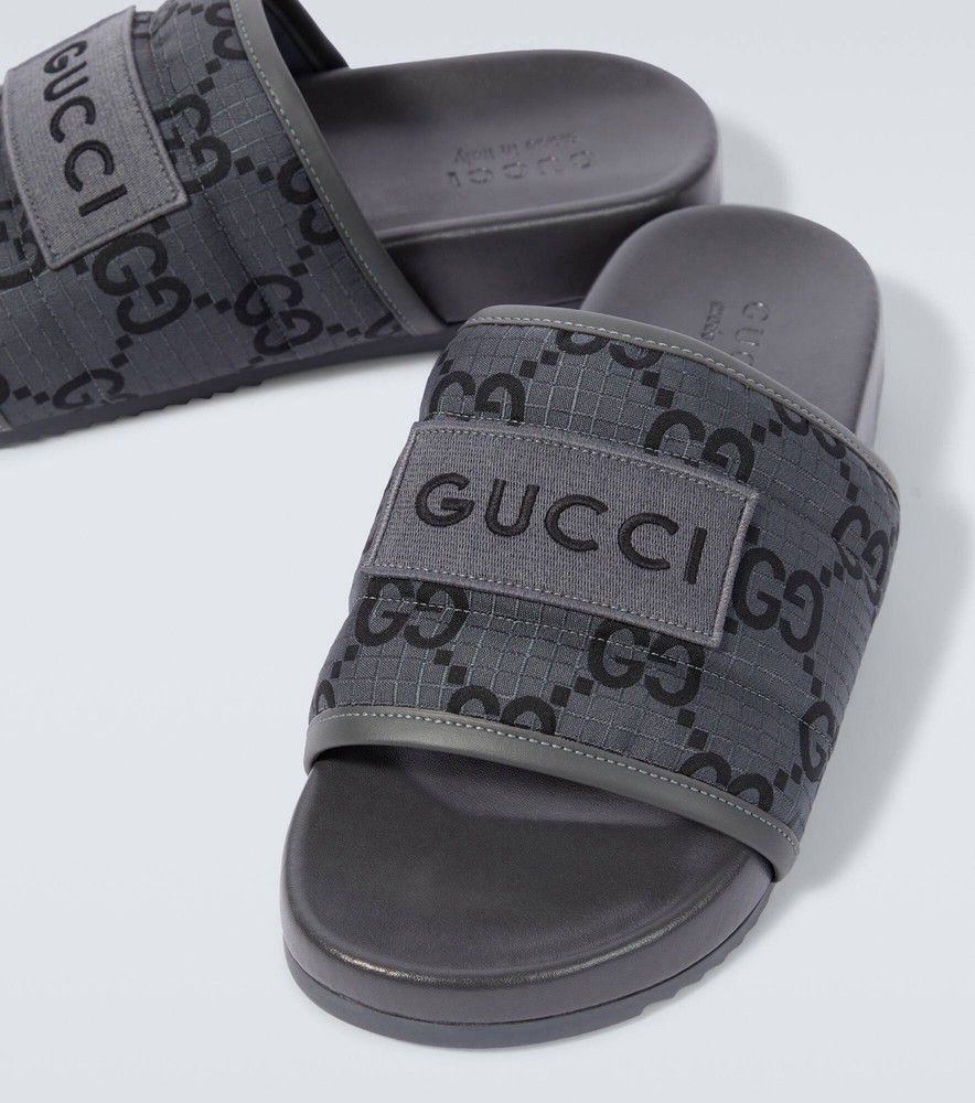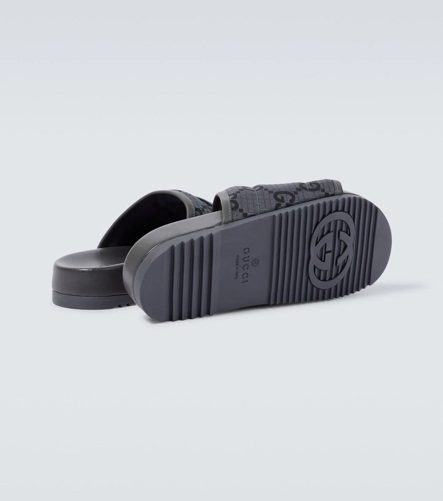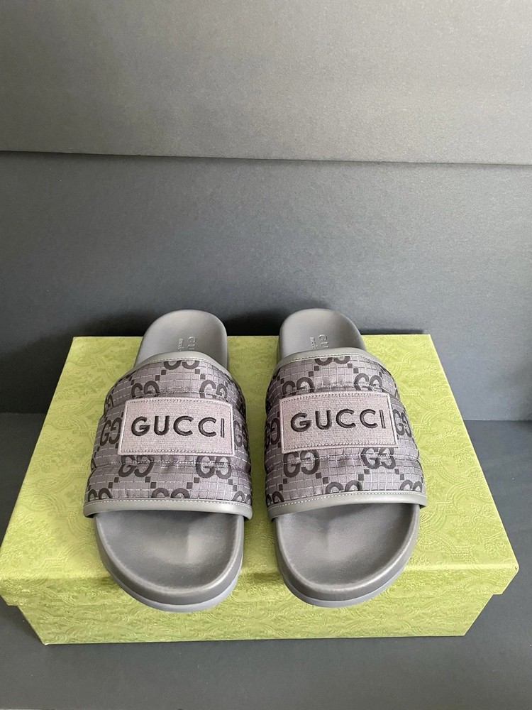 The product is a pair of BNWT Gucci Authentic Slide Sandals in GG Logo Gray, designed for men in size 6 (UK) or 6.5 (US). These slip-on sandals are ideal for casual occasions during the summer season. Made with PVC material and crafted in Italy, these sandals feature the iconic Gucci logo, adding a touch of luxury to your wardrobe. The stylish design and high-quality construction make these sandals a fashionable and practical choice for any man looking to elevate their shoe collection.