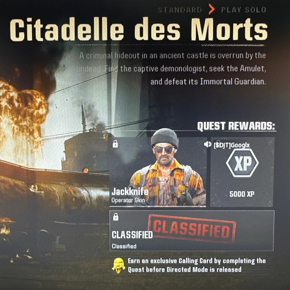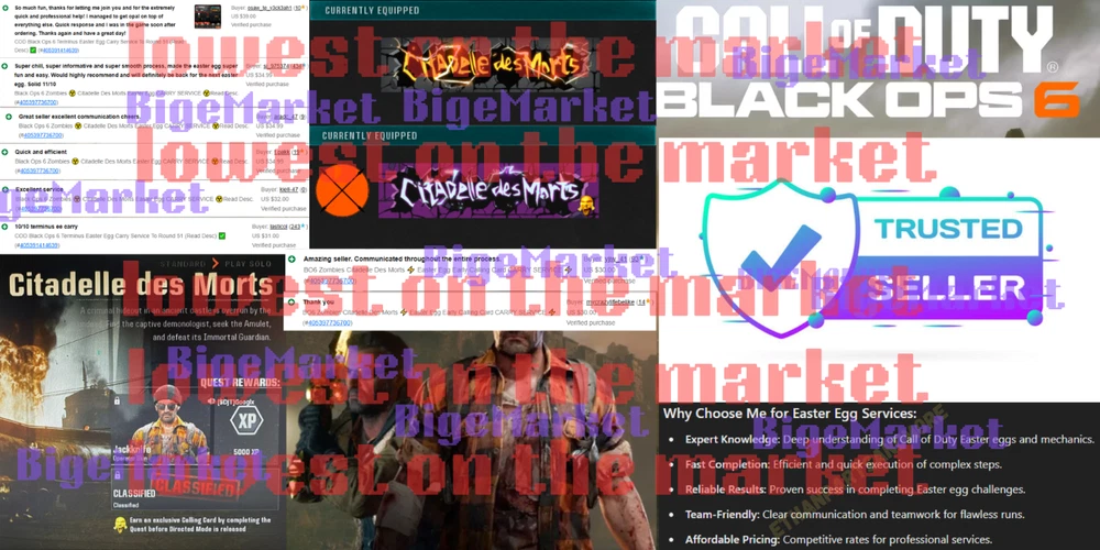 Carry Service for Citadelle Des Morts - DLC 1 Easter Egg Completion! (This Is A Service) Are you ready to conquer the new Call of Duty: Black Ops 6 Zombies map, Citadelle Des Morts ? Let me handle the Easter Egg while you enjoy the game and claim the exclusive rewards! 🎁 Rewards You’ll Unlock Exclusive “Jackknife” Operator Skin for Weaver 5,000 XP – Boost your progress effortlessly! Unique Animated Calling Card (Only obtainable by completing the Easter Egg before Directed Mode launches!) 🔥 What’s Included in This Service Guaranteed First-Try Completion! The entire Easter Egg completed for you – just relax and slay zombies! No skill level required! Perfect for new or experienced players. Flexible for parties of 1-3 players. Bring your friends for added fun! ✨ Why Choose Me? Over 20 successful completions in the past 3 days – I know this Easter Egg inside and out! Trusted and reliable service across all platforms – PlayStation, Xbox, and PC. Fast results: Get in ASAP and secure those exclusive rewards! Special discounts available for groups of 3 – just message me for details. 💬 How to Book Your Spot Send me a message now to secure your priority spot! Preorder Now – Be among the first to dominate the map and show off your rewards. Don't miss out on these limited-time exclusives! This is your chance to stand out in the Zombie community and unlock items others can only dream of. Let’s make it happen! ✅ Act now – limited slots available!