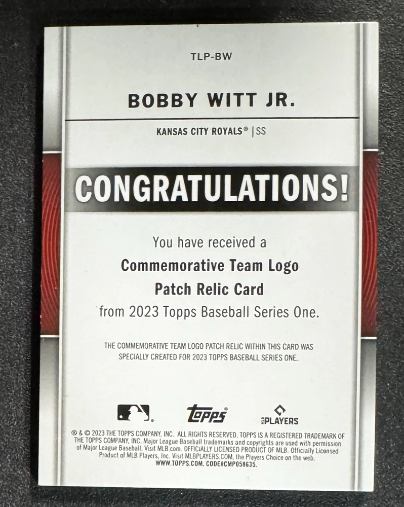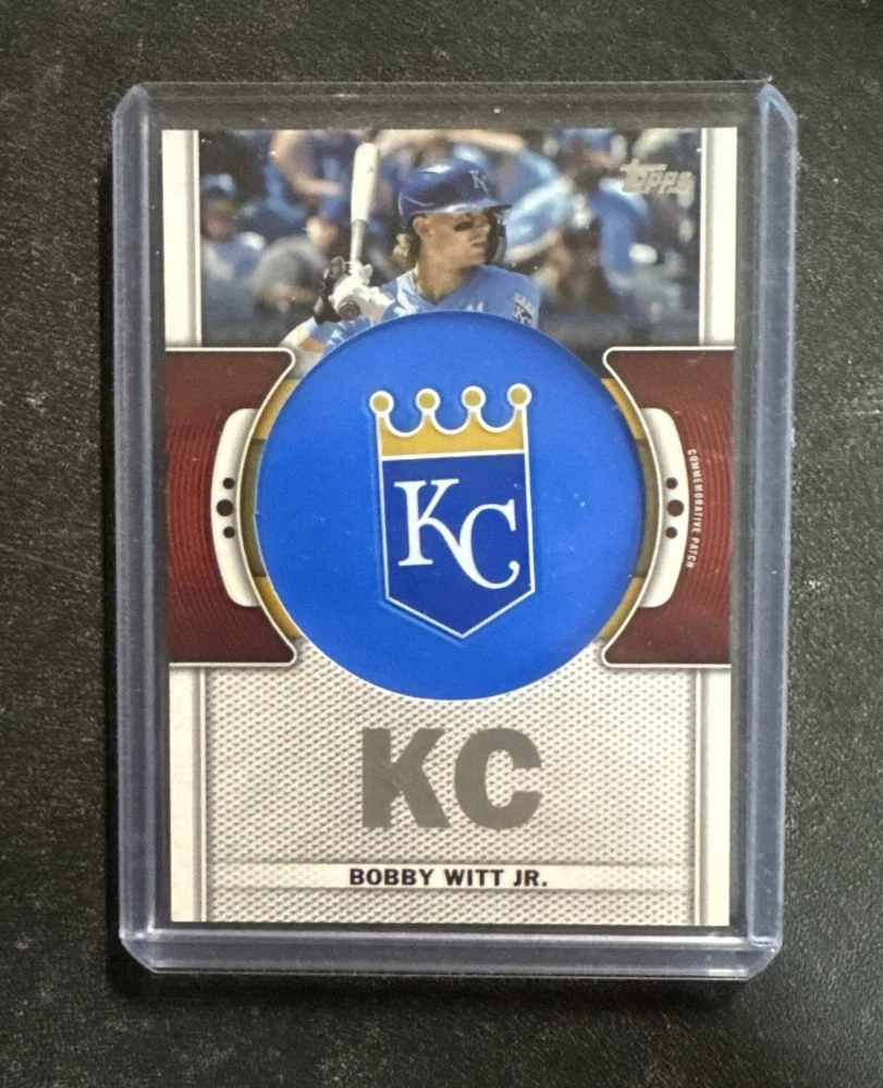 This is a 2023 Topps baseball trading card featuring Bobby Witt Jr. of the Kansas City Royals. The card is a single-insert from the Series 1 set, with a team logo patch as a special parallel variety. It is made of 20 Pt. card stock in English language and is an original product manufactured by Topps in the United States. This card falls under the modern era of sports trading cards and does not come with an autograph or grading.