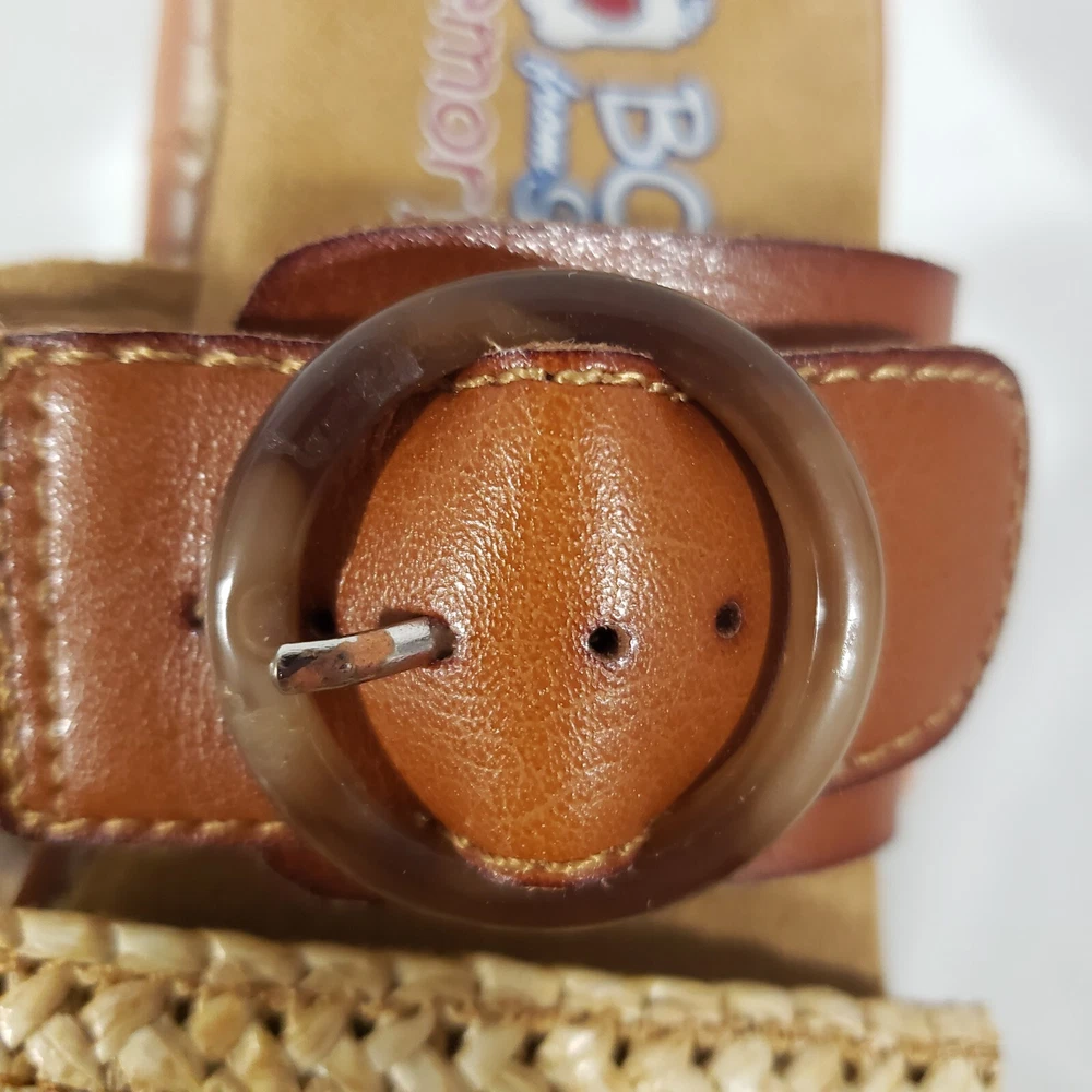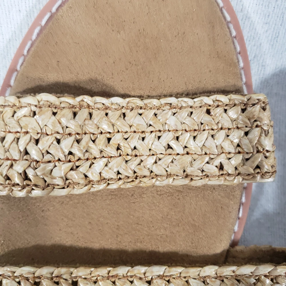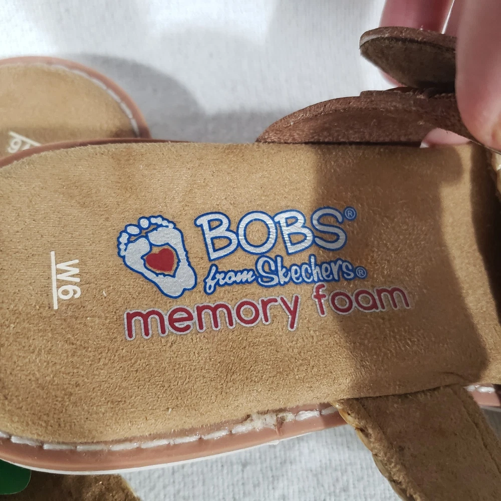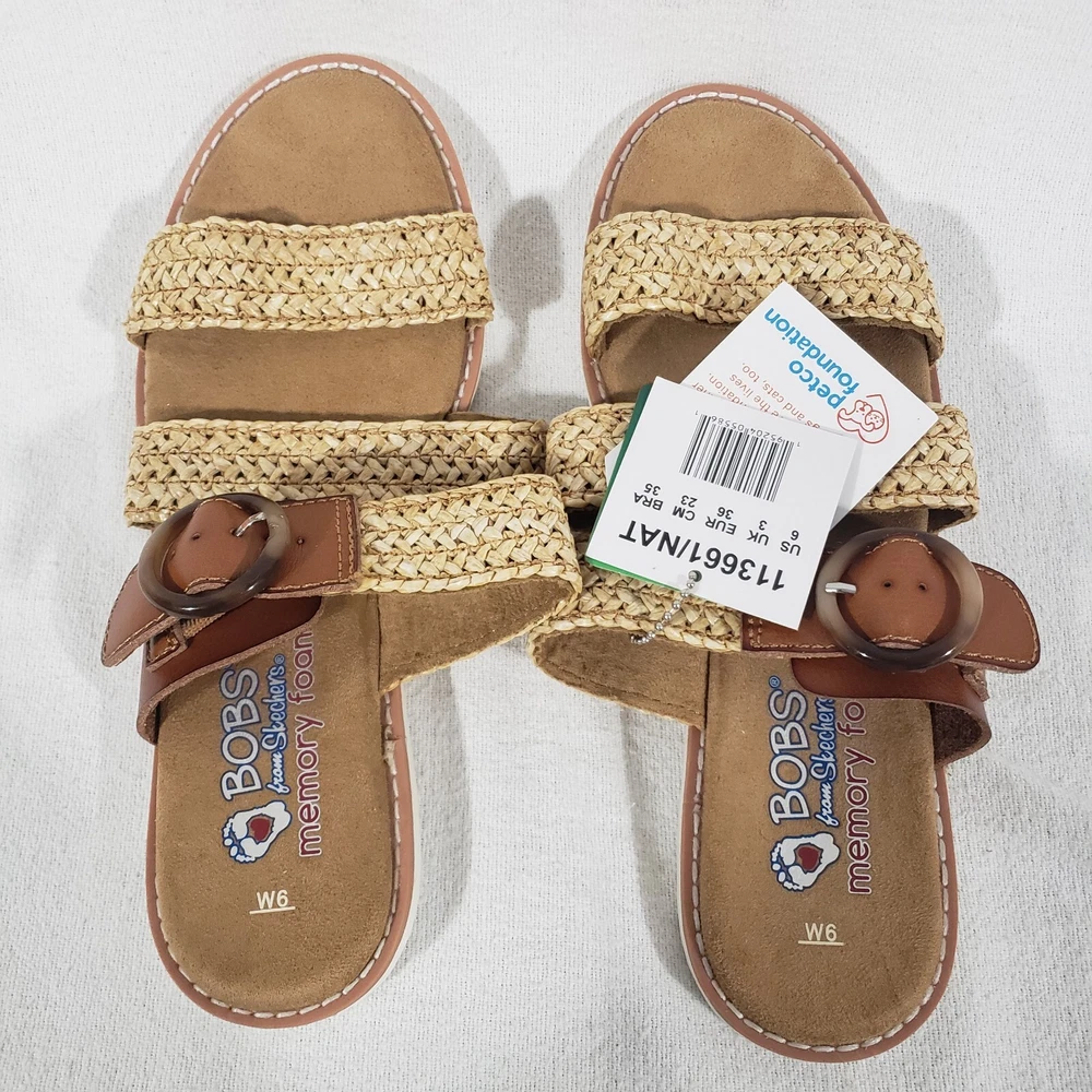 Bobs from Skechers womens slip on flat sandals Size 6 Tan, white Man made materials Rattan straw straps Buckles Open round toe Memory foam comfort Casual, travel, vacation, summer, beach, poolside, cruise New without box, with tags **Offers are welcome **Ship within 1-2 days **Smoke free environment