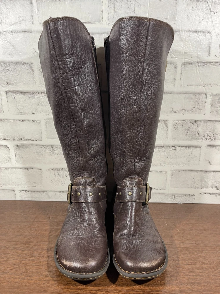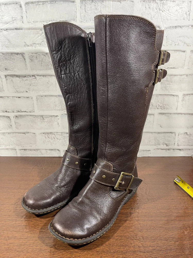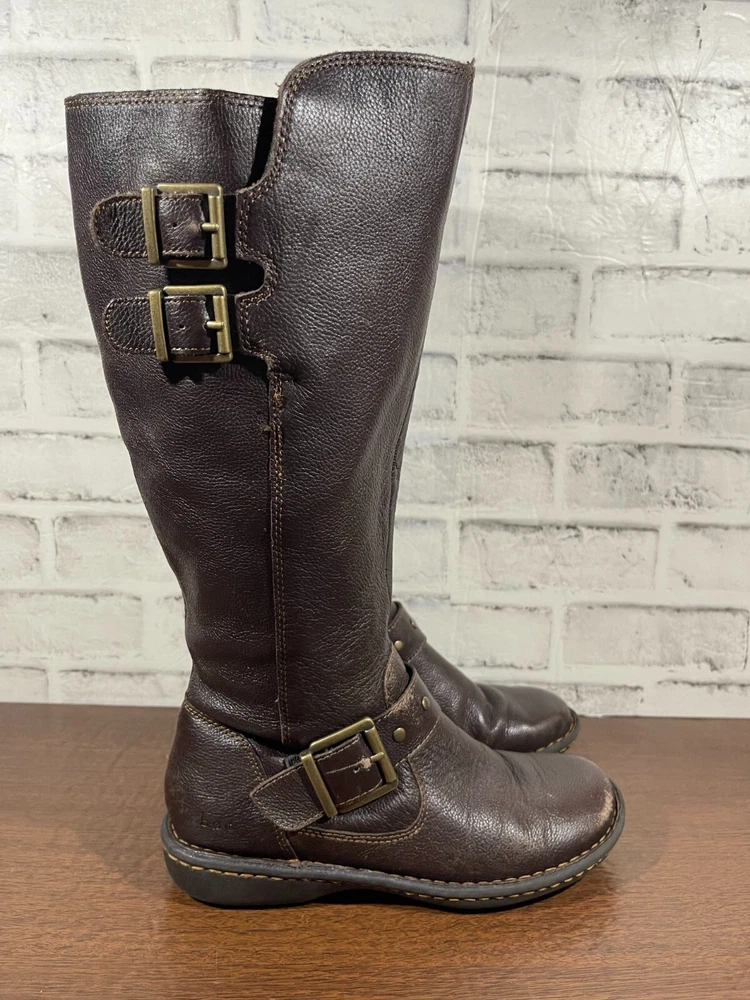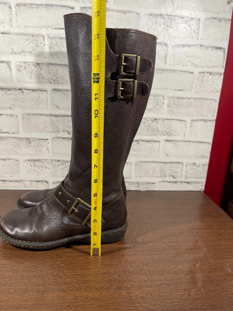 Step out in style with these BOC Born Concept Boots for women. These mid-calf riding boots feature a round toe shape and a zip closure for easy wear. The brown leather upper material is accented with a buckle, zipper, and logo, giving these boots a classic yet modern theme. Comfort is not compromised with a flat heel style and medium calf width. The rubber outsole material ensures durability, making these boots perfect for casual occasions during any season, be it winter, summer, fall, or spring. These boots are available in US shoe size 7, AU shoe size 7, and EU shoe size 38. Add these stylish boots to your wardrobe today! Very good preowned condition with normal preowned wear and a bit of scuffing as pictured. Please see all photos. All clothing has been washed and comes from a smoke free environment. I am available for questions. I accept or negotiate reasonable offers. Have an amazing day. Thank you.