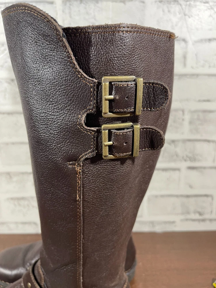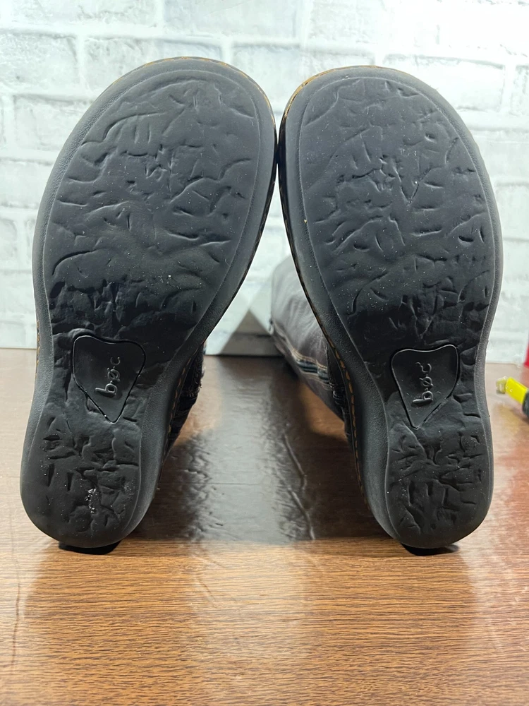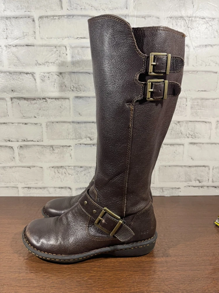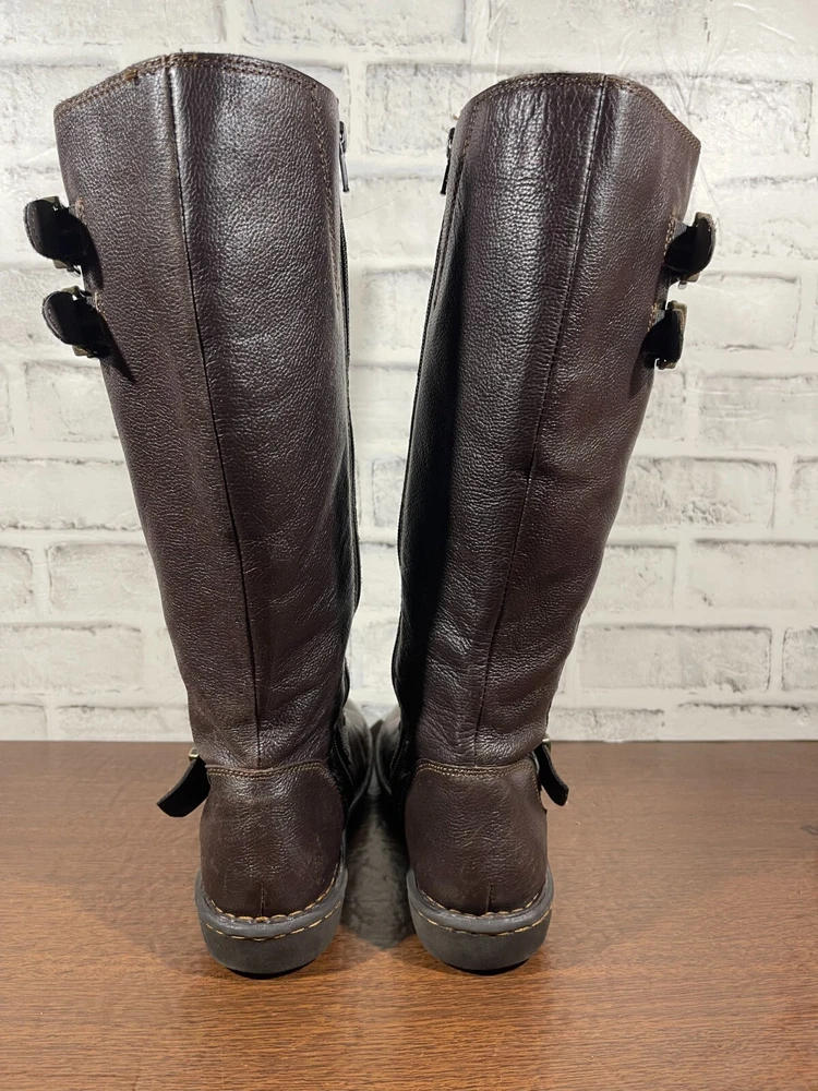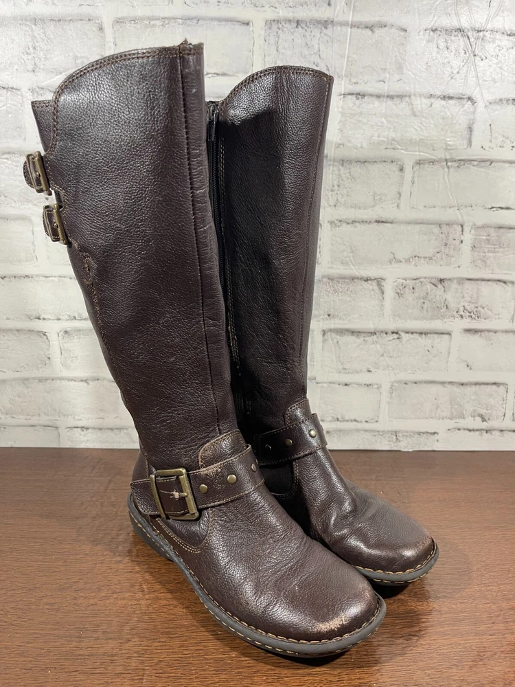 Step out in style with these BOC Born Concept Boots for women. These mid-calf riding boots feature a round toe shape and a zip closure for easy wear. The brown leather upper material is accented with a buckle, zipper, and logo, giving these boots a classic yet modern theme. Comfort is not compromised with a flat heel style and medium calf width. The rubber outsole material ensures durability, making these boots perfect for casual occasions during any season, be it winter, summer, fall, or spring. These boots are available in US shoe size 7, AU shoe size 7, and EU shoe size 38. Add these stylish boots to your wardrobe today! Very good preowned condition with normal preowned wear and a bit of scuffing as pictured. Please see all photos. All clothing has been washed and comes from a smoke free environment. I am available for questions. I accept or negotiate reasonable offers. Have an amazing day. Thank you.