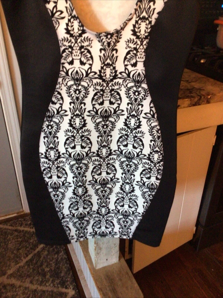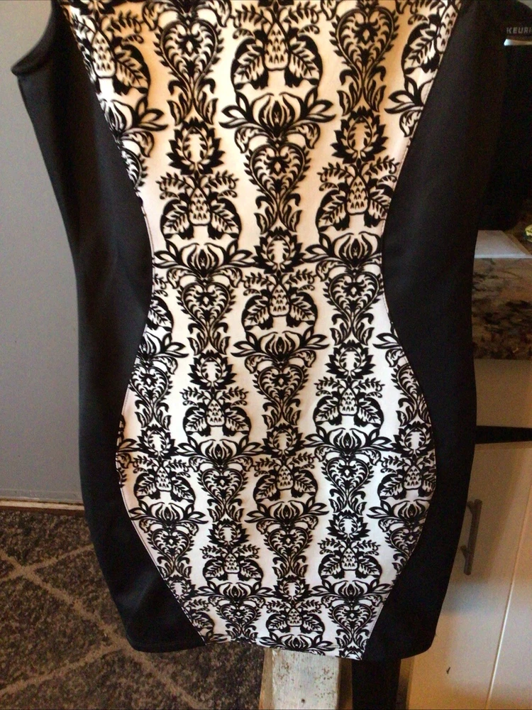 This stunning black and white paisley bodycon dress from Body Central is the perfect addition to any wardrobe. The sleeveless design, round neckline, and pullover closure make it easy to wear for any occasion, whether it's a party or a casual day out. The dress is made from a comfortable and stretchy knit fabric, consisting of polyester and spandex, that fits perfectly in all the right places. The dress features a lined and backless design, collared neckline, and a short length that makes it perfect for showing off your legs. The dress is available in size medium and can be easily hand washed for long-lasting wear. Whether you're looking for a sexy and comfortable dress or simply want to add to your collection, this Body Central dress is a great choice.