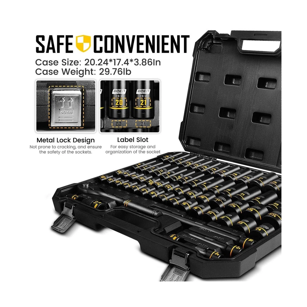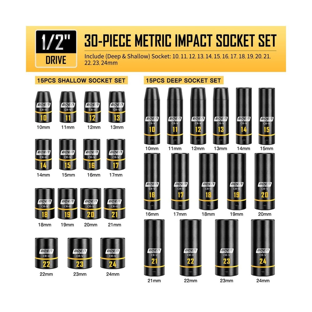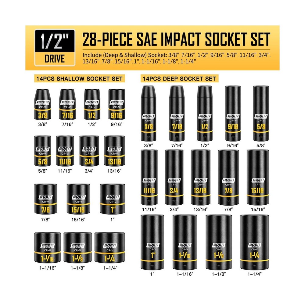 BOEN 1/2" Drive Impact Socket Set, 65-Piece Standard SAE (3/8" to 1-1/4") & Metric (10mm-24mm) Deep & Shallow Socket with Embossed Painted Marking, Includes Adapters, Ratchet Wrench, Extension Bars Description Features: Grooved & Yellow Painted Marking:Unlike traditional laser-etched markings, our sockets feature deep grooves on the surface filled with high-durability yellow paint. The recessed design shields the paint from scratches and grease buildup, ensuring size labels stay vividly visibleeven in dim garages or greasy workspacesfor instant identification and faster, error-free work. This is far more resilient than conventional markings that peel or blur over time Complete 65-Piece Set: Includes SAE (Deep and shallow) socket: 3/8, 7/16, 1/2, 9/16, 5/8, 11/16, 3/4, 13/16, 7/8, 15/16, 1, 1-1/16, 1-1/8 to 1-1/4"; metric (Deep and shallow) socket: 10, 11, 12, 13, 14, 15, 16, 17, 18, 19, 20, 21, 22, 23, 24mm. Additionally, it comes with 3 extension bars (3, 5, 10-inch), 1 x quick-release 72-tooth ratchet handle, 1 x 1/2" impact universal joint, 1 x 1/2" (F) to 3/8" (M) reducer, and 1 x 3/8" (F) to 1/2" (M) adapter 6-Point Design & Convenient Case: The 6-point design reduces pressure on nuts and bolts under high torque, preventing round-off and stripping even when used with high-output impact or electric wrenches. Paired with a custom blow-molded case featuring labeled slots for each socket, the set stays organizedsecure lever locks prevent accidental opening at job sites, ensuring easy transport and storage without lost pieces Excellent Quality: Crafted from drop-forged chrome vanadium (Cr-V) steel, this socket set withstands extreme torque from impact/electric wrenches for heavy-duty automotive, garage, or outdoor use. Each socket combines temporary skin-safe rust-resistant oil (wipe with cloth before use) and a permanent black phosphate coating. This dual-layer corrosion protection ensures longevity during storage/transport and extends tool life in damp garages or outdoor environments Widely Used: BOEN impact socket set meets ANSI/ASME B standards for impact sockets, Which is ideal for tool repair, automotive repairs, home DIY, industrial equipment installation, and pipe connections. Its designed for repair technicians, DIY enthusiasts, technicians (e.g., plumbers, electricians), and industrial maintenance workers to help them efficiently and flexibly complete various tasks Product Details: Brand: boen Material: Chrome Vanadium Steel Finish Type: Manganese Phosphate Number of Pieces: 65 Drive System: Square Drive System: Square Number of Pieces: 65 Material Type: Chrome Vanadium Steel Finish Types: Manganese Phosphate Brand Name: boen Model Number: BS-129065R Manufacturer: BOEN Unit Count: 1.0 Count Delivery We Do Not Ship Outside of the Continental US. Return Policy All items qualify for returns within 30 days of receipt. Seller is responsible for return shipping on any item that is not damaged. Feedback We take our reputation seriously, we buy and sell online, so we understand the value of trust. If you are unsatisfied with your order, please contact us and we will work with you to resolve it to your satisfaction.