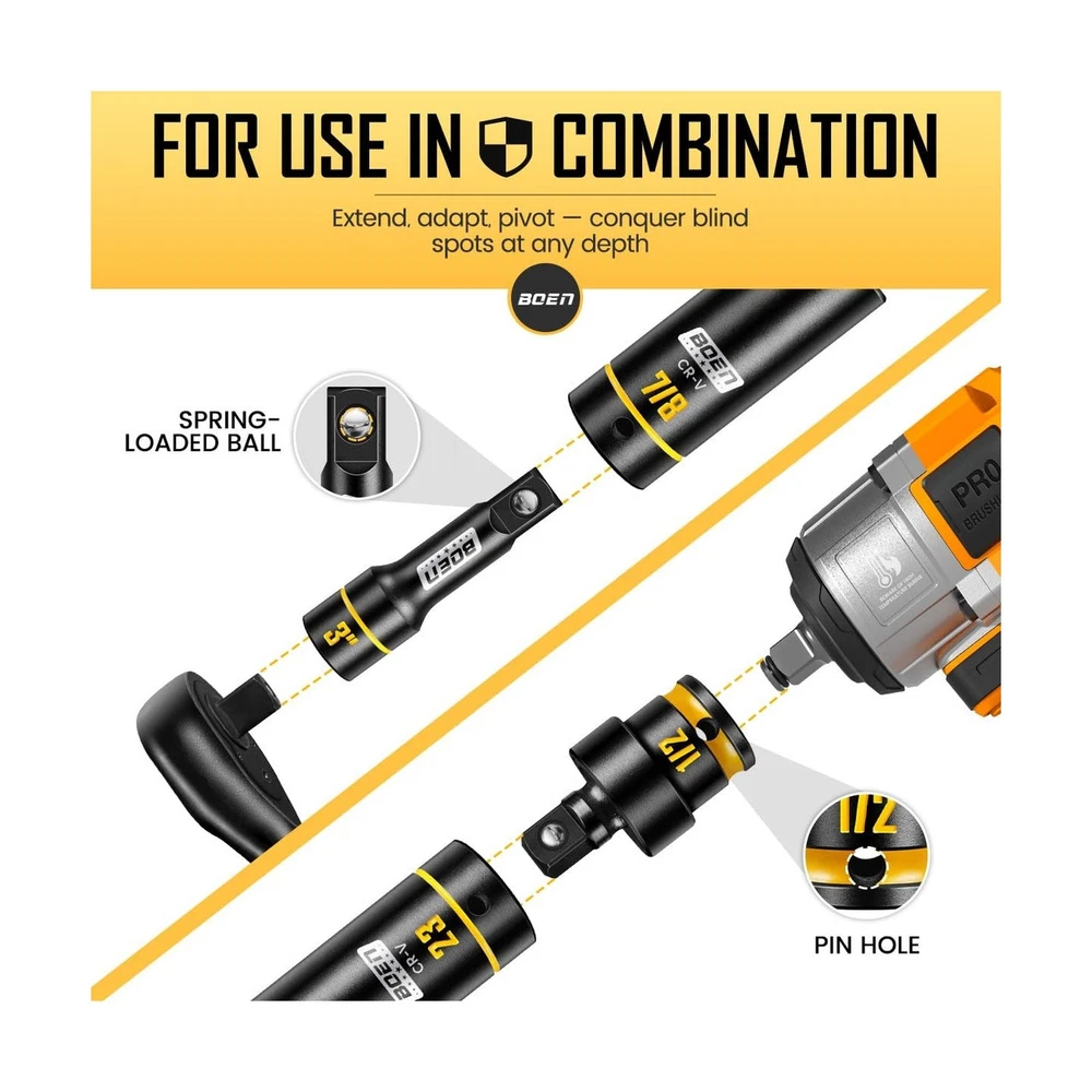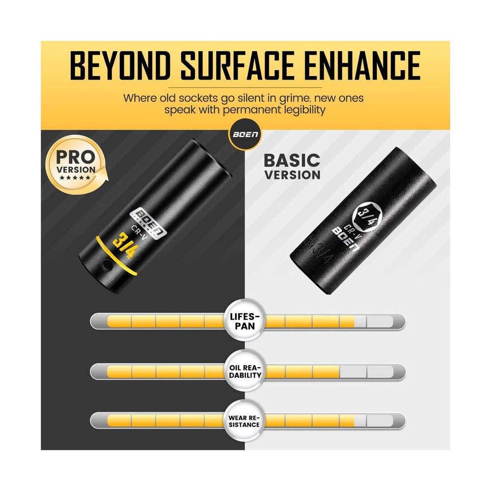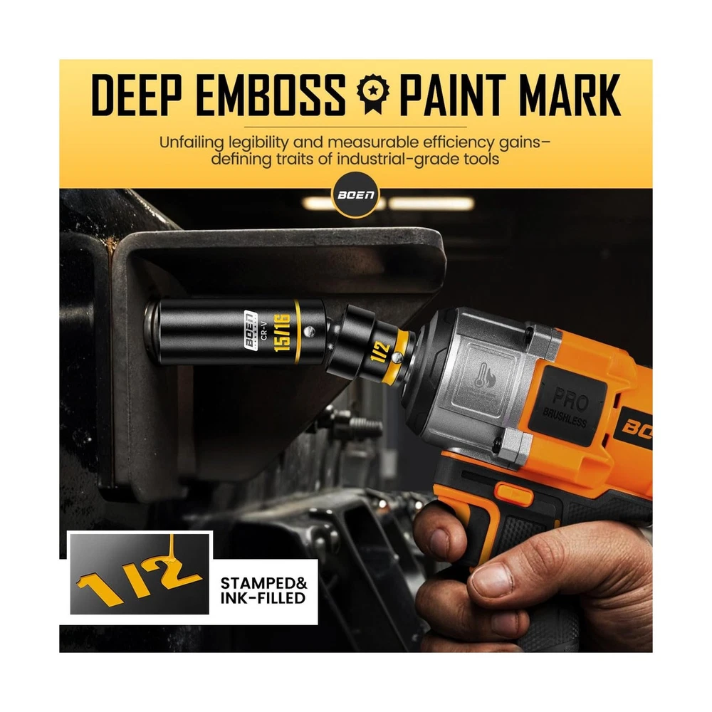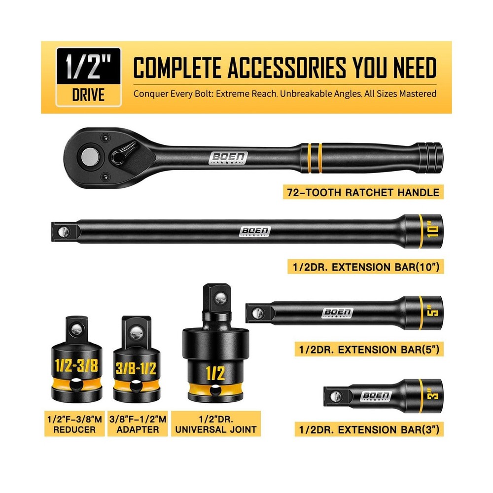 BOEN 1/2" Drive Impact Socket Set, 65-Piece Standard SAE (3/8" to 1-1/4") & Metric (10mm-24mm) Deep & Shallow Socket with Embossed Painted Marking, Includes Adapters, Ratchet Wrench, Extension Bars Description Features: Grooved & Yellow Painted Marking:Unlike traditional laser-etched markings, our sockets feature deep grooves on the surface filled with high-durability yellow paint. The recessed design shields the paint from scratches and grease buildup, ensuring size labels stay vividly visibleeven in dim garages or greasy workspacesfor instant identification and faster, error-free work. This is far more resilient than conventional markings that peel or blur over time Complete 65-Piece Set: Includes SAE (Deep and shallow) socket: 3/8, 7/16, 1/2, 9/16, 5/8, 11/16, 3/4, 13/16, 7/8, 15/16, 1, 1-1/16, 1-1/8 to 1-1/4"; metric (Deep and shallow) socket: 10, 11, 12, 13, 14, 15, 16, 17, 18, 19, 20, 21, 22, 23, 24mm. Additionally, it comes with 3 extension bars (3, 5, 10-inch), 1 x quick-release 72-tooth ratchet handle, 1 x 1/2" impact universal joint, 1 x 1/2" (F) to 3/8" (M) reducer, and 1 x 3/8" (F) to 1/2" (M) adapter 6-Point Design & Convenient Case: The 6-point design reduces pressure on nuts and bolts under high torque, preventing round-off and stripping even when used with high-output impact or electric wrenches. Paired with a custom blow-molded case featuring labeled slots for each socket, the set stays organizedsecure lever locks prevent accidental opening at job sites, ensuring easy transport and storage without lost pieces Excellent Quality: Crafted from drop-forged chrome vanadium (Cr-V) steel, this socket set withstands extreme torque from impact/electric wrenches for heavy-duty automotive, garage, or outdoor use. Each socket combines temporary skin-safe rust-resistant oil (wipe with cloth before use) and a permanent black phosphate coating. This dual-layer corrosion protection ensures longevity during storage/transport and extends tool life in damp garages or outdoor environments Widely Used: BOEN impact socket set meets ANSI/ASME B standards for impact sockets, Which is ideal for tool repair, automotive repairs, home DIY, industrial equipment installation, and pipe connections. Its designed for repair technicians, DIY enthusiasts, technicians (e.g., plumbers, electricians), and industrial maintenance workers to help them efficiently and flexibly complete various tasks Product Details: Brand: boen Material: Chrome Vanadium Steel Finish Type: Manganese Phosphate Number of Pieces: 65 Drive System: Square Drive System: Square Number of Pieces: 65 Material Type: Chrome Vanadium Steel Finish Types: Manganese Phosphate Brand Name: boen Model Number: BS-129065R Manufacturer: BOEN Unit Count: 1.0 Count Delivery We Do Not Ship Outside of the Continental US. Return Policy All items qualify for returns within 30 days of receipt. Seller is responsible for return shipping on any item that is not damaged. Feedback We take our reputation seriously, we buy and sell online, so we understand the value of trust. If you are unsatisfied with your order, please contact us and we will work with you to resolve it to your satisfaction.