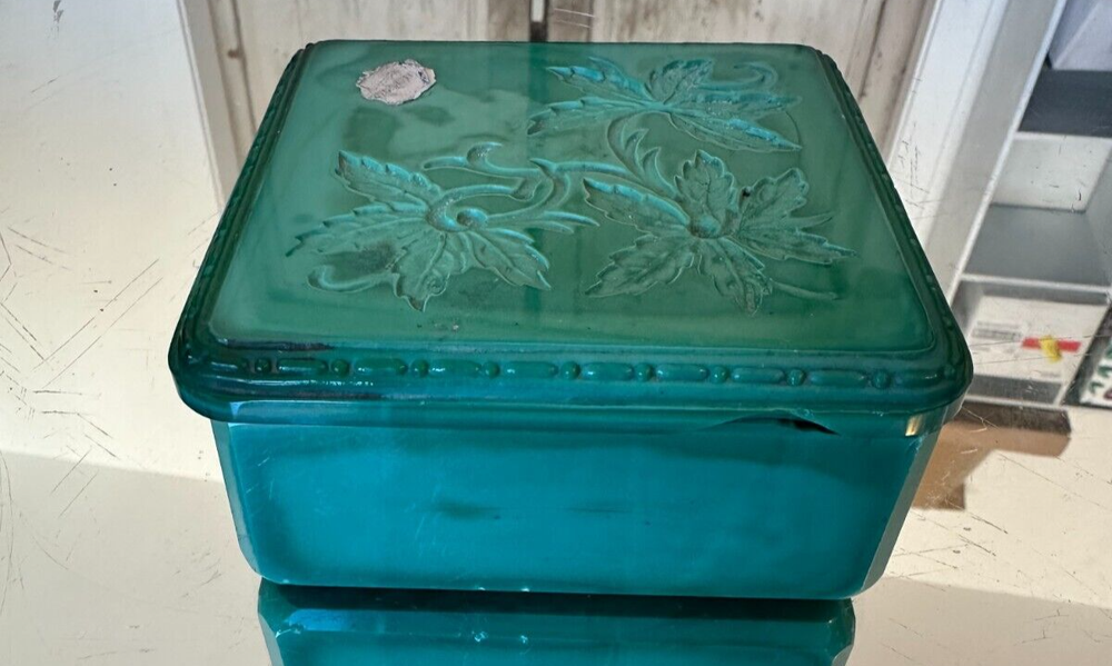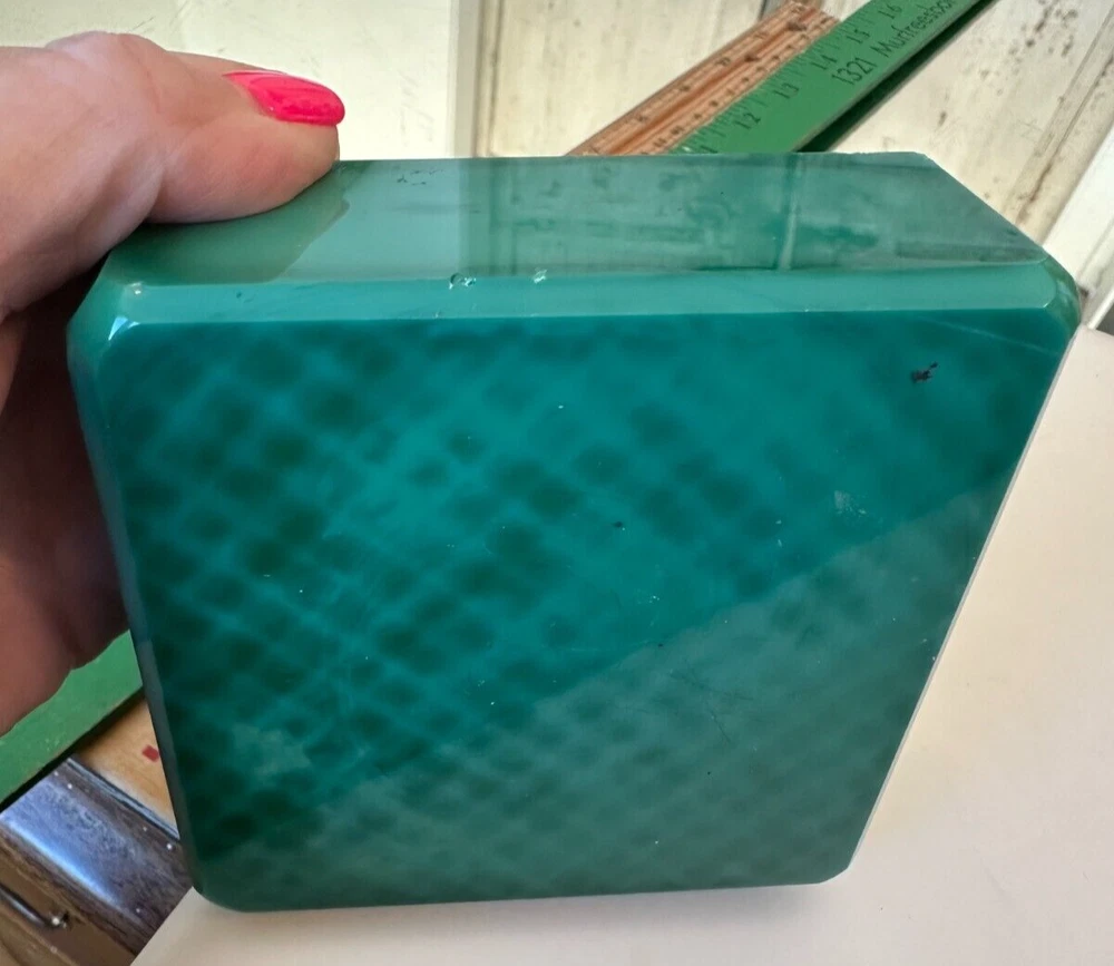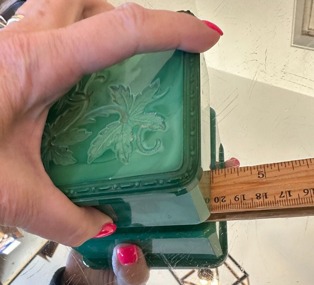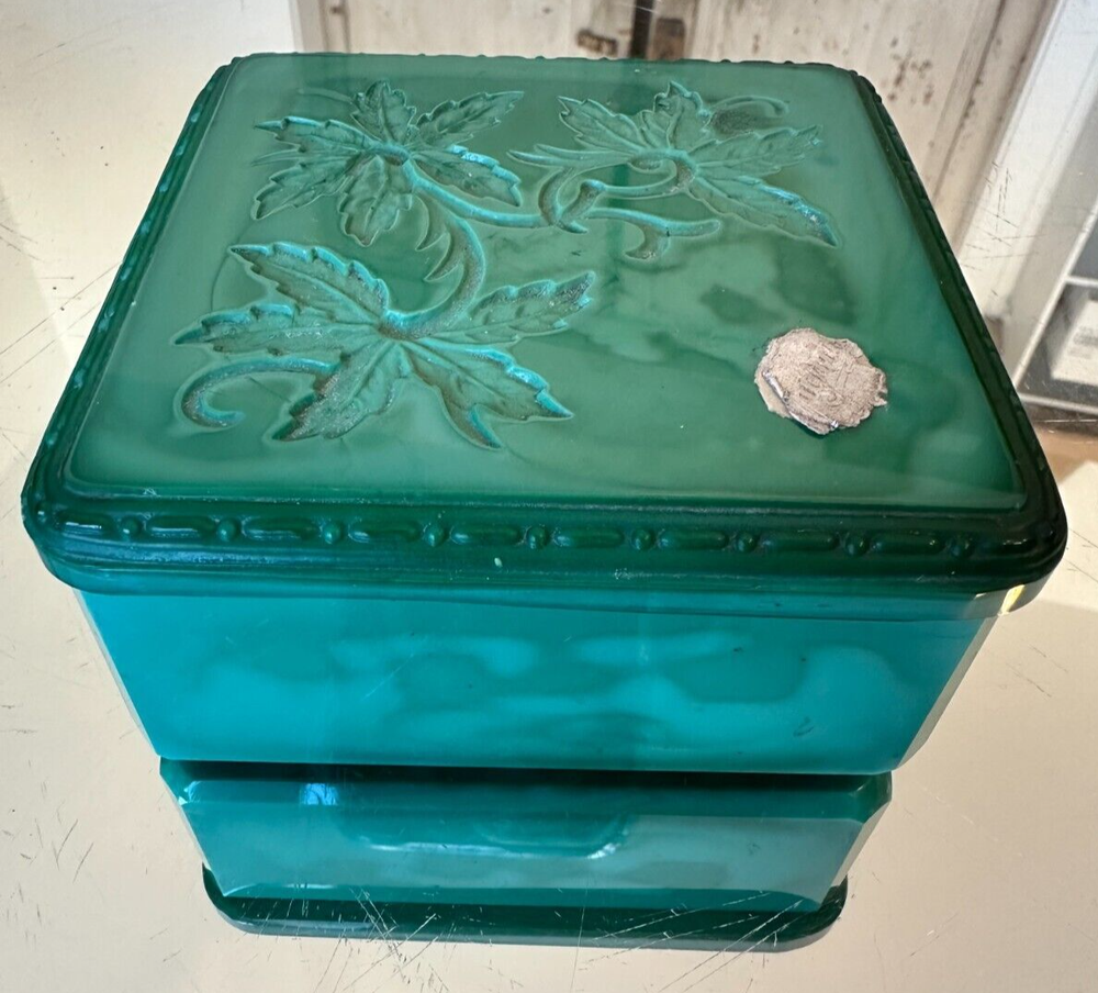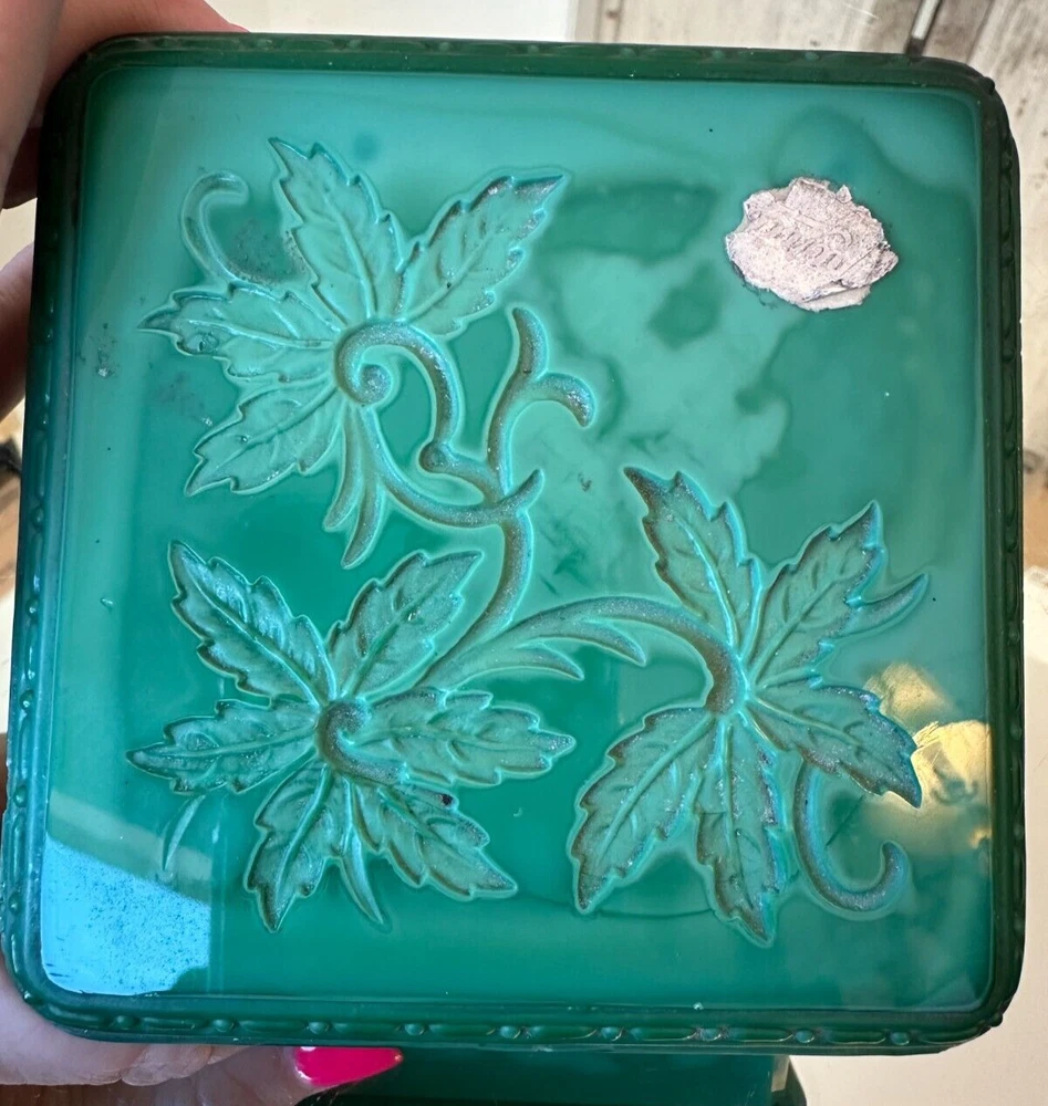 This beautiful Bohemian Art Deco jade glass jewelry/trinket/powder box is a must-have for any collector. The square-shaped box features intricate vine designs in green malachite glass. It is signed by Ingrid and produced by Hoffmann & Schlevogt in the early 20th century. The small handmade box is perfect for all occasions and can be used in any room, including the bathroom and bedroom. Its original and authentic design, pressed glass production technique, and Czech Republic origin make it a unique and valuable addition to any decorative collectibles collection. Pre-owned Has a chip and flea bites-Still so Beautiful and Useful-Please view all pictures and contact me if you have questions. Visit my Store for other Great Finds and when you find multiple items you desire to purchase, I will combine your shipments (if possible) to save you money. Thank you for Your Business,