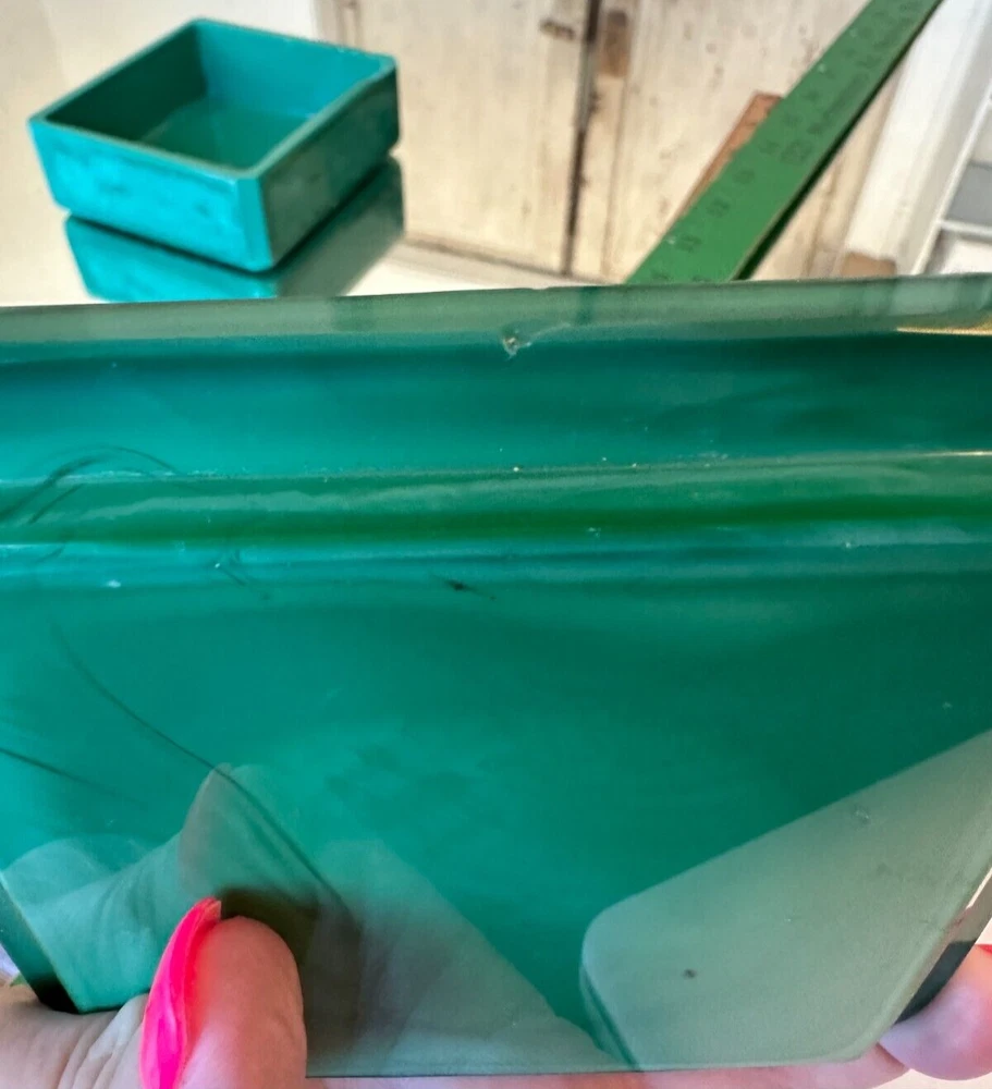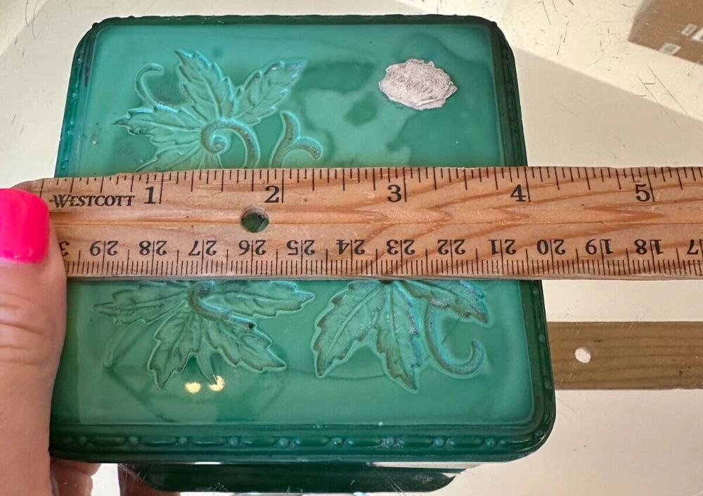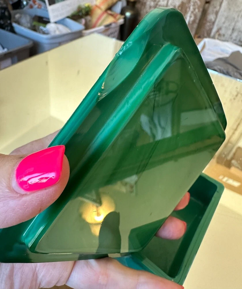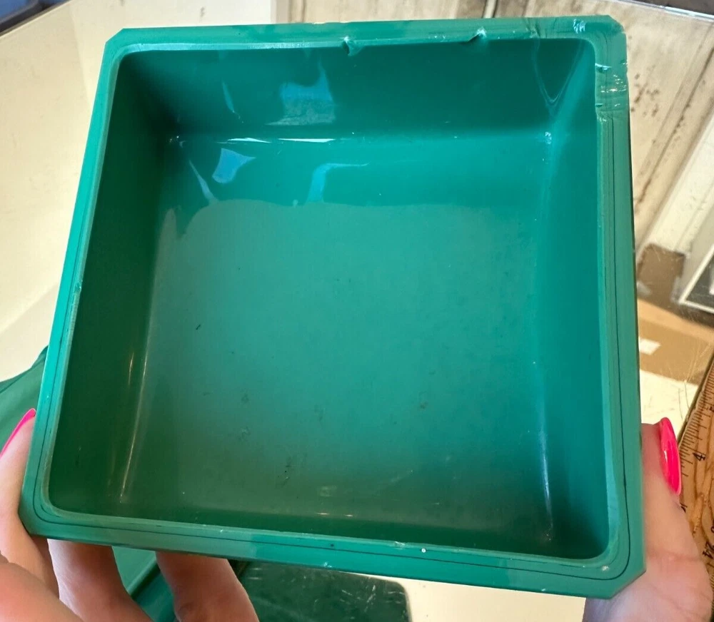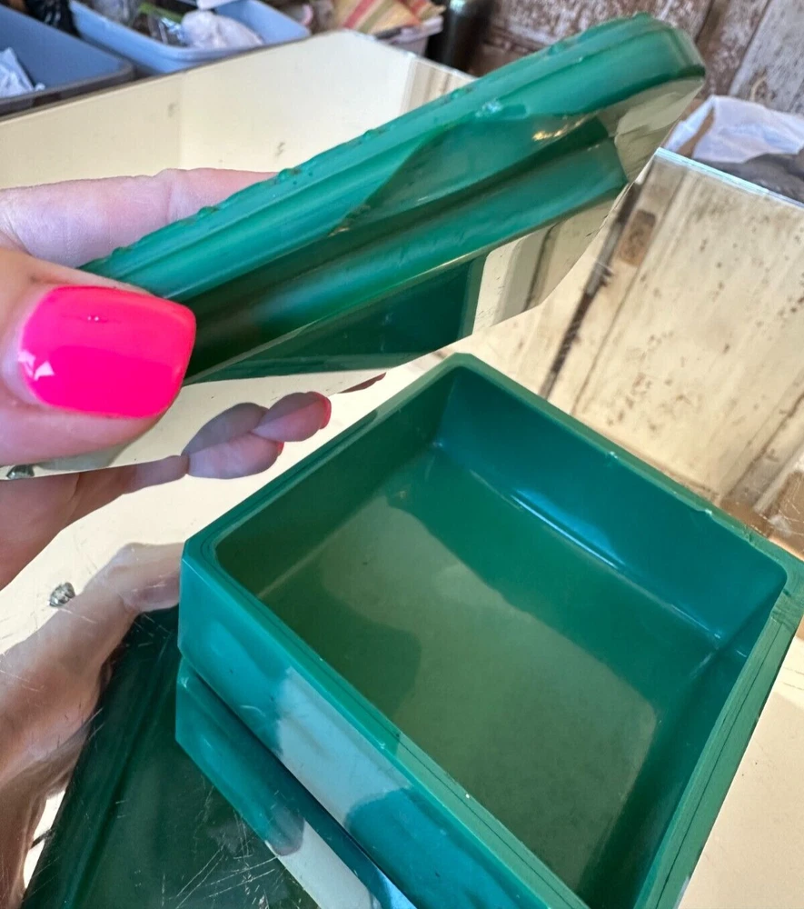 This beautiful Bohemian Art Deco jade glass jewelry/trinket/powder box is a must-have for any collector. The square-shaped box features intricate vine designs in green malachite glass. It is signed by Ingrid and produced by Hoffmann & Schlevogt in the early 20th century. The small handmade box is perfect for all occasions and can be used in any room, including the bathroom and bedroom. Its original and authentic design, pressed glass production technique, and Czech Republic origin make it a unique and valuable addition to any decorative collectibles collection. Pre-owned Has a chip and flea bites-Still so Beautiful and Useful-Please view all pictures and contact me if you have questions. Visit my Store for other Great Finds and when you find multiple items you desire to purchase, I will combine your shipments (if possible) to save you money. Thank you for Your Business,