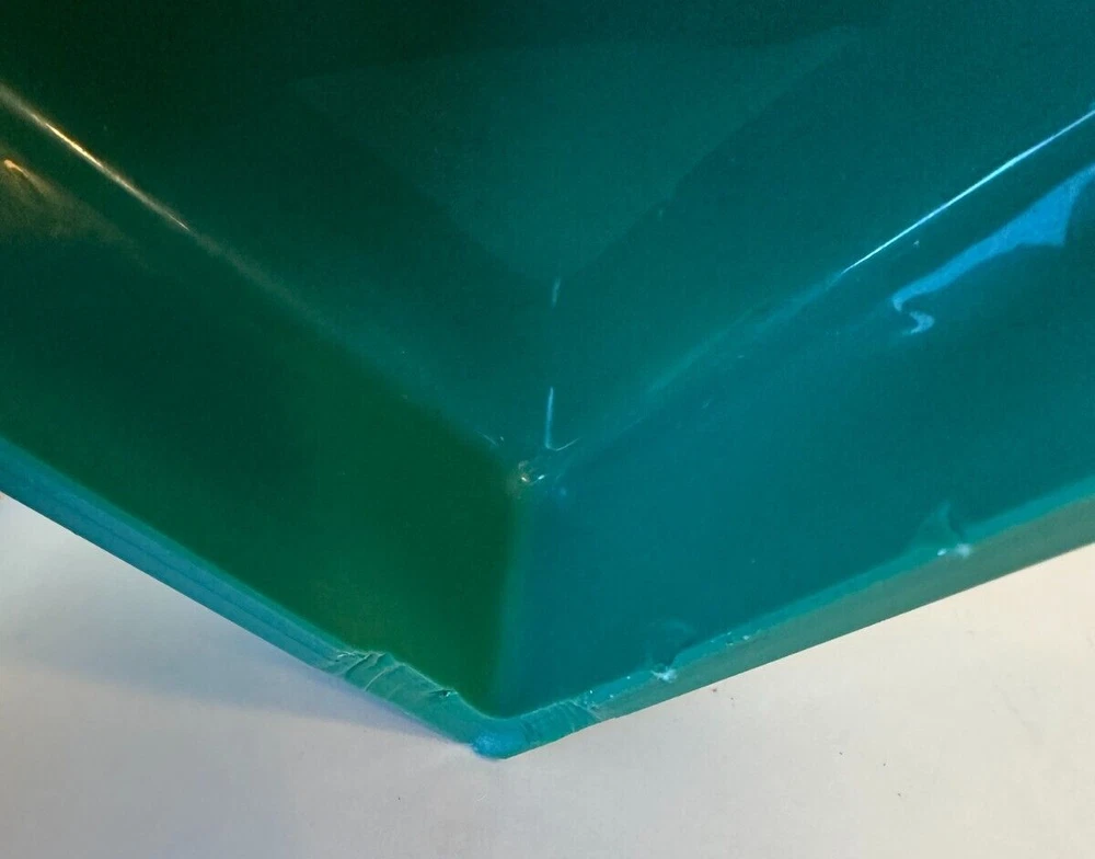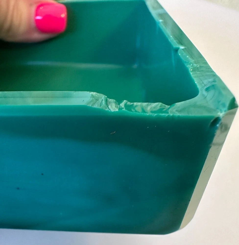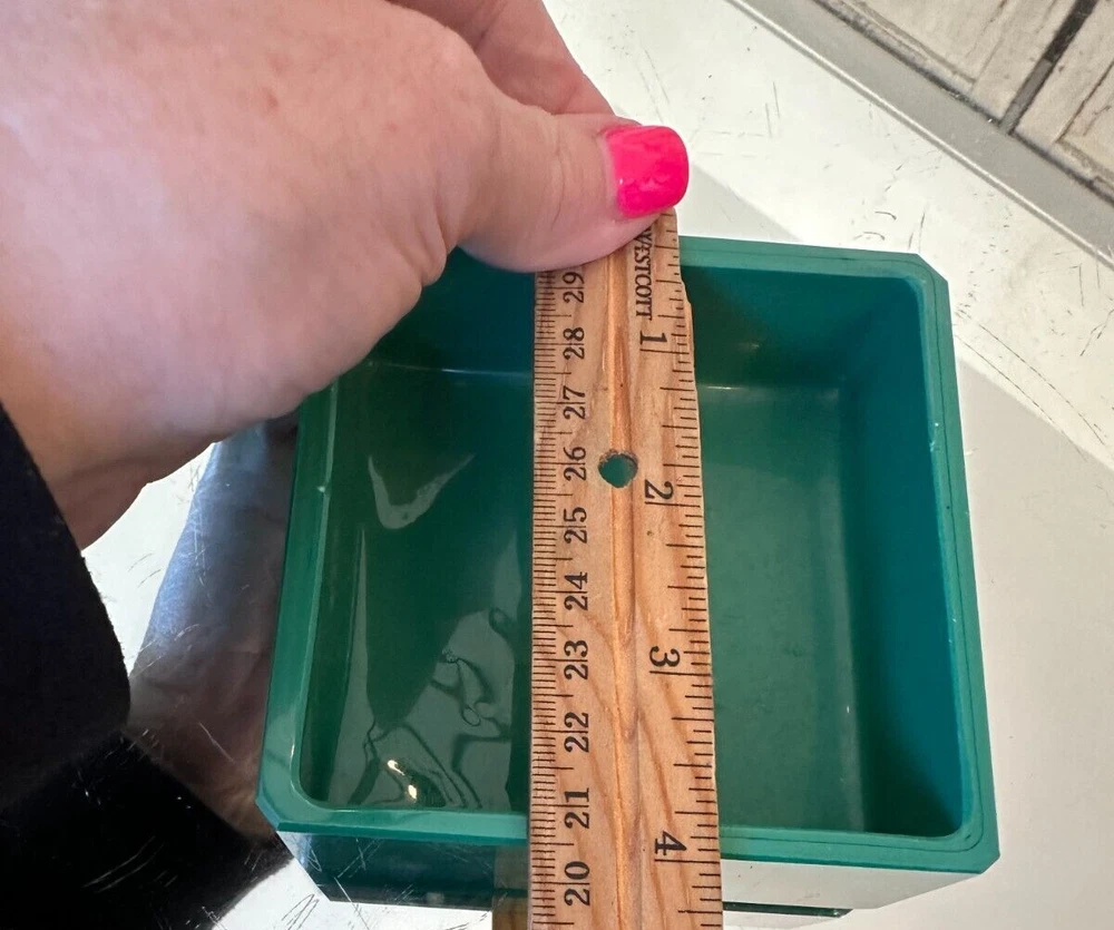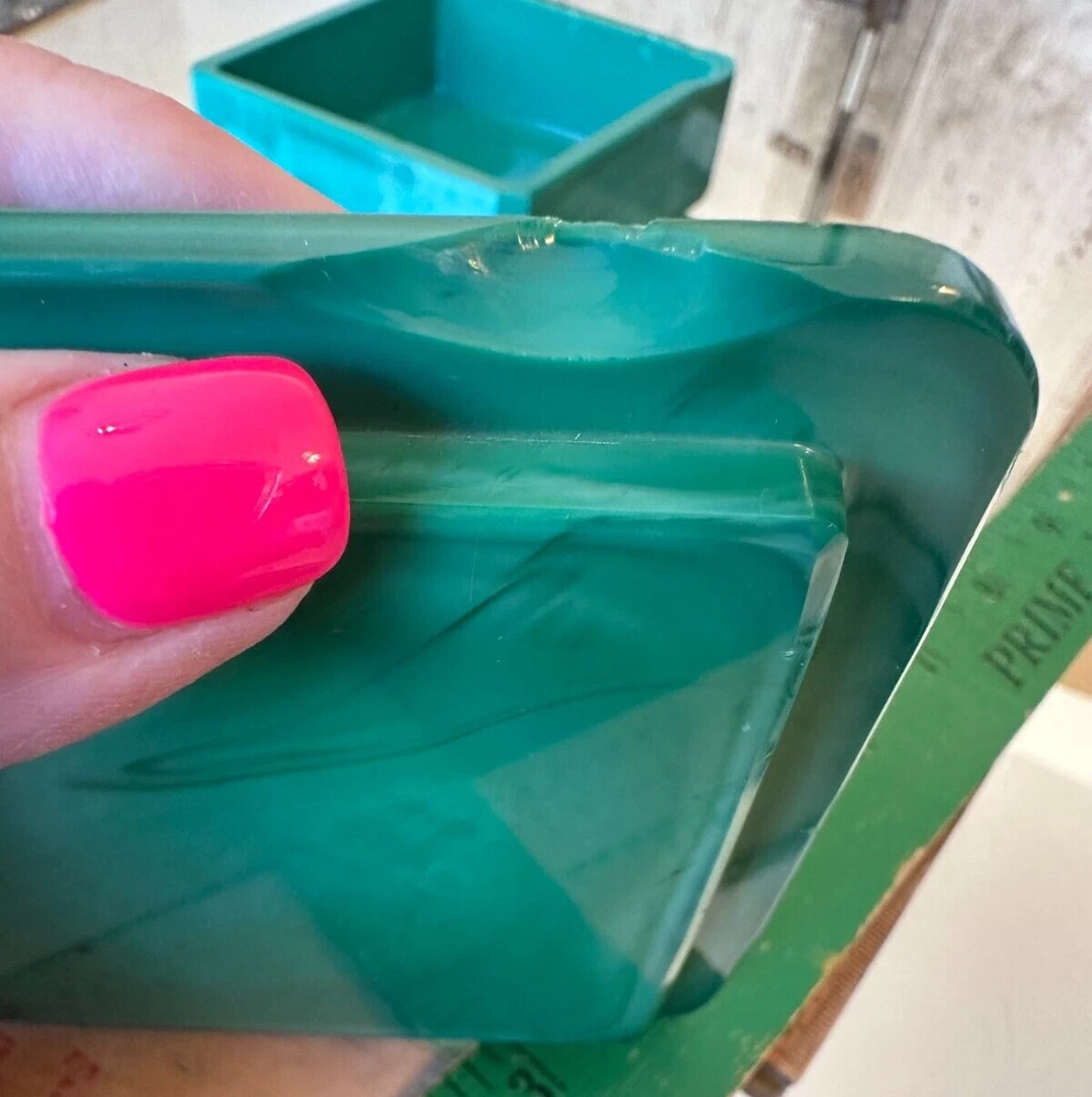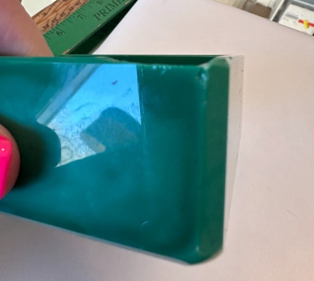 This beautiful Bohemian Art Deco jade glass jewelry/trinket/powder box is a must-have for any collector. The square-shaped box features intricate vine designs in green malachite glass. It is signed by Ingrid and produced by Hoffmann & Schlevogt in the early 20th century. The small handmade box is perfect for all occasions and can be used in any room, including the bathroom and bedroom. Its original and authentic design, pressed glass production technique, and Czech Republic origin make it a unique and valuable addition to any decorative collectibles collection. Pre-owned Has a chip and flea bites-Still so Beautiful and Useful-Please view all pictures and contact me if you have questions. Visit my Store for other Great Finds and when you find multiple items you desire to purchase, I will combine your shipments (if possible) to save you money. Thank you for Your Business,