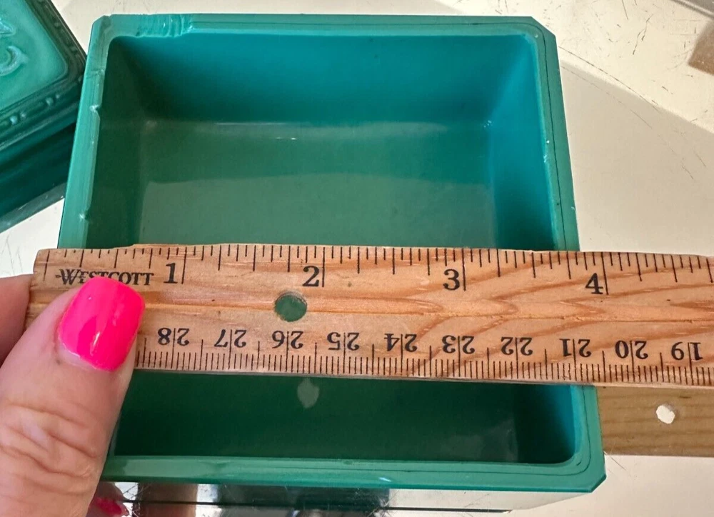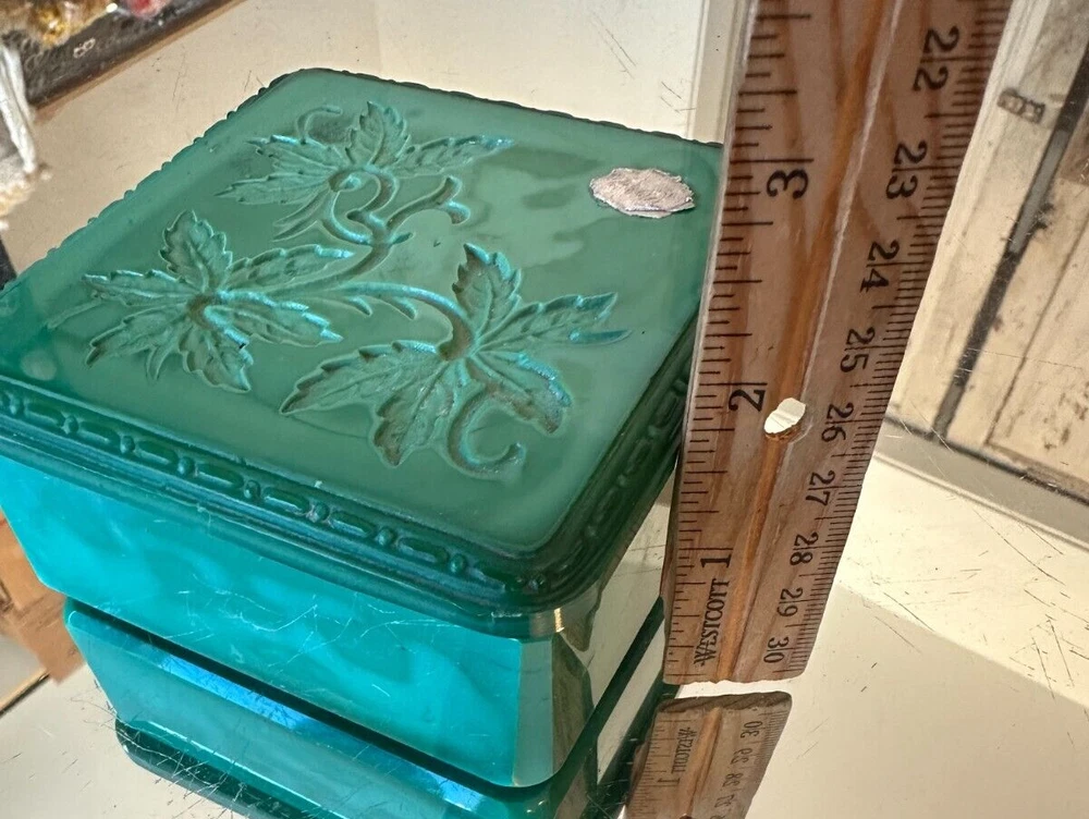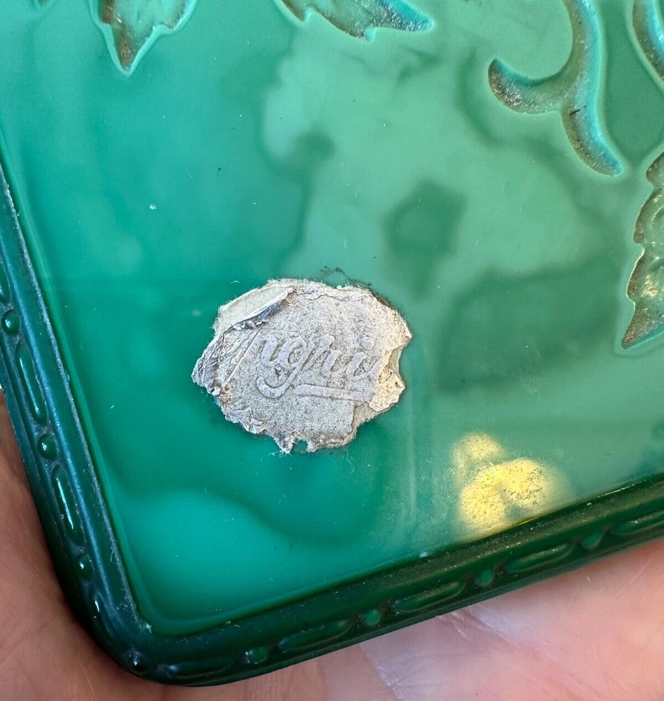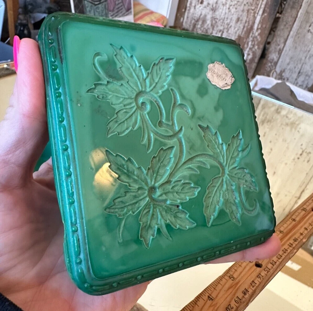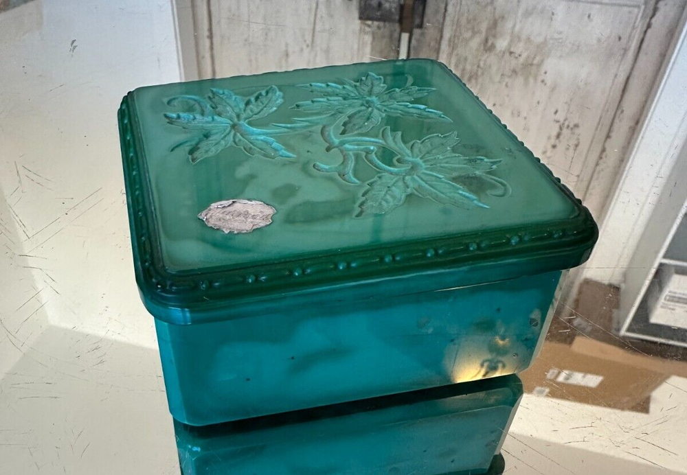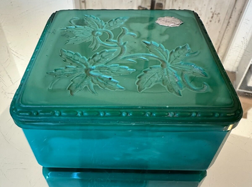 Signed: Ingrid Subject: Vines Style: Art Deco Room: Bathroom, Bedroom Production Technique: Pressed glass gtin13: Does not apply Time Period Manufactured: 1920-1949 Size: Small Country of Origin: Czech Republic Occasion: All Occasions Shape: Square UPC: Does not apply Era: Early 20th Century (1911-1940) Handmade: Yes Color: Green Features: Boxed Pattern: Bohemian Department: Girls Original/Reproduction: Original Material: Glass, Malachite glass Brand: Hoffmann & Schlevogt Collection: Ingrid Type: Powder & trinket box