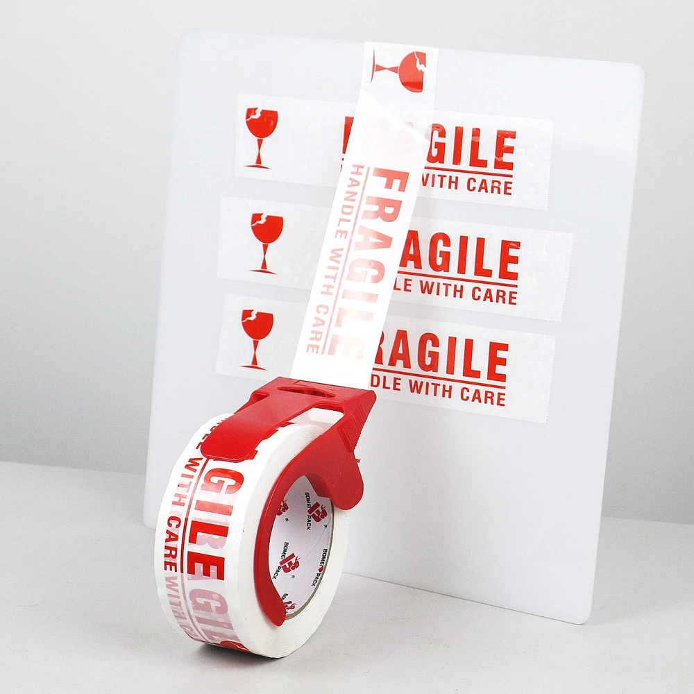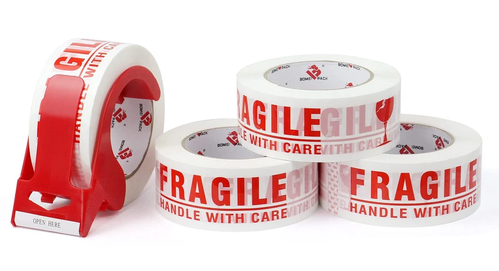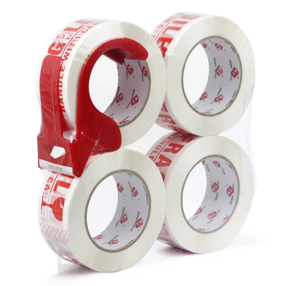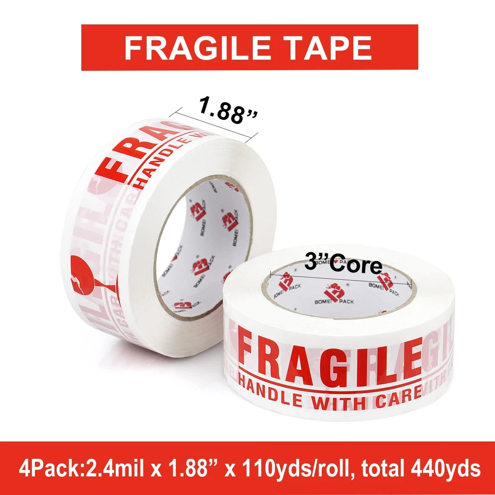 PREMIUM ADHESIVE: 4 Roll of 110 Yards, 2.4 mil thick of high performance fragile packaging tape with a small easy use dispenser for free. High adhesion and holding power resists popping for a tight seal throughout the supply chain. Suitable for home, commercial or industrial use in any climate. This storage and shipping box tape can firmly stick onto any surface EASY TO USE: Our 2.4 mil thick fragile tape is very good in thickness and toughness, will not tear or split easily. Provides excellent holding power for heavy-duty packaging and shipping. These fragile shipping labels are truly great for anyone who ships and handles fragile items especially for glass, collectables, electrical, houses, computers and computer parts, and in manufacturing industries or anything that needs to be handled with a little extra love EXTREMELY DURABLE: Our FRAGILE packing tape offers excellent holding power for packaging and shipping, easy to use shipping tape that will not split or rip during application. High edge tear and split resistance make it ideal for general industrial packaging applications and boxes weighing up to 80 pounds UNIVERSAL STANDARD SIZES: 2 inch wide; 110 yards length; 2.4 mil thickness. The diameter of core is 3 inch and perfectly fit standard 2inch hand-held dispenser. It will help your warehouse manage the sealing process quick and efficient. Adhesive sticks to smooth and textured surfaces especially on cardboard and carton materials MULTIPLE USE: Our Fragile Tape tape that can be used for home removals, shipping and mailing, for storing and organizing household items. Handle With Care Fragile in bright clear and easy to read text on label. Brings needed attention to your package so it is handled with the care that is needed. It's help reduce the risk of fragile items getting damaged during shipment