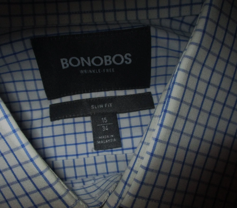 See my EBAY STORE at “SAMTPC53” to view 100’s more of my Men's Shirts!!! Combine Shipping: (on multiple items you pay full price on heaviest item first and then HALF PRICE shipping on ALL other clothes items. Men's Long Sleeve "Slim Fit" Dress Shirt. Brand: BONOBOS. Description: men's "Slim Fit" BONOBOS long sleeve dress shirt, button front, button cuffs, see pics Color: Blue White. Size: 15/34 (please see measurements). Measurements: 19" armpit to armpit, 30" shoulder to hem, 20.5" insleeve. Material: 100% Cotton. Condition: Excellent condition, NWOT.