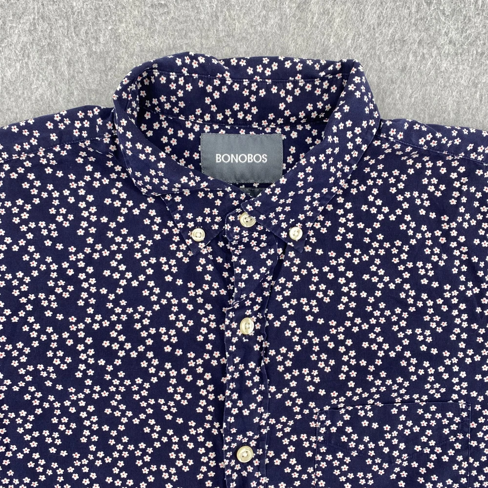 BONOBOS Shirt Mens Medium Navy Blue Flower Print Short Sleeve Slim Fit Button Up Item: The photos provided depict the actual item you will receive. Any defects or spots will be clearly shown in the photos. Shipping: We offer fast and reliable shipping! All orders will be provided with a tracking number to ensure that your item arrives promptly. Return Policy: 30-day hassle-free returns. See our return policies for details. Feel free to reach out to us through eBay with any questions!