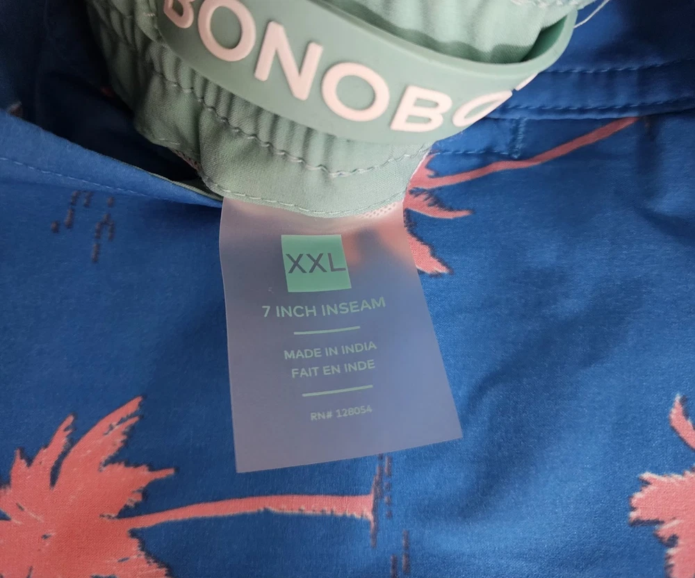 BONOBOS Swim Trunks – Men’s XXL – Blue with Pink Palm Trees Make a statement at the beach or pool with these stylish BONOBOS men’s swim trunks in size XXL. Featuring a vibrant blue background with bold pink palm tree graphics, these shorts deliver a fun tropical look perfect for warm-weather days. Designed for both comfort and performance, they include a soft interior mesh lining and an elastic waistband for a secure, flexible fit. These swim trunks are equipped with convenient pockets, making them practical for everyday wear as well as swimwear. Lightweight and quick-drying, they’re ideal for swimming, vacations, or casual summer outings. Features: Brand: BONOBOS Size: Men’s XXL Color: Blue with pink palm tree print Built-in mesh lining Comfortable elastic waistband Functional side pockets Lightweight, quick-dry material Great for beach, pool, or resort wear Add a pop of tropical style to your summer wardrobe with these eye-catching BONOBOS swim shorts!