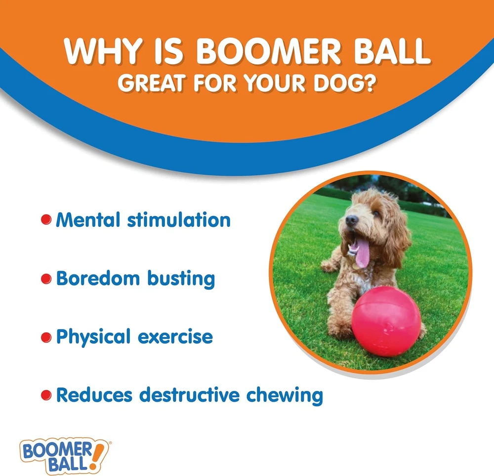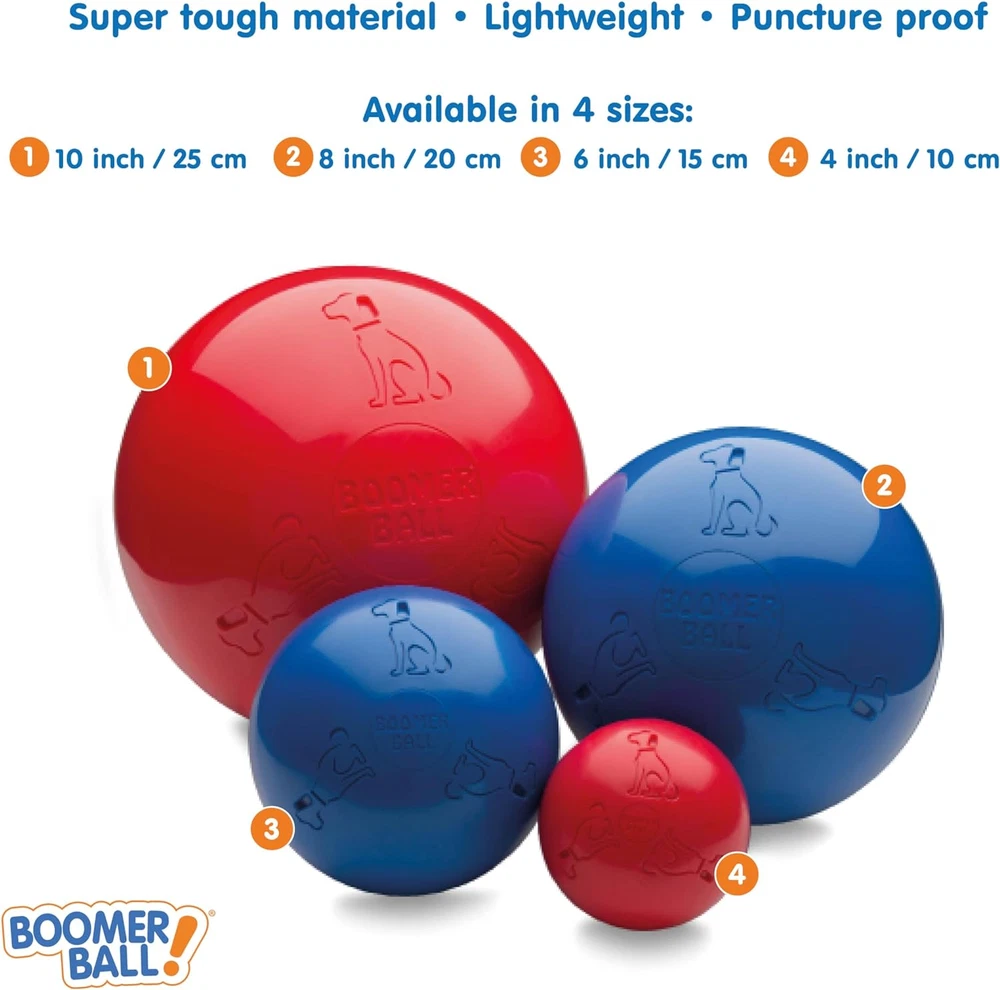 VIRTUALLY INDESTRUCTIBLE - The Boomer Ball is the ultimate tough toy and ideal for those ball-obsessed toy destroyers EXERCISE AND STIMULATION are promoted through the use of the Boomer Ball CHASE AND CONQUER - well-suited for high energy dogs who need a tough toy! CONSIDER SIZE - The toy is designed to not be picked up by the dog, so the ball should be a size bigger than the dog can carry HIGH QUALITY - This incredibly tough ball is made from polyethylene and means that most dogs can't puncture the ball or rip it to shreds! The Boomer Ball is the ultimate tough toy and ideal for those ball-obsessed toy destroyers! This incredibly tough ball is made from polyethylene and means that most dogs can't puncture the ball or rip it to shreds! It is designed not to be picked up by the dog, so the ball should be a size bigger than the dog can carry.