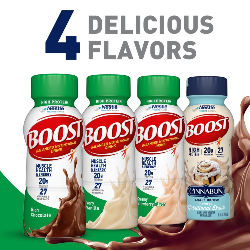 BOOST High Protein Nutritional Drink, Rich Chocolate, 20g Protein, 24 Bottles About this item 24 pack of 8 fl oz bottles of BOOST High Protein Rich Chocolate Nutritional Drink Nutrition drinks with a rich chocolate taste you’ll love Rich chocolate protein drink with 20 g of high quality protein for muscle health plus 27 vitamins and minerals per bottle Nutritional shakes designed to provide nutritional energy with 240 nutrient-rich calories and 8 B-vitamins to help convert food to energy Ready to drink protein drink that contains 100% more protein than BOOST Original shake (20 g protein in BOOST High Protein Drink vs 10 g in BOOST Original) Nutritional shake is gluten free Packaged resealable plastic bottles Product details BOOST High Protein Rich Chocolate Flavored Nutritional Drink is a high protein nutritional shake that provides balanced nutrition as part of your daily diet. This rich chocolate high protein drinks provide 20 grams of protein for muscle health and 27 vitamins and minerals including vitamins C & D, zinc, iron and selenium, key nutrients for immune support. Not only does this high protein shake support muscle health, it is designed to provide nutritional energy with 250 nutrient-rich calories and B-vitamins to help convert food to energy. BOOST High Protein Rich Chocolate Nutritional Drinks have a delicious chocolate taste and provide 100% more protein than the BOOST Original drinks (20 g protein vs 10 g in BOOST Original). This pack of high protein chocolate drink includes 24 reclosable 8 fluid ounce bottles for easy storage and portability. Whether you want extra protein, less sugars, more calories, fewer calories or simply great nutrition for everyday living, there are BOOST nutritional shakes that fit your needs. Inactive Ingredients N/A Ingredients WATER, GLUCOSE SYRUP, MILK PROTEIN CONCENTRATE, SOY PROTEIN ISOLATE, SUGAR, CANOLA OIL, AND LESS THAN 2% OF COCOA PROCESSED WITH ALKALI, VITAMINS AND MINERALS*, CELLULOSE GEL AND GUM, SALT, SOY LECITHIN, CARRAGEENAN, NATURAL FLAVOR, STEVIA LEAF EXTRACT, STEVIOL GLYCOSIDES *VITAMINS AND MINERALS: POTASSIUM CITRATE, SODIUM ASCORBATE, MAGNESIUM CHLORIDE, CALCIUM PHOSPHATE, MAGNESIUM PHOSPHATE, CHOLINE BITARTRATE, DL-ALPHA TOCOPHERYL ACETATE, POTASSIUM CHLORIDE, FERRIC PYROPHOSPHATE, ZINC SULFATE, NIACINAMIDE, MANGANESE SULFATE, CALCIUM PANTOTHENATE, PYRIDOXINE HYDROCHLORIDE, RIBOFLAVIN, FOLIC ACID, COPPER SULFATE, THIAMINE HYDROCHLORIDE, VITAMIN A PALMITATE, POTASSIUM IODIDE, SODIUM SELENATE, VITAMIN K1, CHROMIUM CHLORIDE, BIOTIN, VITAMIN D3, SODIUM MOLYBDATE, VITAMIN B12, (Insert Rainforest Alliance Logo), Cocoa, Rainforest Alliance Certified Cocoa. Find out more at ra.org. Stop Use Indications See packaging Health Concern Muscle Growth