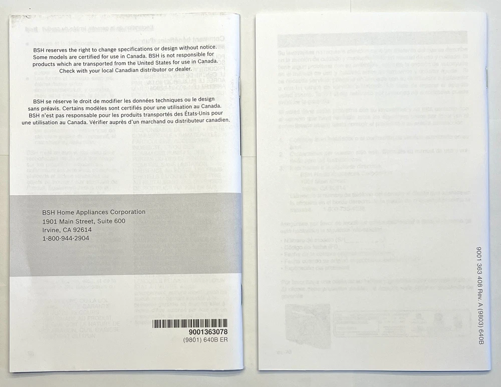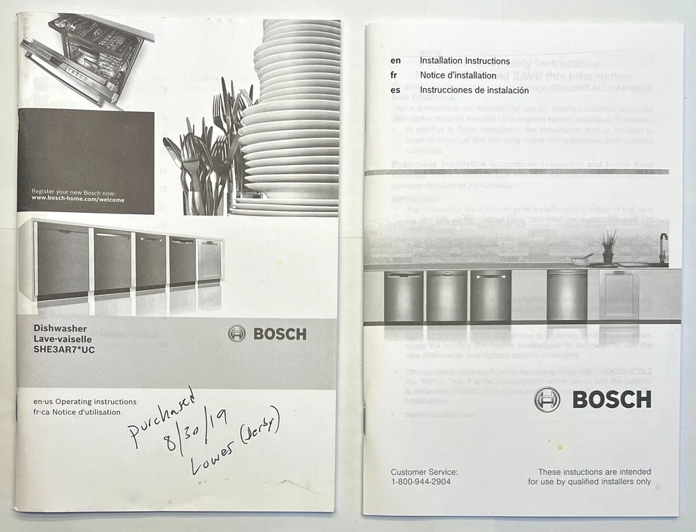 This is a comprehensive manual for the BOSCH Dishwasher SHE3AR7*UC model, which includes installation and instructions. It is a highly informative guide that provides step-by-step instructions on how to install, operate, and maintain your dishwasher. Item shows hand written notes /age/wear please see photos and make your determination of Condition