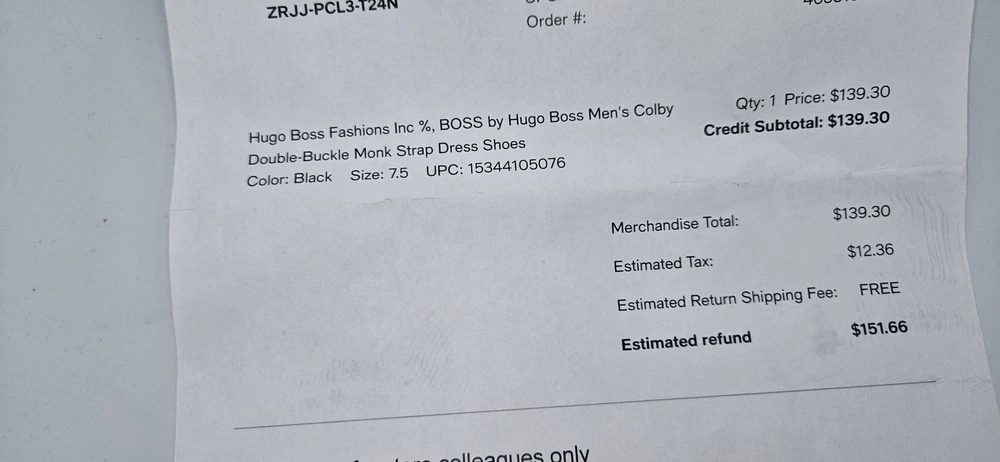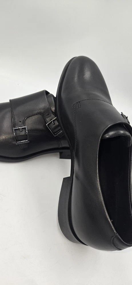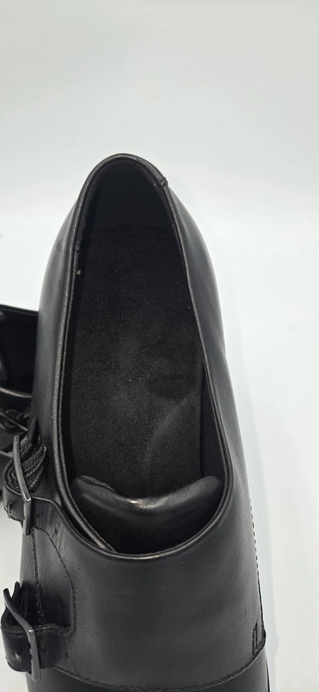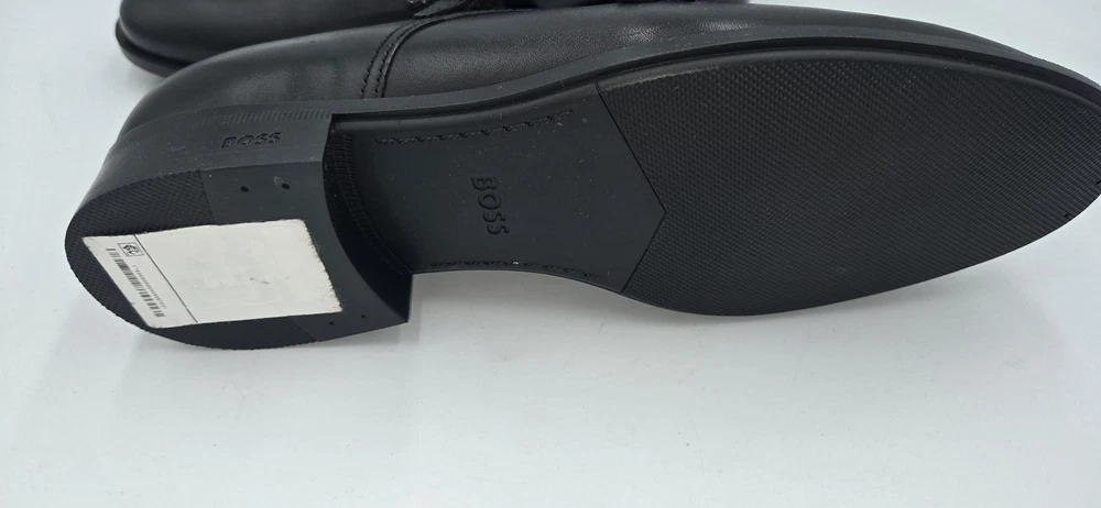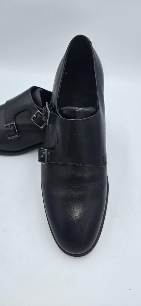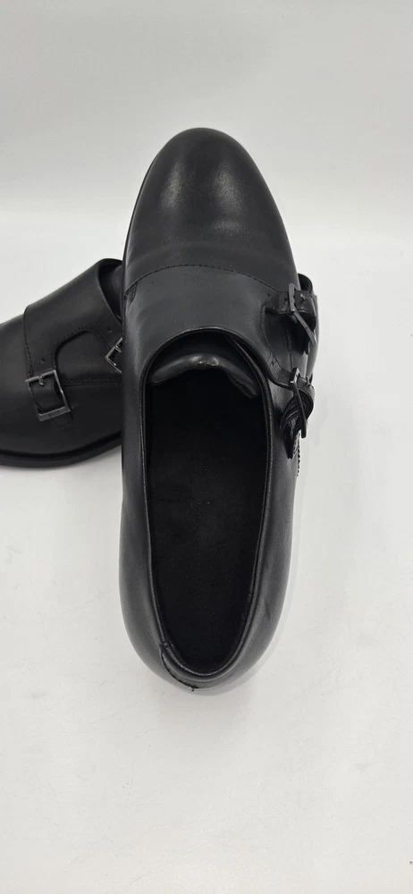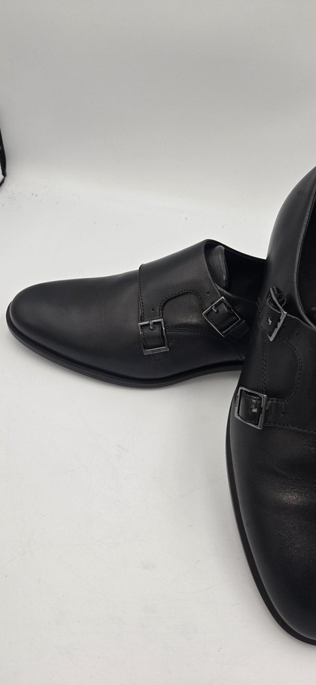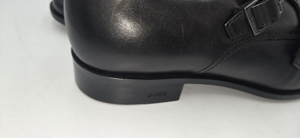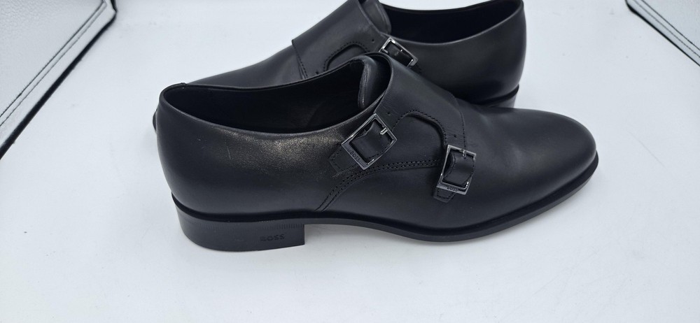 Brand: BOSS by Hugo Boss Style: Colby double-buckle monk strap dress shoes with a sleek rounded toe. Gender: Mens Size: US 7.5 (per purchase paperwork) Color: Black Materials: Smooth leather upper with synthetic outsole featuring fine tread and low stacked heel. Details: Double monk strap closure with BOSS-branded metal buckles, closed heel counter, clean minimalist vamp, BOSS logo stamped at heel and outsole. UPC: 15344105076 (from purchase paperwork shown in photos)