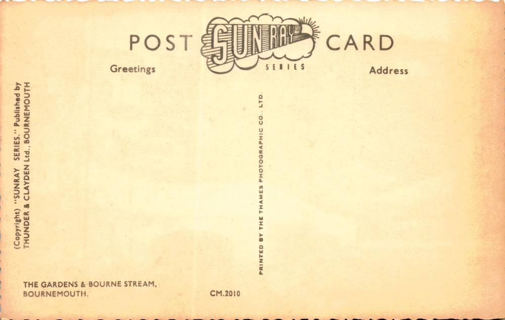 MAKE AN OFFER. THE MORE YOU BUY THE BETTER DEAL I WILL ACCEPT This postcard features a picturesque view of the Gardens and Bourne Stream in Bournemouth. The Gardens in Bournemouth are a popular public park located in the town center, featuring beautifully landscaped green spaces, flower beds, and walking paths. The Bourne Stream is a small river that runs through the Gardens, adding to the natural beauty of the area.