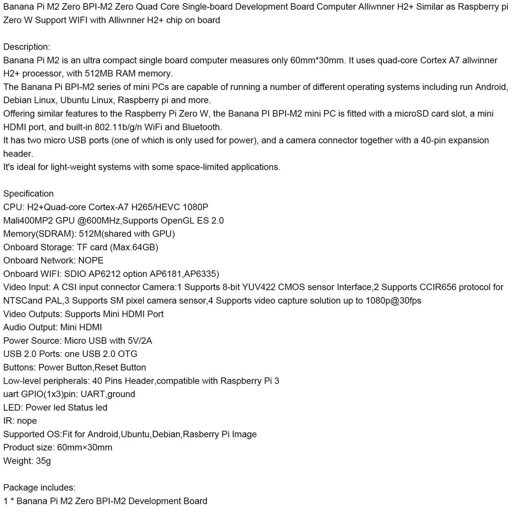 .22 to .50 Laser'Calibrator Laser Calibration Pen Red Laser Pointer Bore Sighter 16.9 USD 17.79 USD Free shipping 5% off For Samsung Galaxy S21 S22 23 Ultra Plus Anti-Spy Privacy Glass Screen Protector 10.78 USD Free shipping Fiber Optic Glock Sights For Models 17 19 22 23 24 26 27 33 34 35 38 39 45 18.8 USD 19.79 USD Free shipping 5% off 24Pcs Gun Cleaning Nylon Picks Tools Kit Rifle Pistol Clean Tool 6 Sets 13.1 USD 13.79 USD Free shipping 5% off Folding Back Up Iron Sight Flip Up Front Rear Set Picatinny Rail KAC300 19.83 USD 20.87 USD Free shipping 5% off 24" Chainsaw Saw Chain 325 pitch .058 gauge 94DL Drive Links Spare Replacement 33.13 USD 34.87 USD Free shipping 5% off DC-DC 12/24V-48V 5A 240W Step Up Car Power Supply Converter Regulator Waterproof 28.3 USD 29.79 USD Free shipping 5% off 25/50/100 Grain Like Gold Tip FACT Arrow Weight Screw Combo 1dz .246 shafts FOC 13.06 USD Free shipping RC3563 Battery Voltage Meter Internal Resistance Voltage Tester Detector 33.92 USD 35.7 USD Free shipping 5% off A/C Retrofit Valve & BPV31 Bullet Piercing Tap-Kit For Refrigerant 15.46 USD Free shipping HT-800 G1 Thread 220V Water Pump Flow Sensor Automatic Control Switch YU 20.7 USD 21.79 USD Free shipping 5% off 70MM Steering Wheel Adapter Plate For Logitech G29 G920 13/14inch Steering Wheel 10.78 USD Free shipping Fuel Shut Off Solenoid For Ford New Holland Tractors 3930 4130 4630 5030 4830 15.0 USD 15.79 USD Free shipping 5% off Reverse Camera Parking Rear View Cams CCD Backup Fit for Toyota RAV4 2009 - 2012 16.79 USD Free shipping Fits For John Deere ATU300 Adapter Holder GPS Receiver Mounting Bracket PF81190 52.78 USD Free shipping Rifle Scope Sunshade Protective Caps Honeycomb Mesh Scope Protector 44/50/56MM 14.87 USD Free shipping A Fantastic Shop Send us a message Our Store Seller Profile Feedbacks Save this seller Contact BPI-M2 Zero Quad Core Development Board Single-board Computer for Banana Pi Banana Pi M2 Zero BPI-M2 Zero Quad Core Single-board Development Board Computer Alliwnner H2+ Similar as Raspberry pi Zero W Support WIFI with Alliwnner H2+ chip on board Description: Banana Pi M2 is an ultra compact single board computer measures only 60mm*30mm. It uses quad-core Cortex A7 allwinner H2+ processor, with 512MB RAM memory. The Banana Pi BPI-M2 series of mini PCs are capable of running a number of different operating systems including run Android, Debian Linux, Ubuntu Linux, Raspberry pi and more. Offering similar features to the Raspberry Pi Zero W, the Banana PI BPI-M2 mini PC is fitted with a microSD card slot, a mini HDMI port, and built-in 802.11b/g/n WiFi and Bluetooth. It has two micro USB ports (one of which is only used for power), and a camera connector together with a 40-pin expansion header. It's ideal for light-weight systems with some space-limited applications. Specification CPU: H2+Quad-core Cortex-A7 H265/HEVC 1080P Mali400MP2 GPU @600MHz,Supports OpenGL ES 2.0 Memory(SDRAM): 512M(shared with GPU) Onboard Storage: TF card (Max.64GB) Onboard Network: NOPE Onboard WIFI: SDIO AP6212 option AP6181,AP6335) Video Input: A CSI input connector Camera:1 Supports 8-bit YUV422 CMOS sensor Interface,2 Supports CCIR656 protocol for NTSCand PAL,3 Supports SM pixel camera sensor,4 Supports video capture solution up to 1080p@30fps Video Outputs: Supports Mini HDMI Port Audio Output: Mini HDMI Power Source: Micro USB with 5V/2A USB 2.0 Ports: one USB 2.0 OTG Buttons: Power Button,Reset Button Low-level peripherals: 40 Pins Header,compatible with Raspberry Pi 3 uart GPIO(1x3)pin: UART,ground LED: Power led Status led IR: nope Supported OS:Fit for Android,Ubuntu,Debian,Rasberry Pi Image Product size: 60mm×30mm Weight: 35g Package includes: 1 * Banana Pi M2 Zero BPI-M2 Development Board About US About Our Items We strive to describe all items accurately and thoroughly, with the utmost care and attention to detail. However, to ensure a mutually satisfactory transaction, we kindly ask for your assistance in thoroughly reviewing the item description and photos, and addressing any questions before placing a bid. Customer Satisfaction We stand behind our commitment with exceptional service, a 100% money-back guarantee, and a dedication to customer satisfaction. I am readily available to address any inquiries or concerns you may have, both before and after your purchase. Our aim is to ensure your shopping experience is enjoyable and that you're delighted with your purchase. Feedback Your feedback is crucial to our business's success. If you're satisfied with your purchase and the service you received, we would greatly appreciate your positive feedback, along with an overall Detailed Selling Rating (DSR) of 5. Please take a moment to leave us positive feedback. Our eBay account is set up to automatically reciprocate positive feedback once yours is received. If you're considering leaving neutral/negative feedback or opening an eBay/PayPal case, we encourage you to reach out to us immediately. We're committed to resolving any issues to the best of our ability. Shipping Parcel will be shipped using Standard shipping method. For security purposes, items will be shipped exclusively to the confirmed address on Paypal. Please ensure your Shipping address is up to date before proceeding with payment. Estimated delivery time within the United States ranges from 3 to 10 business days, depending on your location. Returns We accept returns within 60 days from the date the buyer receives the item. If the item is found to be defective upon receipt, the customer has up to 30 days from the date of receipt to request an exchange for a new item or a refund. For returns due to a change of mind, we accept items in their original selling condition. However, if the package has been opened due to a mistaken order, it does not qualify for our return policy. Please note that the buyer is responsible for covering the cost of return postage. If you encounter any issues, please reach out to us via eBay message, an
