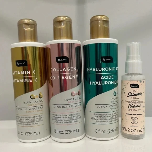 BRAND NEW Unused/unopened Full set of 3 lotions Collagen Helps skin appear firmer and hydrated Revitalizing Hyaluronic Acid Helps skin appear smoother and softer Hydration Vitamin C Helps skin appear more radiant Hydration Illuminating Hair shimmer spray Spray onto dry hair Infused with keratin
