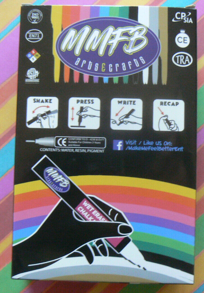 10 Liquid Chalk Erasable Markers From MMFB Arts & Crafts BRAND NEW IN BOX, still-sealed Reversible tips 3mm-5mm Colors are shown in photo of the side of the box (second photo) You won't be disappointed! I have recently obtained LOTS of acrylic markers and liquid chalk markers. Check them out! I have many books and lots of other items. Please take a look; I'm happy to combine shipping . ~~~~~~~~~~~~~~ Please take a look at my other listings; I'm listing many school books (and others) and am happy to combine shipping. All items coming from a smoke-free, pet-free home! Thanks so much for your time! Before leaving your feedback, if for any reason you feel I did not deserve or earn 5 stars in each category, please let me have the opportunity to make it right. I want every transaction to be 5-star worthy! Thanks so much! :)