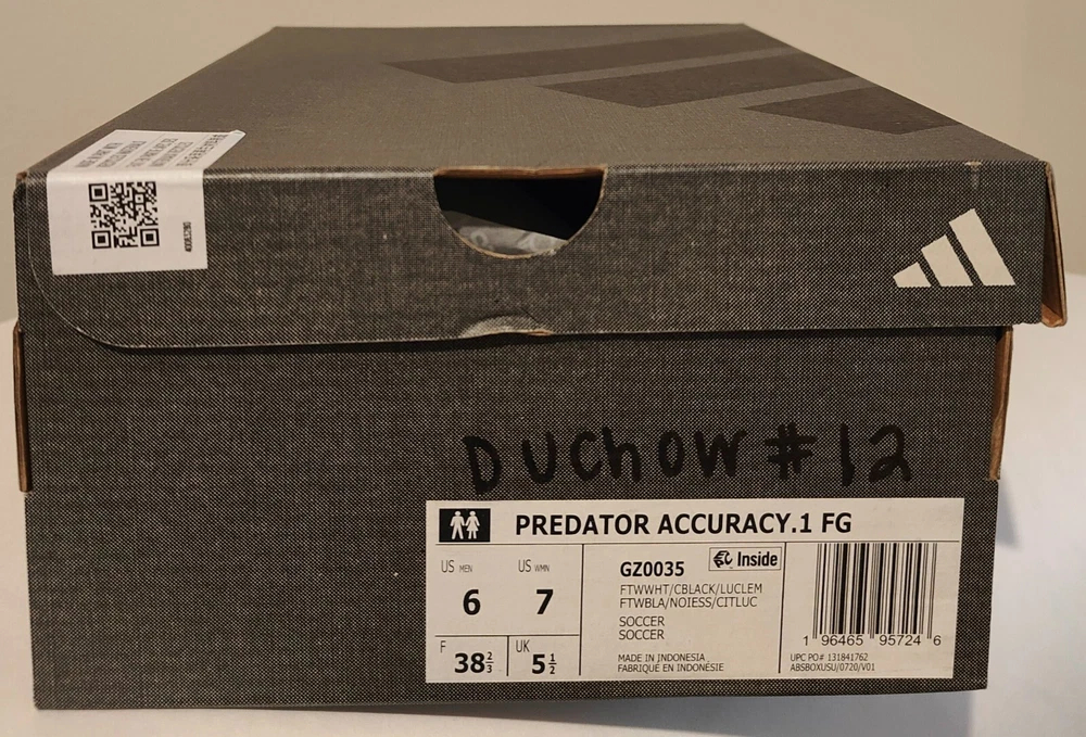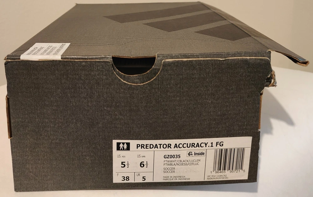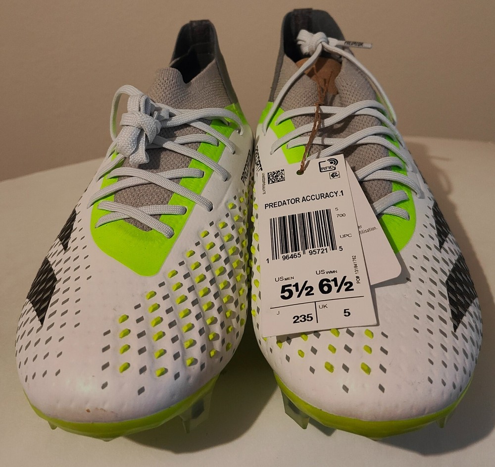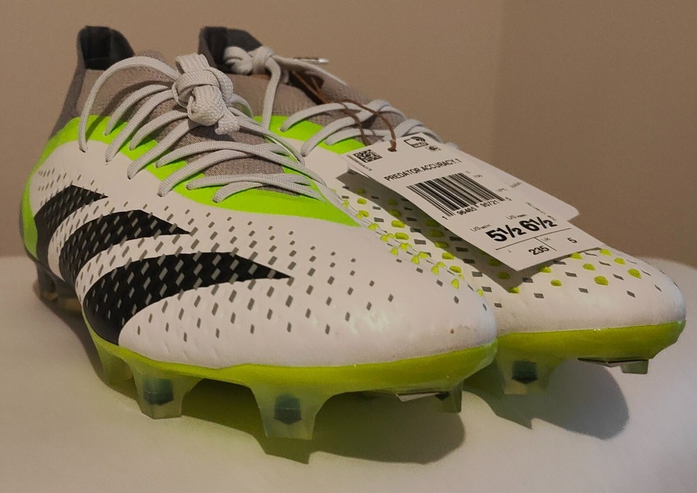 Important - Store closing on 9/29/2025, all listings will go out of stock on 9/30/2025. The product is a brand new pair of Adidas Predator Accuracy.1 FG soccer shoes in size 5, 5.5, or 9. These unisex shoes feature a green and white color scheme, with a style code of GZ0035. Designed for soccer players, they offer comfort and are part of the Adidas Predator product line, known for their performance on the field. With a focus on accuracy and control, these athletic sneakers are perfect for sports enthusiasts looking for quality footwear.