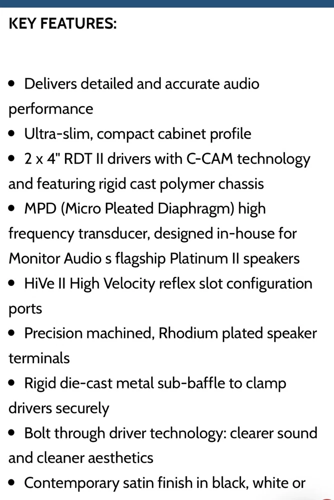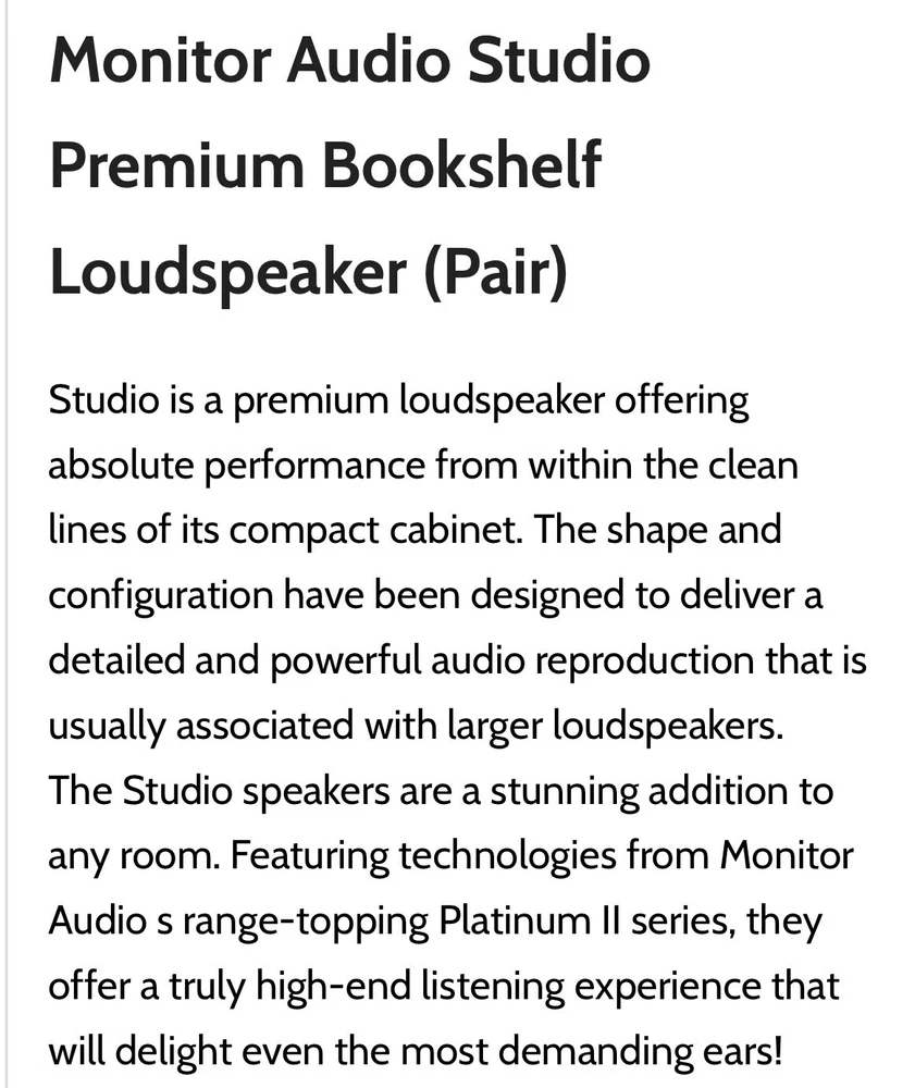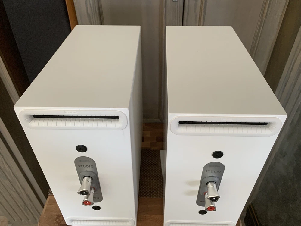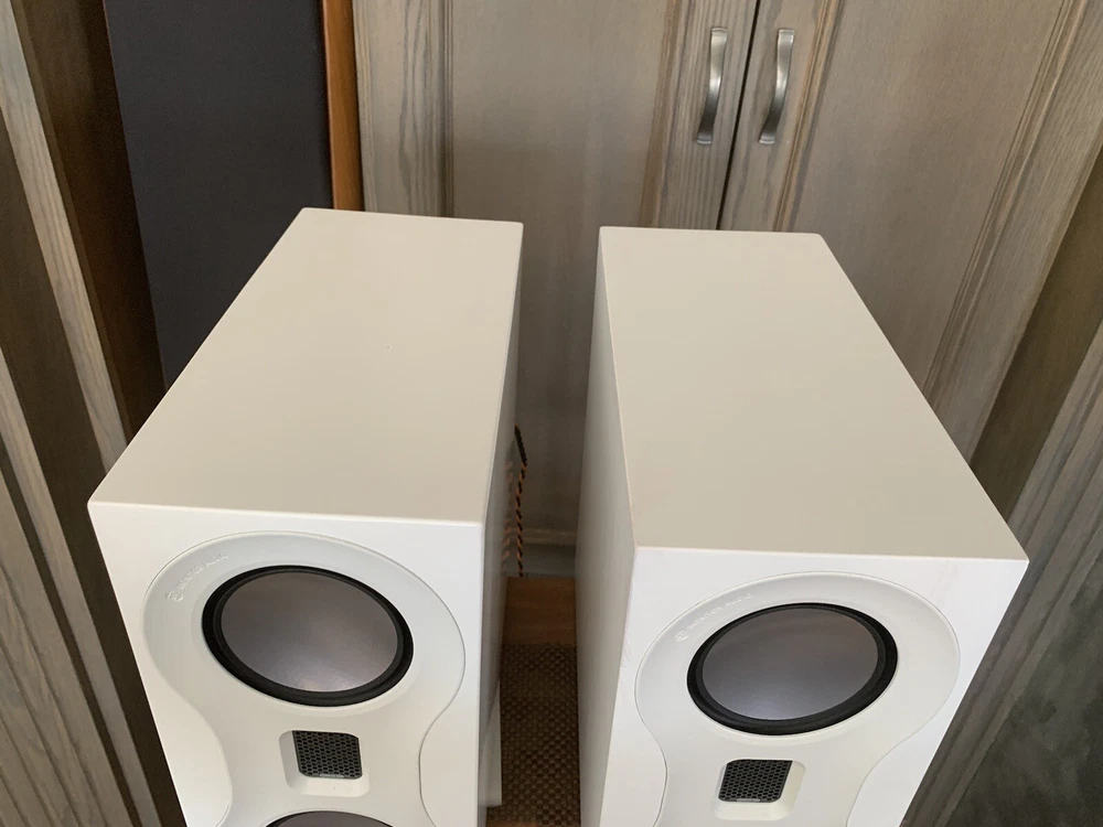 Elevate your home audio experience with these brand new, factory-sealed Monitor Audio Studio bookshelf speakers in elegant satin white. Designed to deliver high-quality sound, these speakers are a tremendous value at clearance price. These speakers feature banana jack audio inputs and wired connectivity for a seamless and stable connection. With an impressive 100W RMS power and 4 ohms impedance, they deliver a powerful and immersive audio experience. The Monitor Audio Studio speakers are perfect for audiophiles who demand high-quality sound and sleek aesthetics in their home audio system.