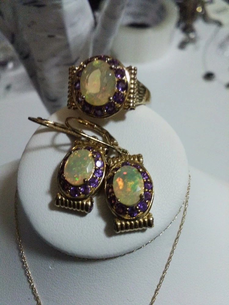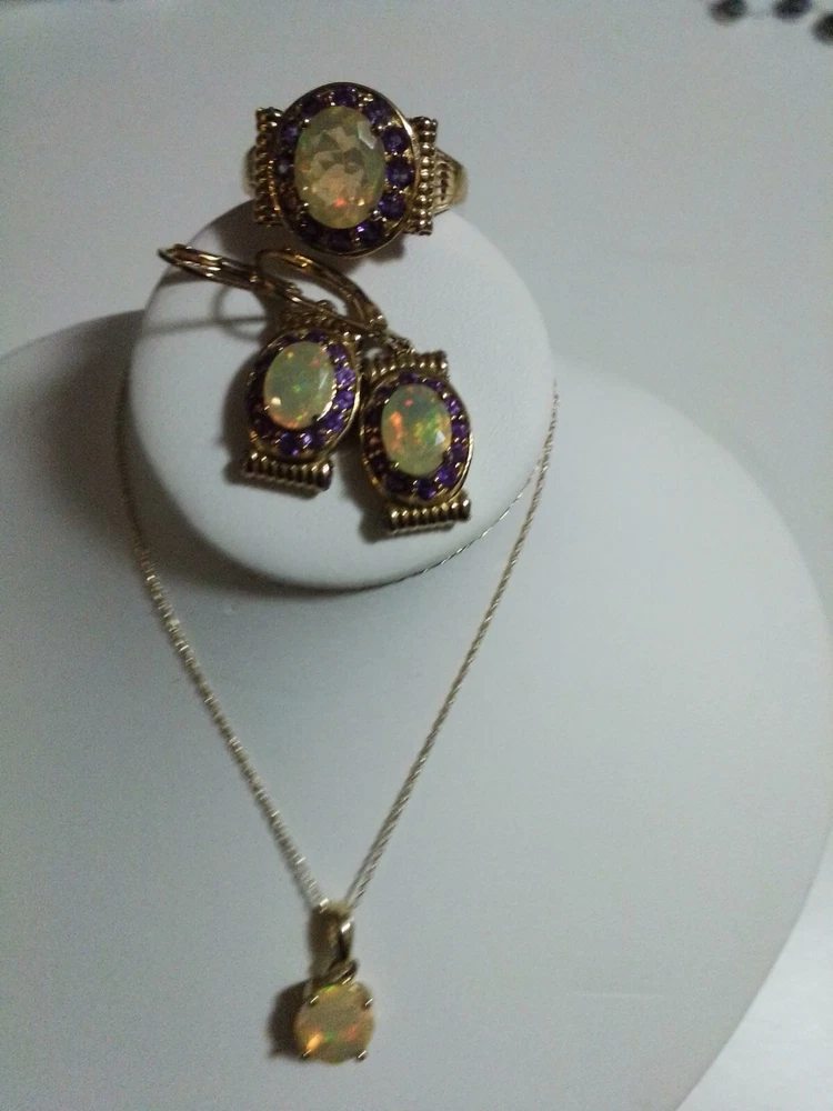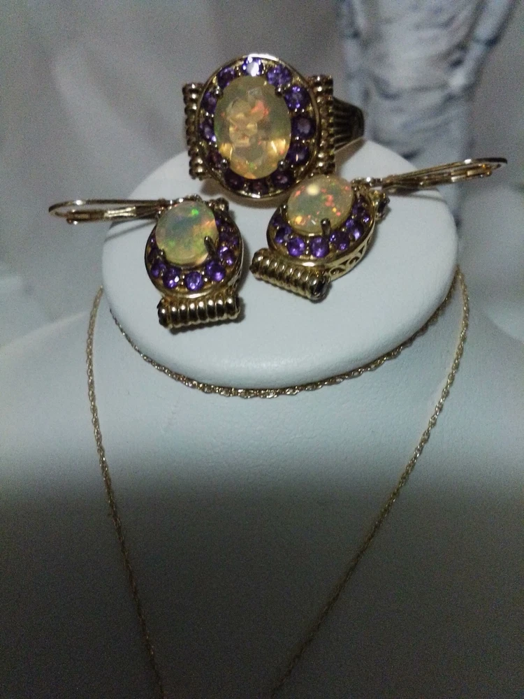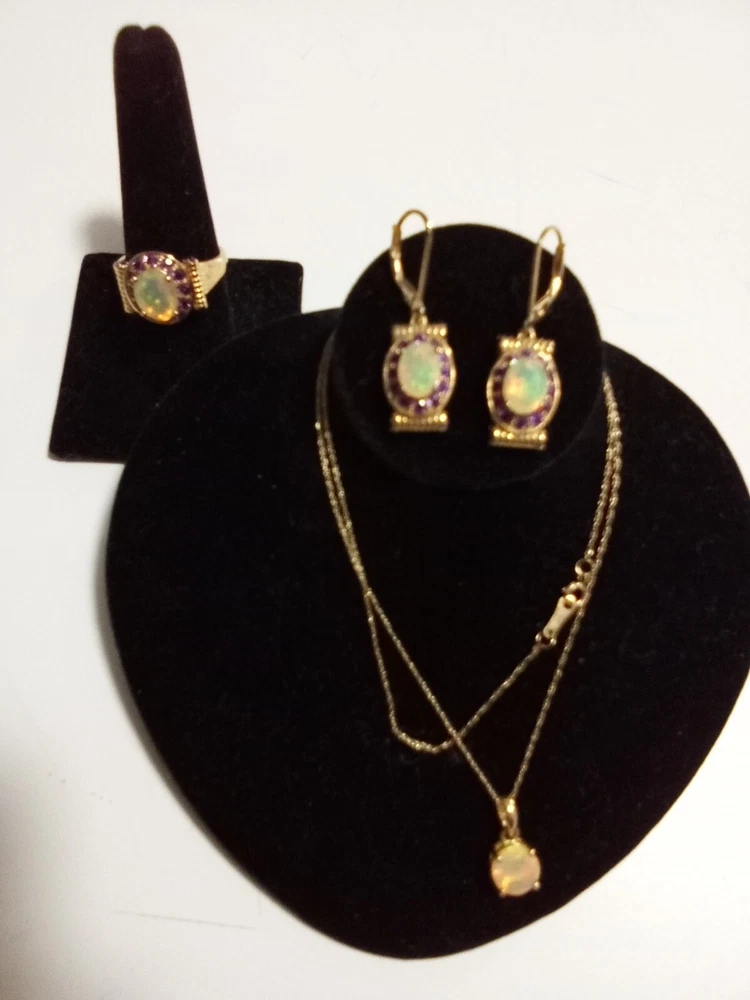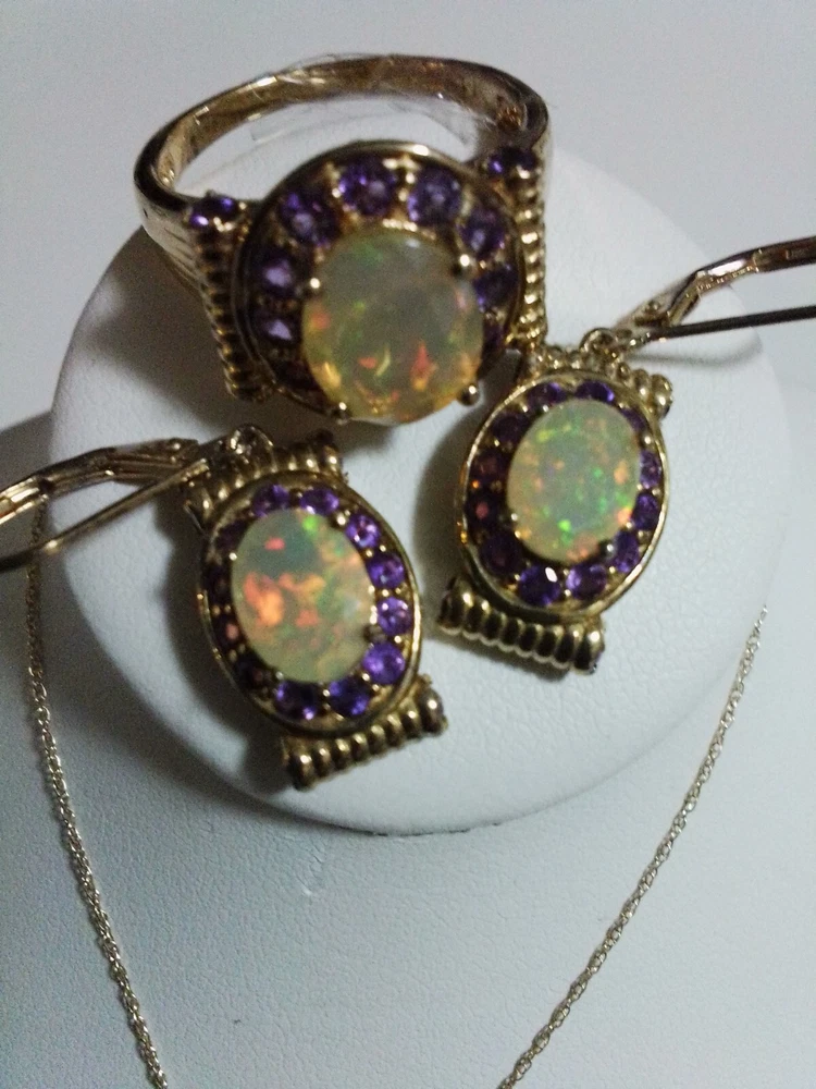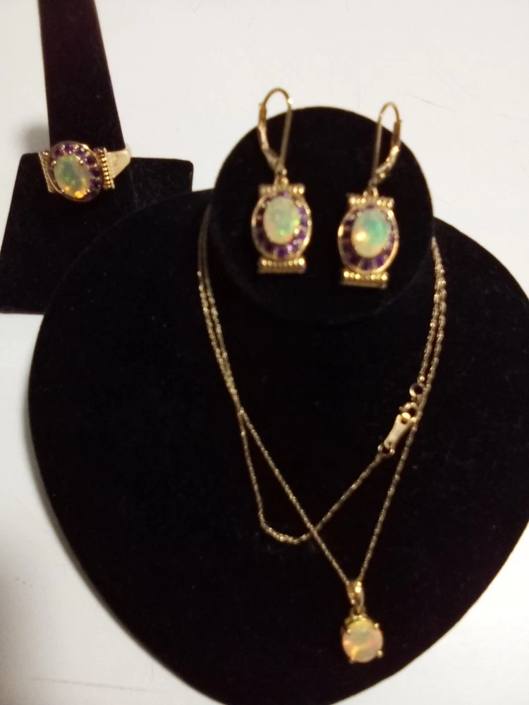 Customized: No Main Stone Treatment: none Main Stone Shape: Oval Wholesale: No Vintage: No Antique: No Brand: Unbranded Handmade: No Set Includes: Earrings, Necklace, Pendant, Ring Personalize: No Country of Origin: Thailand Main Stone Width: 0.9 mm Signed: No Main Stone Creation: Natural Metal Purity: 14k Ring Size: 9.5 Main Stone Length: 0.9 mm Number of Gemstones: 40 Type: Jewelry Set Main Stone Color: Multicolor Metal: 14K GOLD NECKLACE/PENDANT, STERLING SILVER/GOLD EARRINGS,RING Color: WELO OPALS Main Stone: AFRICAN WELO OPALS Base Metal: Gold Country/Region of Manufacture: Thailand Occasion: all Secondary Stone: Amethyst