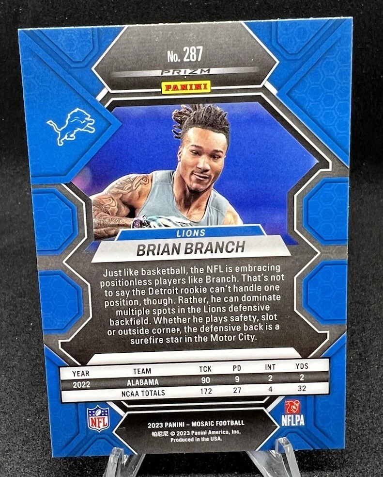 This trading card features Brian Branch, a rookie player from the Mosaic Football Green Prizm Rookie Lions set. The card measures 3½" x 2½" and is an original, not a licensed reprint. It is in excellent shape, near mint or better, and has not been graded. The card number is unspecified, but it is a sports trading card with features such as the player's name, team, and season. The card is perfect for collectors who appreciate football and sports trading cards. It is a great addition to any collection and would make a fantastic gift for a fan of Brian Branch or the Lions. The autographed feature is not included, but the card is an excellent representation of the player's talent and potential.