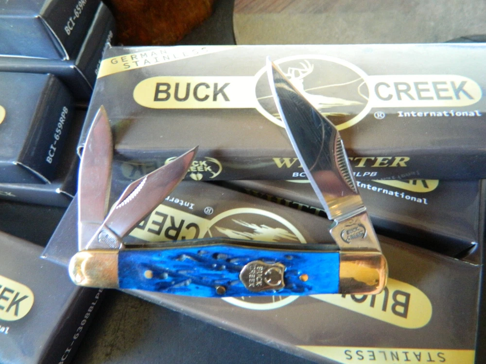 WE HAVE (6) WHITTLER 3 1/2" DARK BLUE JIGGED BONE HANDLES, some say it looks like a Coke Bottle design call it what you like. One thing that sticks out to me is it has two Clip Point Blades and one Spear Point or Pen, the large clip point is 2 1/2" with a 2 1/4" edge the small one 1 1/2" with 1 1/4" edge, and the Spear Point is the same 1 1/2" 1 1/4" This is the Limited Edition part of this knife along with the handle design both sides of the handle come to a point. Most Whittlers only have one side of the handle pointed, the bottom. BUCK CREEK CUTLERY of SOLINGEN GERMANY, LIMITED EDITION 3 1/2" CLOSED WHITTLER DESIGN POCKET KNIFE WITH A BLUE PICK BONE HANDLE, almost all companies have stopped making this design it's too costly and hard to get the Bone right. But the smaller companies like BUCK CREEK have the time and money to do this and do it right, they put two Clip Point style Blades and a Pen or Spear point blade on this handle made of 440HC Stainless steel (Rc) 56 to 58 hardness, Nickel Silver Bolsters, and Brass Pins and Liners. And the Back Springs are slammers so please be careful, and they put their Logo on an brass shield embed in the bone. Model # BC 6308BLPB Weighs 2.2oz. Buck Creek is in Solingen Germany, 39 years now in FEB. these are collectors grade knives We will give you $$$$$$$$$$$$$$$$$$$$$$ FREE SHIPPING $$$$$$$$$$$$$$$$$$$ WE THANK YOU AND GOD BLESS YOU. by adding my eBay Store to your Favorites, . - Sign up and receive our emails, why SALES that is the only email we will ever send to you. We are always trying to get different knives into your hands, so by saving you some money maybe you will try out a new brand. Plus every listing we have is put on sale from the highest to the lowest priced items, and lastly many times we put knives that there are only 1 or 2 left in our stock by receiving our email you will get first shot at these items, Thank you Greg