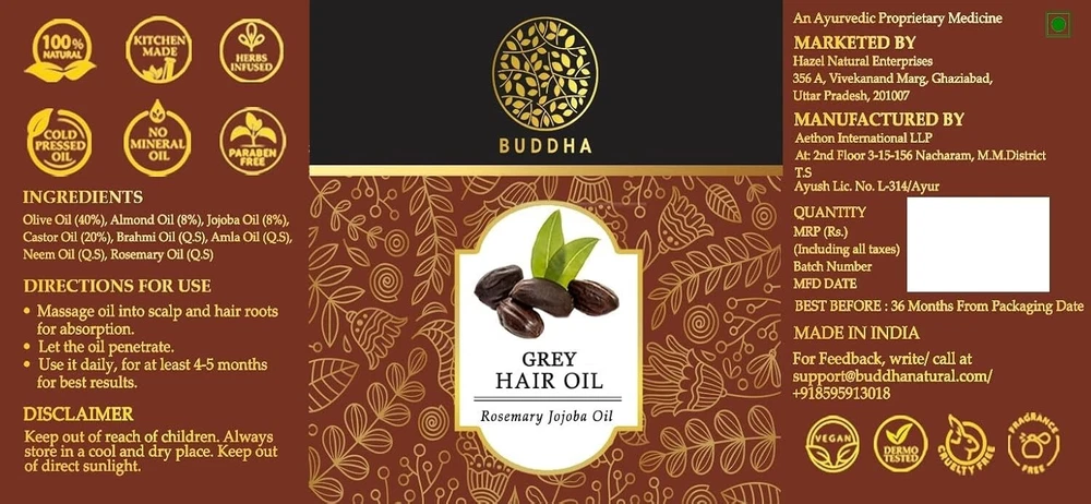 Important information Safety Information: Product is all-Natural and Safe to Use Ingredients: olive oil, almond oil, jojoba oil, castor oil, Brahmi oil, amla oil, neem oil, and rosemary oil. Directions: One can also apply 45 minutes before a head wash. Massage repeating 4 sides - center to side on your head followed by 2 upward side. Massage well till the oil is fully absorbed into the scalp and hair. It is the best ayurvedic oil for dandruff. From the brand Previous page BUDDHA NATURAL Buddha Naturals is a luxury authentic beauty care brand with foundations in Ayurveda. Being a pioneer since 1994, Buddha Naturals has become the epitome of Natural Beauty that combines ancient Ayurvedic practices with Modern Science suiting a more holistic and aesthetic approach to self-care with sensorial experience and pleasure in usage. New Launch Next page Product Description BUDDHA NATURAL Grey Oil - Restores Natural Hair Color Buddha Natural, a trusted name for over 25 years, is your beacon of authenticity in providing natural and effective products. With a rich legacy of serving mindful wellness, our commitment to genuine, time-tested formulations remains unwavering, Embrace the authenticity of Buddha Natural. Why You Should Choose Us 100 % Natural Ingredients We harness the power of plants as a part of our commitment to using naturally effective and sustainably sourced herbs to offer specific benefits. 100 % Ayurvedic Our products are 100 % natural and inspired by Ayurveda recipes by the ministry of AYUSH. We conform to the highest quality of control levels. Clean Green Ethical Brand An award-winning brand that is proudly known for being clean, green and ethical though its Anti Carbon and plastic-neutral initiatives. Made In India Our ingredients are sourced from beautiful locations all around the country, where they are known to be in their most natural and effective form. Goodness of Grey Oil Helps to Reduce Greys Buddha Natural Oils are premium and authentic. Regularly massaging the oil into your scalp will help reduce greys and will nourish your scalp. Restores Natural Hair Color Buddha Natural Grey Oil is very effective for reducing greys and in enhancing hair wellness. It includes natural ingredients that helps to nourish both the scalp and hair roots. Why You Should Buy