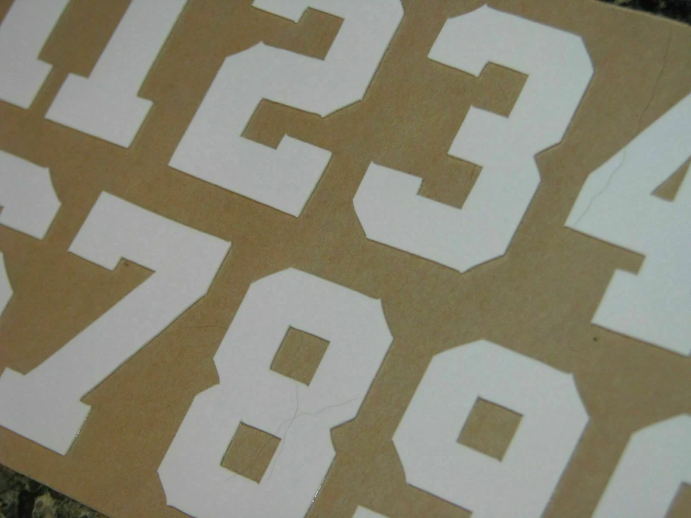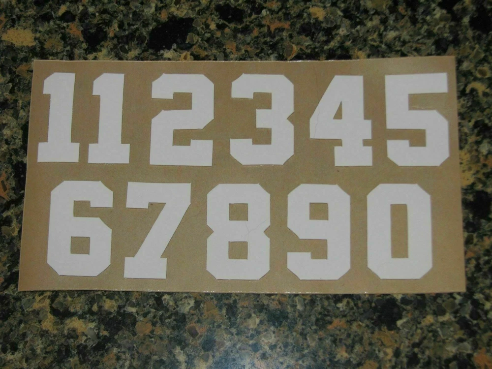 Hello. For your consideration are the pictured helmet decals. You will receive the following: (1) Sheet of Numbers 0-9 Clear and White 1 1/2" H 20mil These numbers are made of THICK 20MIL high quality glossy vinyl. Great for customizing FULL SIZE helmets! Free shipping anywhere in the US! Thanks for looking! Note: In order to offer the lowest possible item pricing, tracking is not offered with the "free shipping". I do not offer expedited shipping. Buyer is agreeing to the S&H terms detailed in the listing. If you do not receive your item within the listing's specified S&H terms, please contact Seller prior to opening a case and/or leaving negative feedback. Seller will resolve the issue within a reasonable amount of time. Thanks!