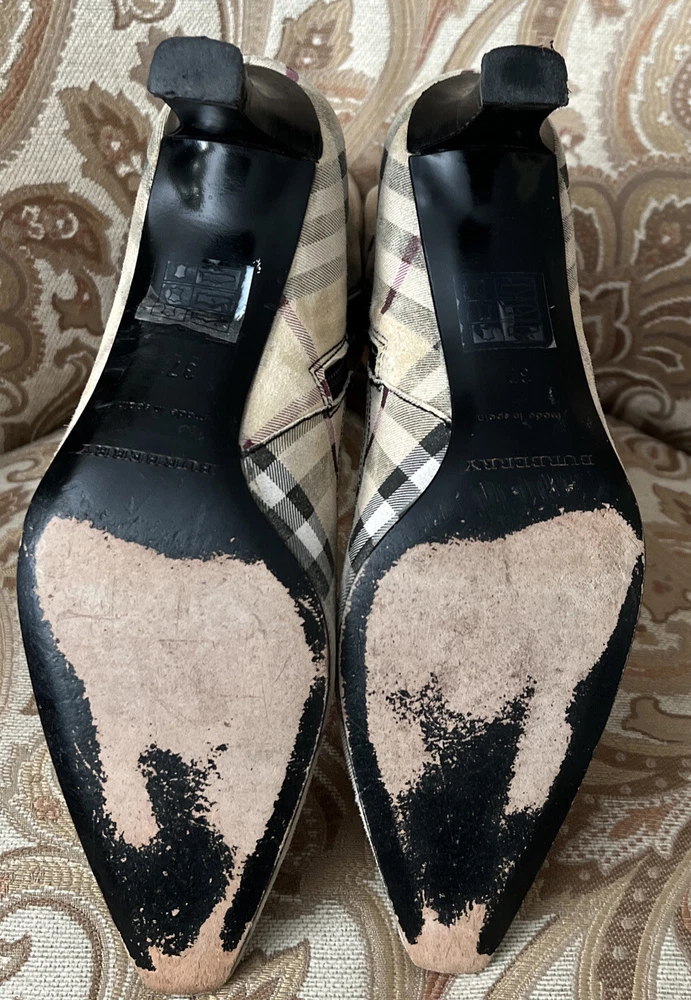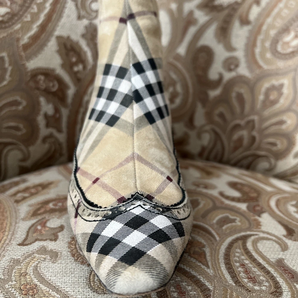 RARE BURBERRY Nova Check Suede, Kitten Heeled Boots Womans Size 37, US Size. These gently loved Burberry house check boots are from our personal collection and smoke free home. Zippers in perfect condition. Soles have a little wear. Burberry nova check suede exterior and leather interior. Kitten heals and cute detailing! Size 37 = US size 7 runs narrow and runs small. Please see photos as they are part of the description.