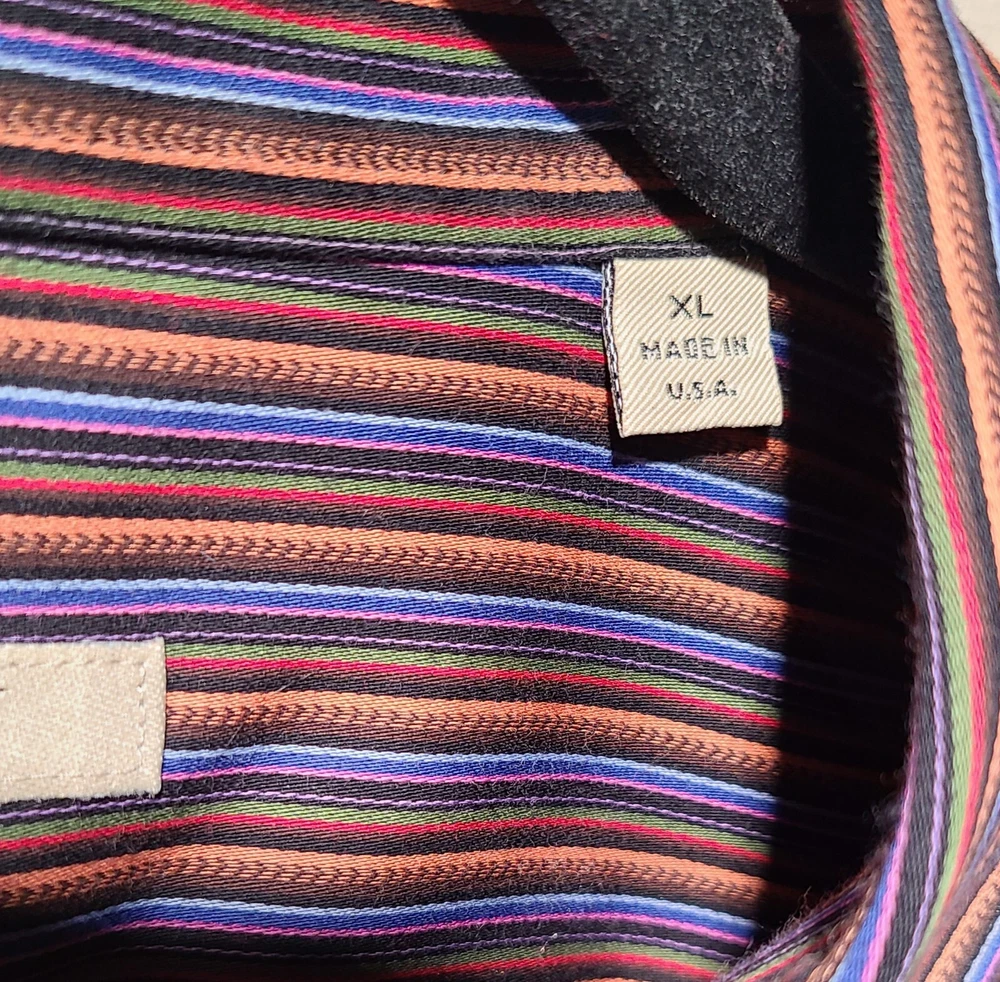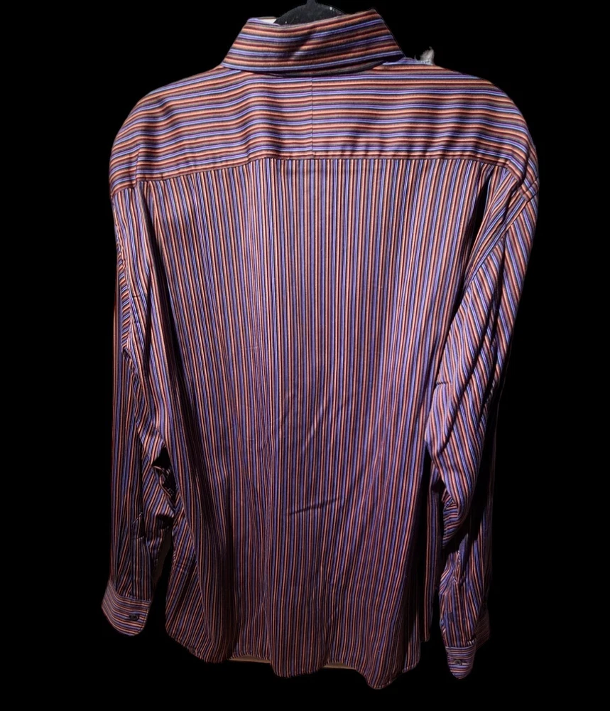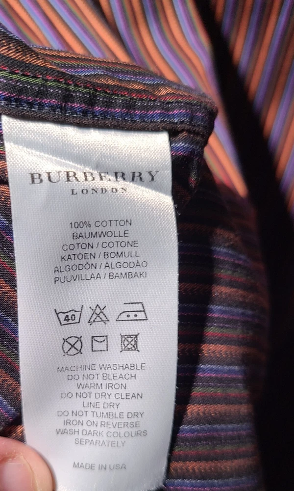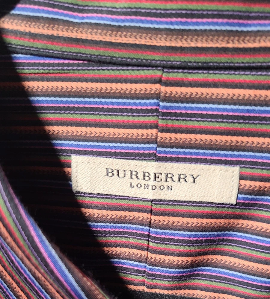 Elevate your style with this classic button-front shirt from BURBERRY of LONDON. This vintage shirt features a multicolor striped pattern that adds a touch of sophistication to your wardrobe. The collared neckline and long sleeve design makes it perfect for any occasion, whether it's a formal event or a casual day out. Crafted from a comfortable cotton blend material, this shirt is machine washable for easy care. The shirt is accented with buttons and has a classic fit for a timeless appeal. Available in XL size, this dress shirt is an ideal addition to any man's workwear or activewear collection.
