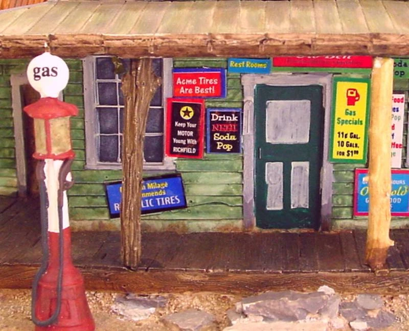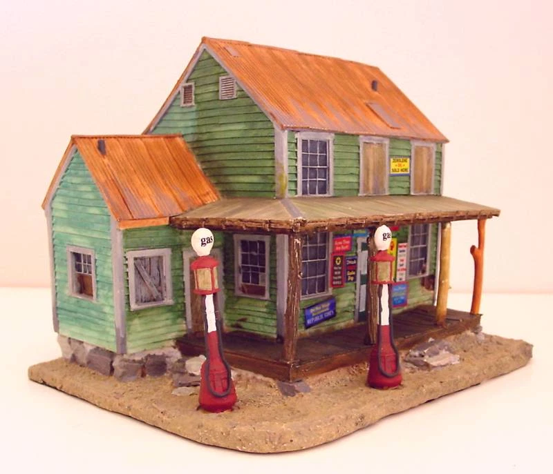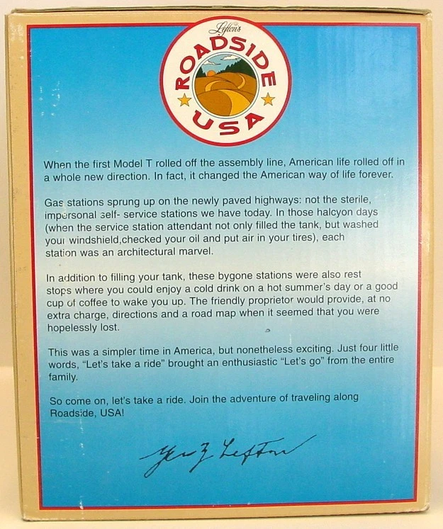 Butch's Old Gold Gas Station - Circa 1913 - Findlay, Ohio From the Limited Edition Roadside USA Collection by Lefton . Item #08609. Also part of the Lefton's Roadside USA - Service With a Smile: America's Gas Stations collection. Copyright Geo Zoltan Lefton Co. and GT Notions Resin. Made in China . Dated: 1994 on box Size: 7" tall x 8.5" wide x 6.5" deep (close to O scale?) Not a 'kit' - a 1 piece building. Condition: Resin. Never used, never displayed, no chips, no defects, no crazing. PLEASE NOTE; The gas pumps are packed separately and use a drop of glue to hold in place. I'm sure you will put them in a little straighter than I did on my display. Your valuable collectible is well packed, protected and in great shape. This item comes in original box with very minor wear from being in a retail storeroom warehouse - still great for gift-giving! From the box: "When the first model T rolled off the assembly line, American life rolled off in a whole new direction. In fact, it changed the American way of life forever. Gas stations sprung up on the newly paved highways: not the sterile, impersonal self-service station we have today. In those halcyon days (when the service station attendant not only filled the tank, but washed your windshield, checked your oil and put air in your tires), each station was an architectural marvel. In addition to filling your tank, these bygone stations were also rest stops where you could enjoy a cold drink on a hot summer's day or a good cup of coffee to wake you up. The friendly proprietor would provide, at no extra charge, directions and a road map when it seemed that you were hopelessly lost. This was a simpler time in America, but nonetheless exciting. Just four little words, "Let's take a ride," brought an enthusiastic "Let's go!" from the entire family. So come on, let's take a ride. Join the adventure of traveling along Roadside, USA!" This general store has all the charm and nostalgia of your friendly neighborhood one-stop shop. Based on an actual business in Findlay, Ohio, around 1913, this store has a beautiful rustic image, from the deep green wooden siding to the rusty tin roof. The store is two stories with a wide wooden awning over the porch. Signs to either side of the door beckon to passing motorists and pedestrians: "OPEN 24 HOURS OLD GOLD GOOD FOOD & GAS - REST ROOMS - OLD MAN MILAGE RECOMMENDS REPUBLIC TIRES - GOOD FOOD/CANDIES/SODA POP/FEED/SNUFF/HOT COFFEE/FUDGE/BAIT", just to name a few. Two red gas pumps wait outside, with brilliant white globes on top. From the rough timbers holding up the awning to the big stone foundation, from the weathered look of the wooden siding to the crooked signs, this rustic general store and gas station has incredible detail and heartwarming charm. Check out my other listings for more from this fantastic Limited Edition line, as well as Lefton's Diners, Spectacular Vernaculars, Big Boy, and Kentucky Fried Chicken restaurants. Combine shipping on several items and save money! Check out my other listings for a variety of 50’s Diner & Soda Fountain Decor and Necessities – Rock ‘n’ Roll – TV & Music Memorabilia – American Roadside Salt & Pepper Shakers – Advertising Signs – Beatles – Elvis – Pink Flamingos – Betty Boop Gnomes - Victorian and Garden Accessories - Pinball and Jukebox Parts Many items are new in the box and perfect for gift-giving! Most are out of production and very collectible!
