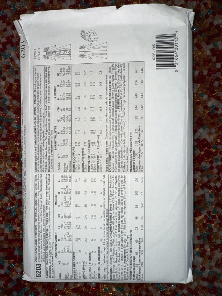 Butterick 6203 is a costume pattern designed for a mother and daughter Renaissance ensemble. The pattern includes all sizes, making it a versatile option for crafting your own family's costumes. The brand is Butterick, which is known for its quality sewing patterns. This pattern is perfect for those interested in sewing and costumes, and it can be used for various occasions such as Halloween, themed events, or even as a fun project for a sewing class. The pattern is made in the United States, ensuring a high-quality product.
