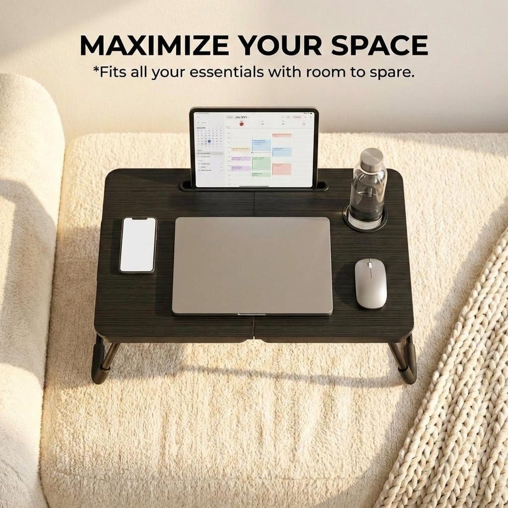 Free eBay listing template designed by dewiso.com BUYIFY Foldable Laptop Bed Desk for Couch, Sofa - Large Lap Desk Tray Table with Cup Holder and Tablet Slot - Portable Notebook Stand for Eating, Writing, Studying and WFH (Black)- USA Original Patent FREE AND FAST SHIPPING! About this item PRE-ASSEMBLED and COLLAPSIBLE: Zero installation needed—unfold and go. Engineered for compact living, this lap table folds flat instantly, offering a hideaway storage solution behind doors or under furniture. INTEGRATED DEVICE STAND and DRINK DOCK: Designed with a stable beverage recess to avoid spills and a secure groove to dock your tablet or phone. Enjoy hands-free entertainment or video conferences without devices slipping. MULTI-USE BED DESK: A flexible platform for remote work, studying, or dining in bed. Ideal for users with limited mobility or those requiring bed rest. GENEROUS TABLETOP DIMENSIONS: The extra-wide surface easily holds 17" laptops with room to spare for a mouse and snacks. The ergonomic curved front ensures body comfort while sitting cross-legged on the floor or sofa. COMPACT and TRAVEL-FRIENDLY: Supported by non-slip legs for stability on soft surfaces like carpets. Its lightweight build makes it easy to transport indoors or outdoors for reading, sketching, or leisure activities. Product We offer a 30-Day Return Policy on items which you are not completely satisfied with. You have the option for a full-refund or an exchange of the item. No returns are available on items shipped outside of the US . Shipping We offer Free Shipping to the US and ship within 2 business days of payment, usually sooner. We use UPS express shipping. That's why your products are usually delivered within 3 days . Contact We try our very best to make sure every customer is completely satisfied. If there's a problem , message us! We're happy to help. 24/7 live chat available.