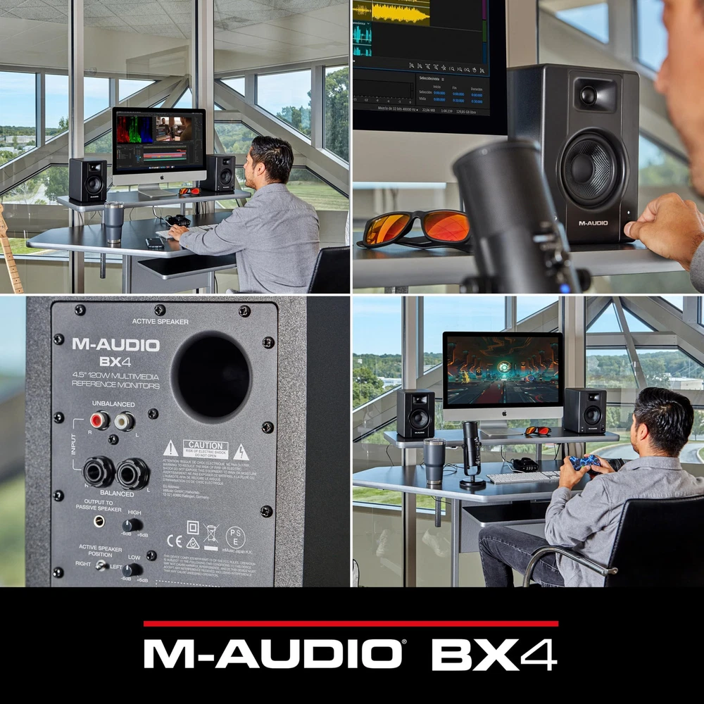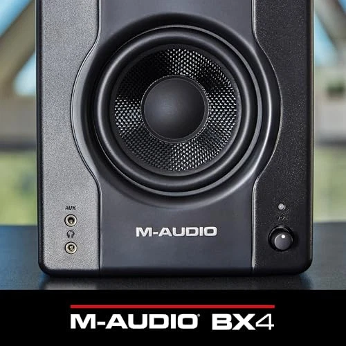 Upgrade Your Desktop Speaker Sound With BX4’s Studio Monitor Quality Are you unhappy with the sound quality of your built-in computer speakers? The BX4 speakers are the perfect choice! Compact, attractive and simple-to-install, ’s BX4 desktop speakers have been meticulously created for you to experience your media like never before! Immersive Listening Experience Designed for live streaming, podcasting, gaming, watching movies or listening to your favorite music, ’s BX4 speakers provide and impressive 120 Watts of crystal-clear sound inside an attractive, style-driven design. The two-way desktop speaker design features an Acoustically-inert MDF cabinet with bass reflex that facilitates a smooth low end and punch through the Kevlar® low frequency drivers. Plus, the enhanced rear ports add extended low-frequency response making any videogame, movie or song you play a truly immersive experience. Add to this, the computer-optimized natural silk dome tweeters for a crystal clear high-end and precise stereo image, and the BX4 delivers pristine sound quality perfect for any multimedia application. Perfect Connections The rear panel connections offer 1/4”, 1/8”, and RCA inputs making them compatible with all your gear. There is even an 1/8-inch aux input and headphone connection on the front of the speaker for your tablet, computer, or mobile device. What’s In The Box BX4 Speakers (Stereo Pair: 1 Passive Speaker and 1 Active Speaker) Foam Feet 2-Prong IEC Power Cable 1/8” TS Speaker Interconnect Cable 1/8” to 1/8” TRS Aux Cable 1/8” TRS to RCA Cable User Guide Safety & Warranty Manual. Desktop Computer Speakers With Studio Monitor Sound - 120-Watt powered speakers deliver studio speaker sound, perfect for gaming, podcasting, streaming, DJ performances and more Premium Components – Studio Speakers with an Acoustically-inert MDF cabinet and bass reflex design for deep, rich sound; 4.5” Kevlar low frequency drivers and 1” natural silk dome tweeters An Immersive Listening Experience - Computer-optimized tweeter waveguide for precise imaging; High & Low EQ for dialling in the perfect sound; Rear ports for extended bass response Versatile – Whether you’re looking for gaming speakers, DJ speakers, PC speakers, record player speakers or studio speakers, the BX4’s 1/4”, 1/8”and RCA inputs offer complete hook-up flexibility Everything You Need - Includes 1 passive speaker, 1 active speaker, 1/8” speaker cable, 1/8” to 1/8” cable, 1/8” to RCA cable, and AKAI Professional's MPC Beats